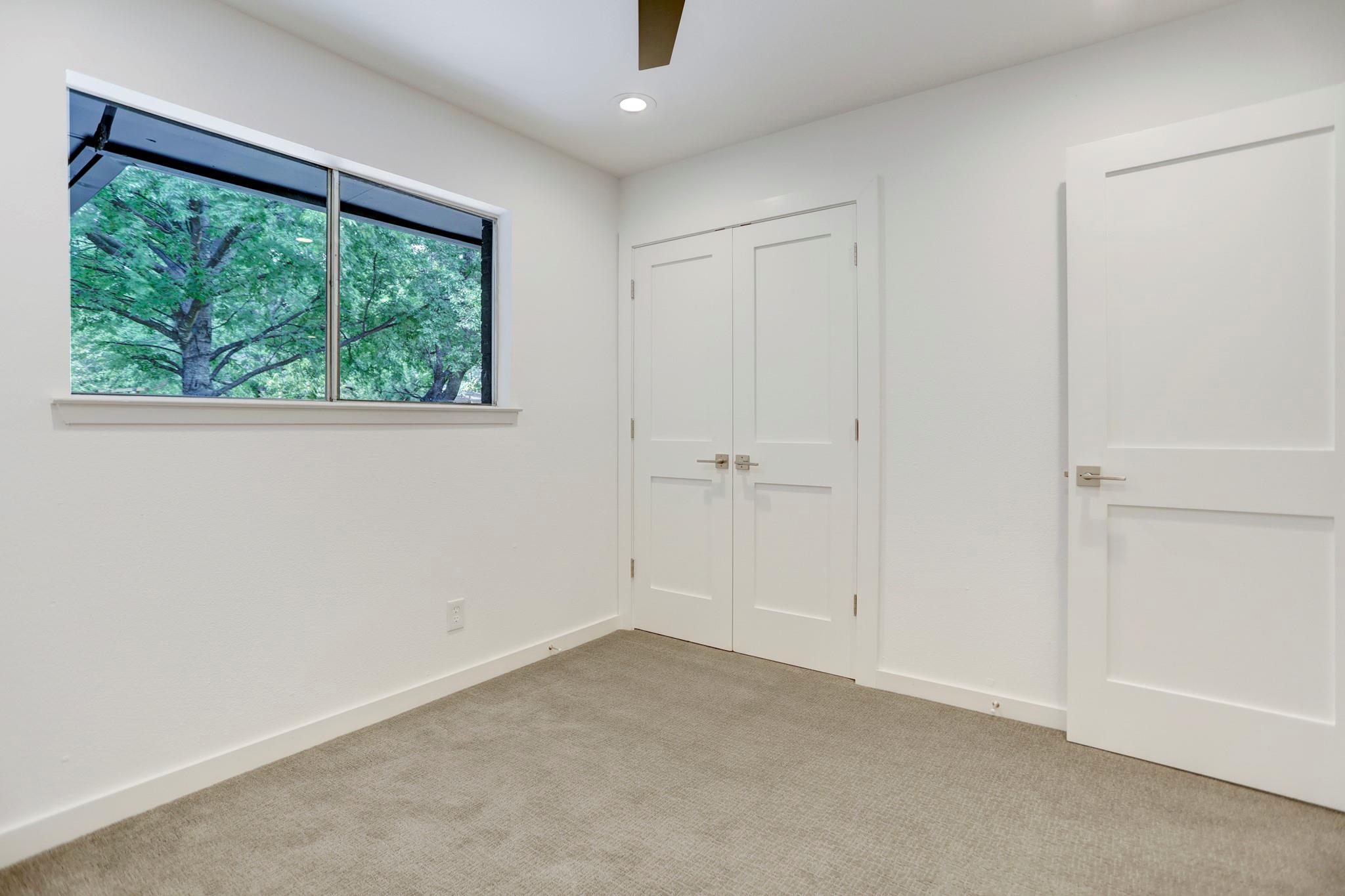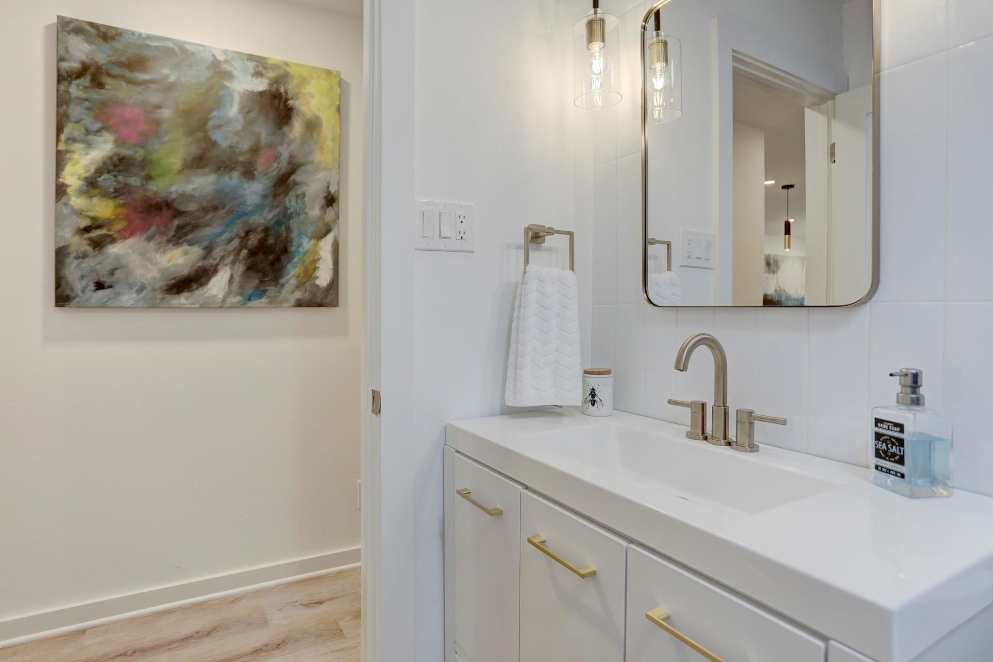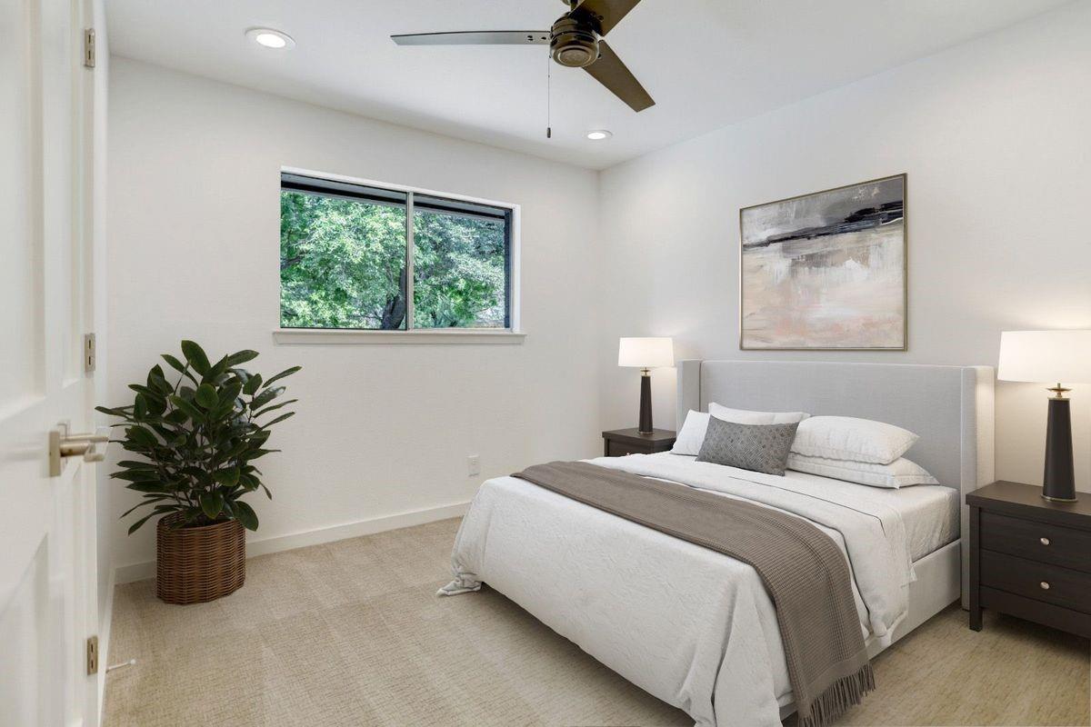 Both bathrooms showcase modern black and gold finishes, warm wood accents, custom tilework, and skylights that enhance the light and airy vibe. The primary suite includes a dual-sink vanity, a walk-in shower with floor-to-ceiling tile, a modern ceiling fan, and two generous closet spaces. The secondary bedrooms feature similar upgrades and share a striking full bath with designer details.