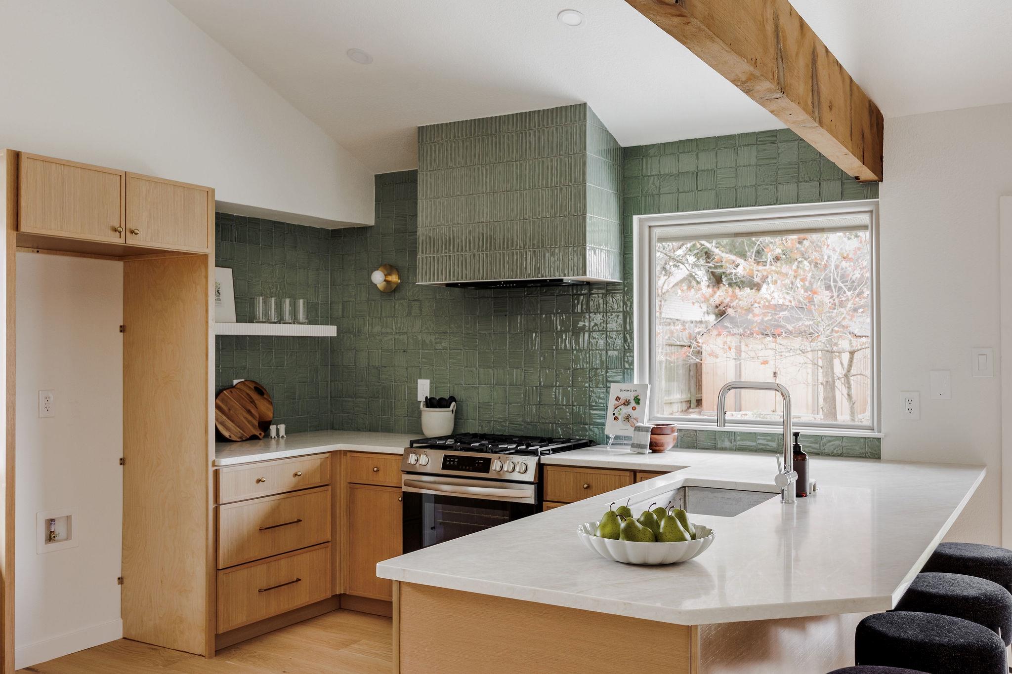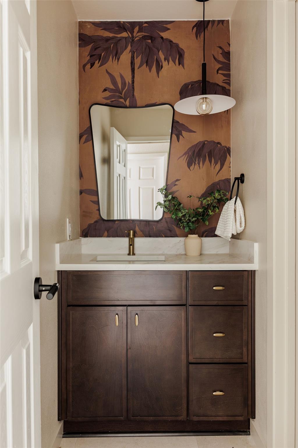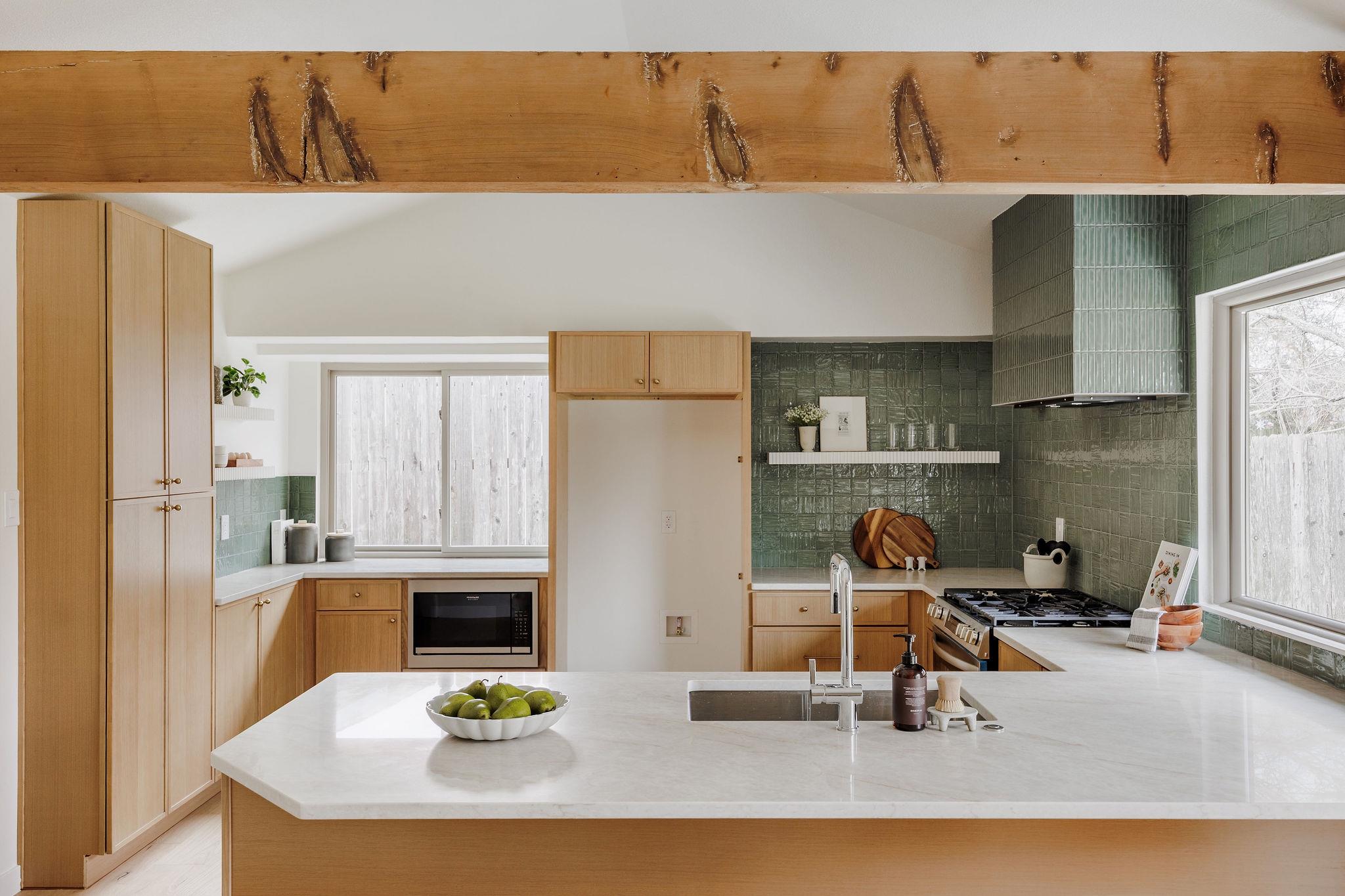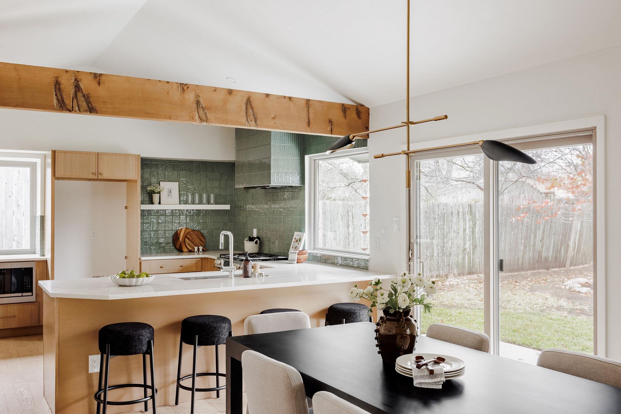 | OPEN HOUSE SAT & SUN 1-4 pm | Designer remodel with a stunning blend of Organic modern and Mid-century modern influences. Open-concept floor plan with high vaulted ceilings, 7-inch White Oak flooring, and designer lighting throughout. A full-height Texas limestone fireplace anchors the open concept living room. Entertainer's kitchen w/ Coffee bar and Backyard views, featuring Taj Quartz countertops, White Oak slim shaker cabinets, custom tiled range hood, and a curated selection of brass and chrome finishes. The primary bedroom offers incredible natural light and features a walk-in closet with custom cabinetry. The spa-like en-suite is a showstopper, featuring a floating white oak vanity, quartz countertops, and a unique white oak backsplash. The centerpiece is the custom curved blue Kit-Kat tiled shower, drenched in natural light from a skylight above. The secondary bathroom is equally stunning, featuring stylish checkerboard shower tile, limestone flooring, and a dark, slim shaker vanity with quartz countertops, all set against luxurious Belarte Studio wallpaper. Dedicated spacious laundry space w/ Utility sink, White Oak slim shaker cabinets, and beautiful handmade tile backsplash. This home sits on an impressive 0.23-acre lot with gorgeous mature trees and a covered patio area perfect for hosting friends and family. The exterior has been revitalized with Hardie board siding, fresh exterior paint, and energy-efficient double-paned windows by Anderson. Located in the esteemed Round Rock ISD with access to some of greater Austin's best-rated schools, including: Kathy Caraway Elementary, Canyon Vista Middle School, and Westwood High School. This home has been lovingly reimagined with incredible attention to detail by the Golden Kiwi design group.
