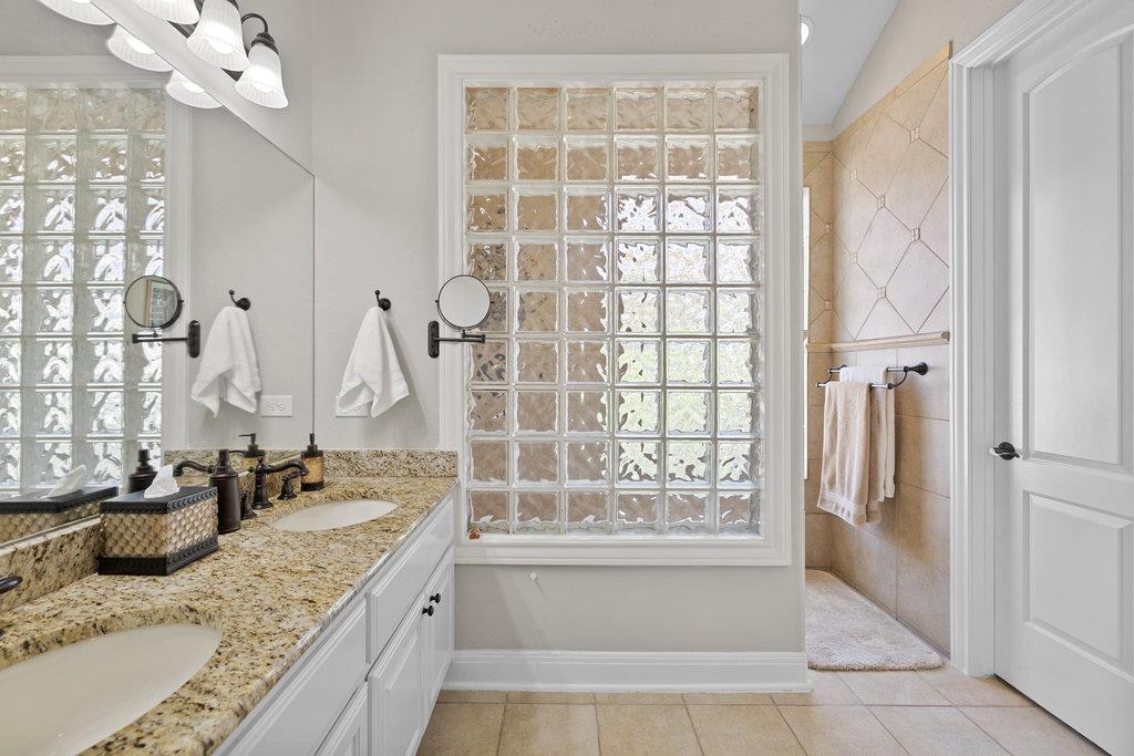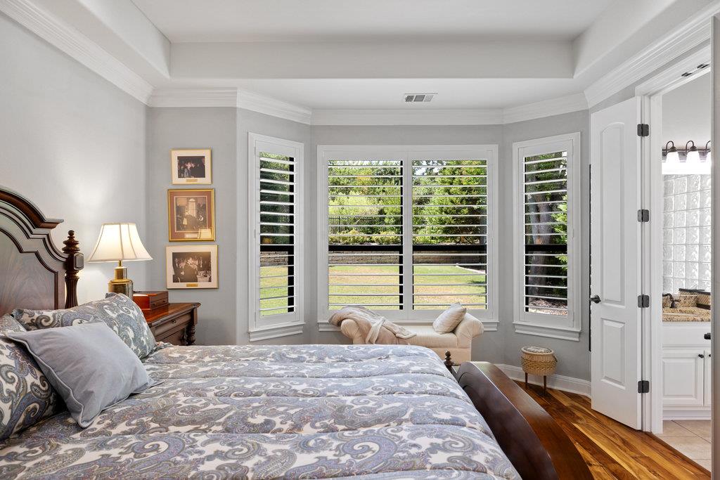 The dedicated home office, filled with light, provides the perfect space for productivity. The primary suite is a true retreat, with a bay window niche, tray ceiling, and spa-like walk-in shower. Each bedroom is fitted with custom California Closets, adding both elegance and organization.