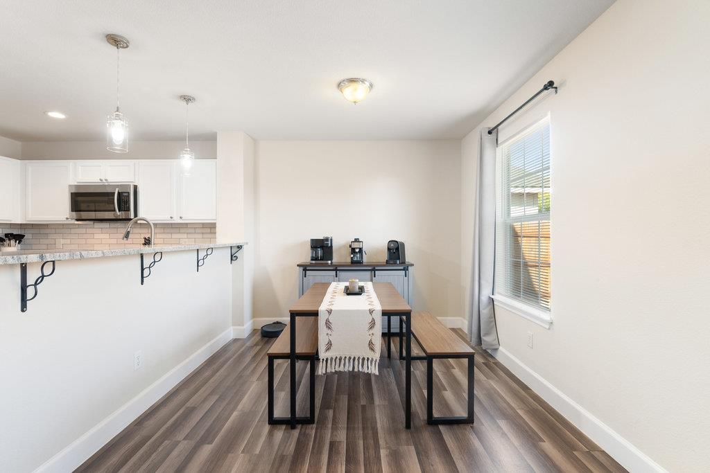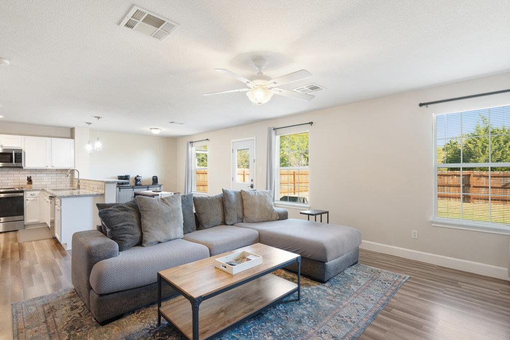 Charming red brick home in the peaceful Bell Farms neighborhood! Step inside to an open-concept layout where the bright living, dining, and kitchen areas flow seamlessly, perfect for everyday living or entertaining. The remodeled kitchen features beautiful granite countertops, a stylish backsplash, updated stainless steel appliances, an updated sink and faucet, and ample space for meal prep and gatherings. Vinyl plank flooring runs throughout the home, adding warmth and easy maintenance. Upstairs, the spacious primary suite includes an ensuite bath and plenty of natural light. Additional bedrooms and full bathroom are generously sized, offering flexibility for guests, a home office, or hobbies. Outside, enjoy a cozy patio and large flat backyard-- where the possibilities for a future pool, gardening, barbecuing, and entertaining are endless. Recent updates include recently installed front and back doors, refreshed light fixtures, front porch landscaping, and an epoxy-coated garage floor for a clean, modern touch. Nestled on a quiet street with friendly neighbors, this home is part of a wonderful community featuring a neighborhood park and walking paths. Conveniently located near grocery stores, dining, and everyday essentials, with easy access to major roadways for commuters.