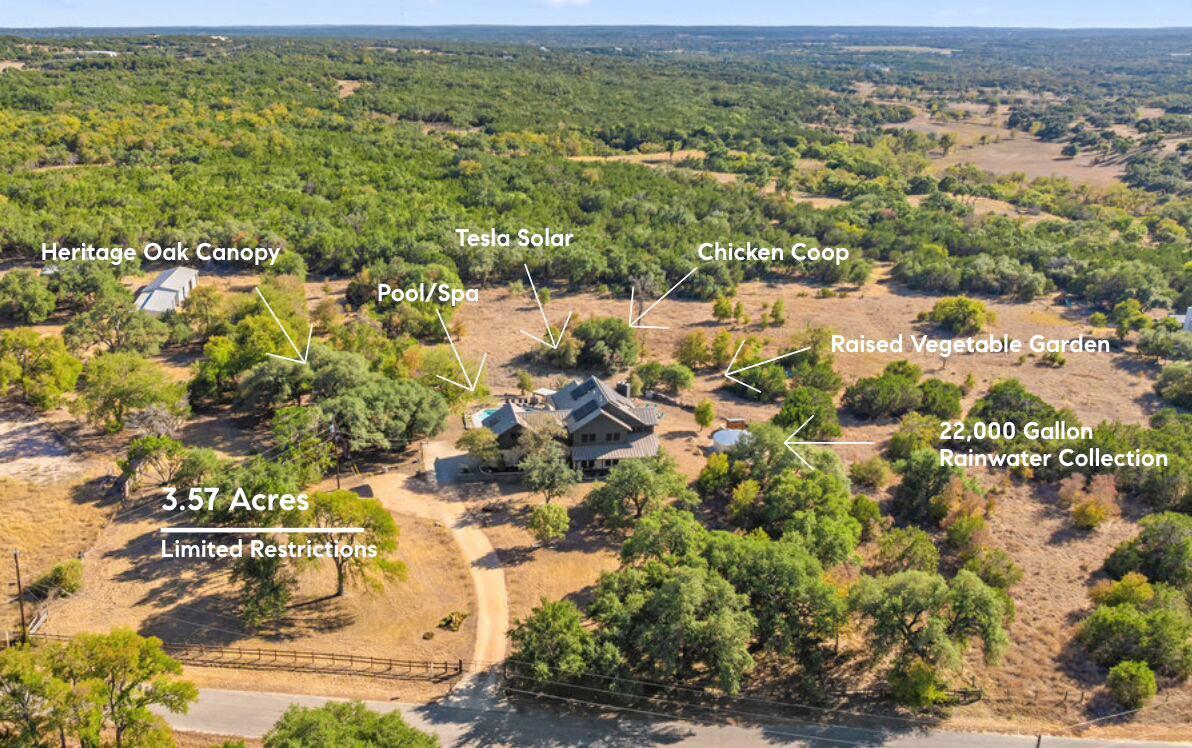 Experience modern design seamlessly blended with sustainable, off-grid living in this bespoke Hill Country masterpiece. Thoughtfully reimagined from the ground up, this home embraces both sophistication and self-sufficiency on a sprawling 3.57-acre lot.