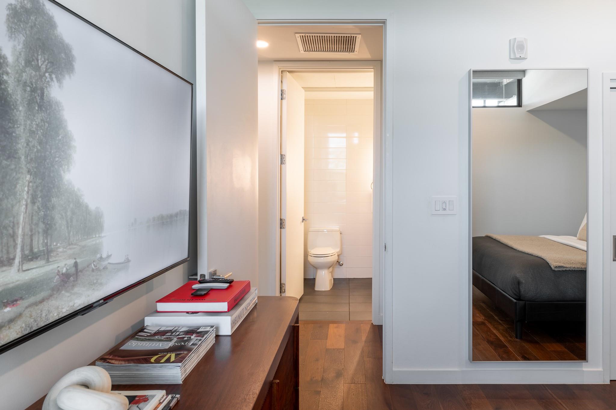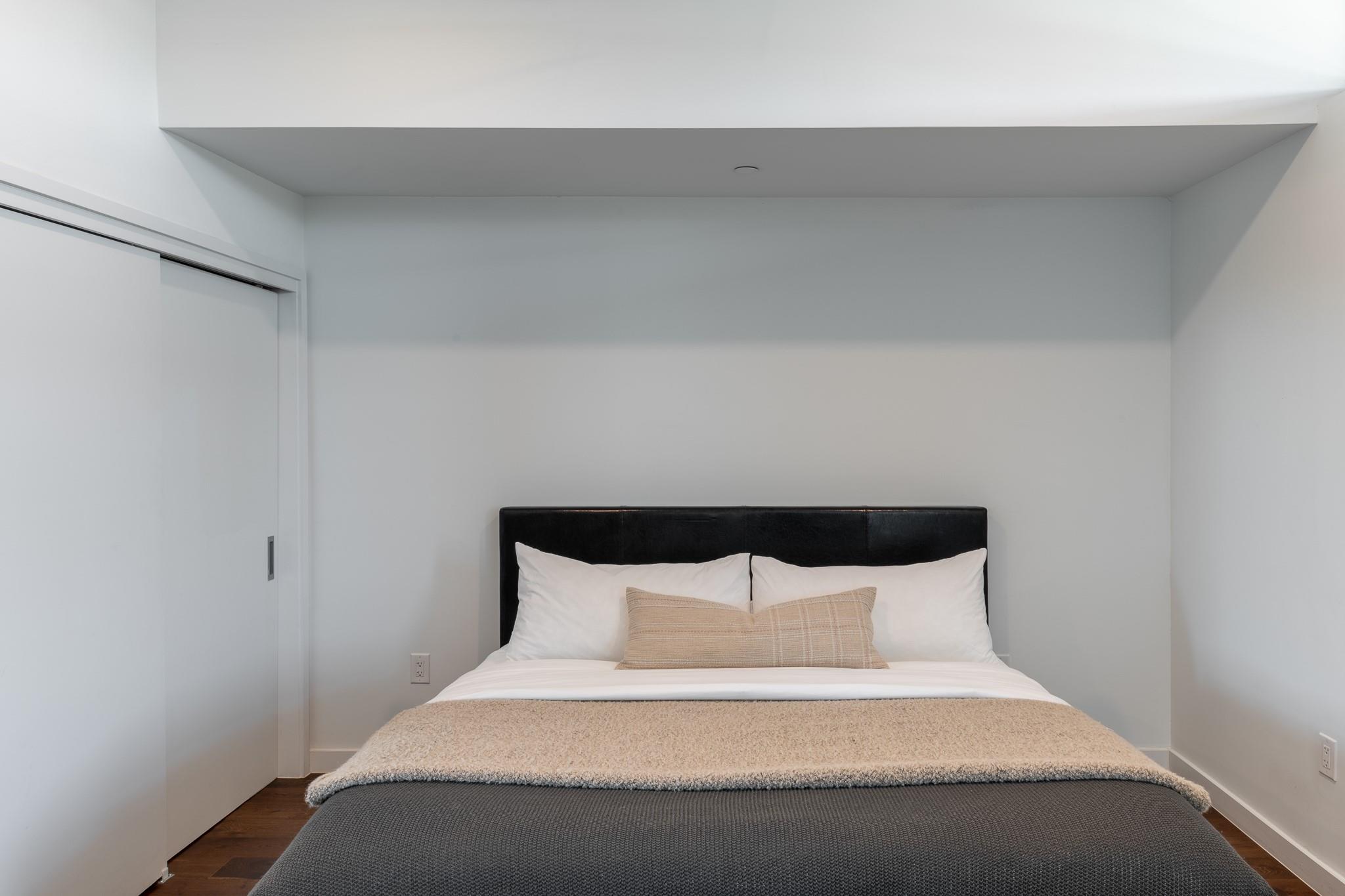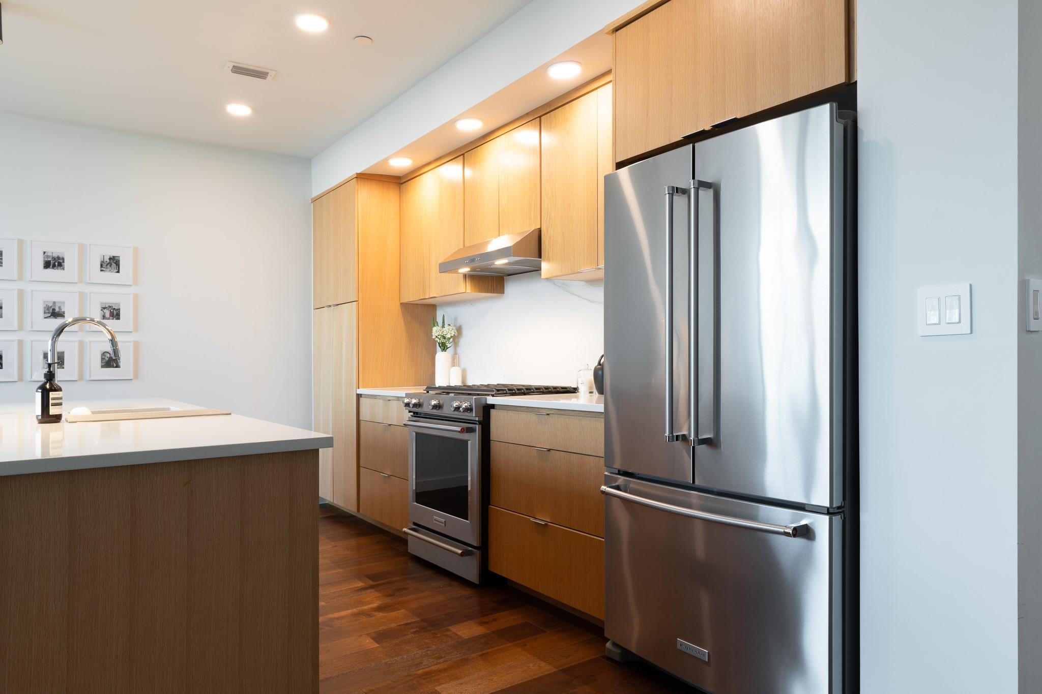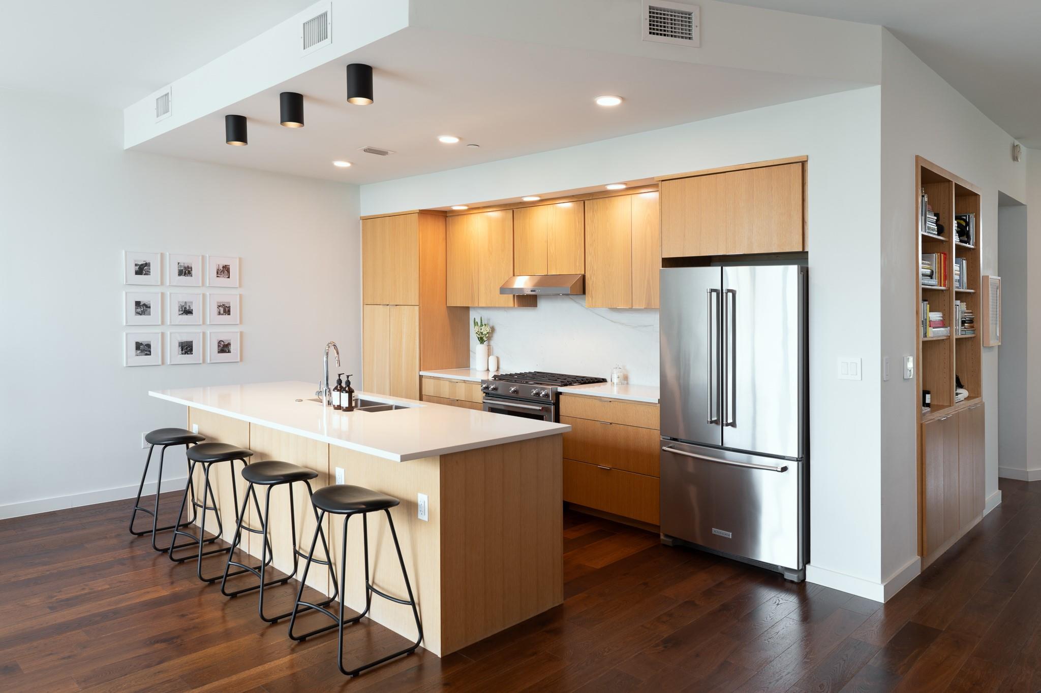The condo showcases modern finishes throughout, including beautiful hardwood floors, quartz countertops, custom cabinetry, and high-end stainless steel appliances. Recent upgrades include a striking Mont Blanc quartzite backsplash imported from Brazil, electric blackout shades in the bedroom, Lutron dimmers with screw-less wall plates on all lighting, and designer light fixtures.