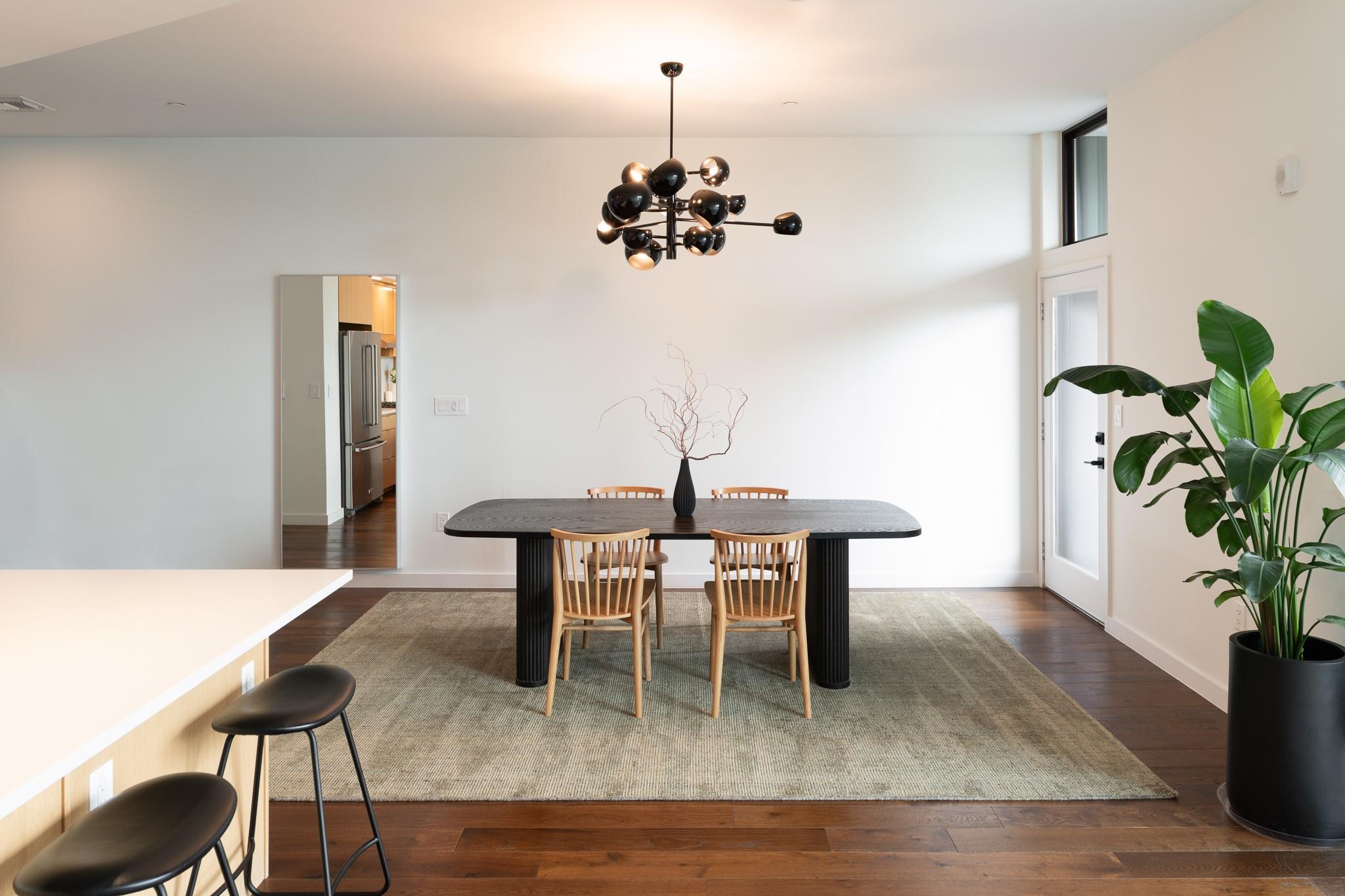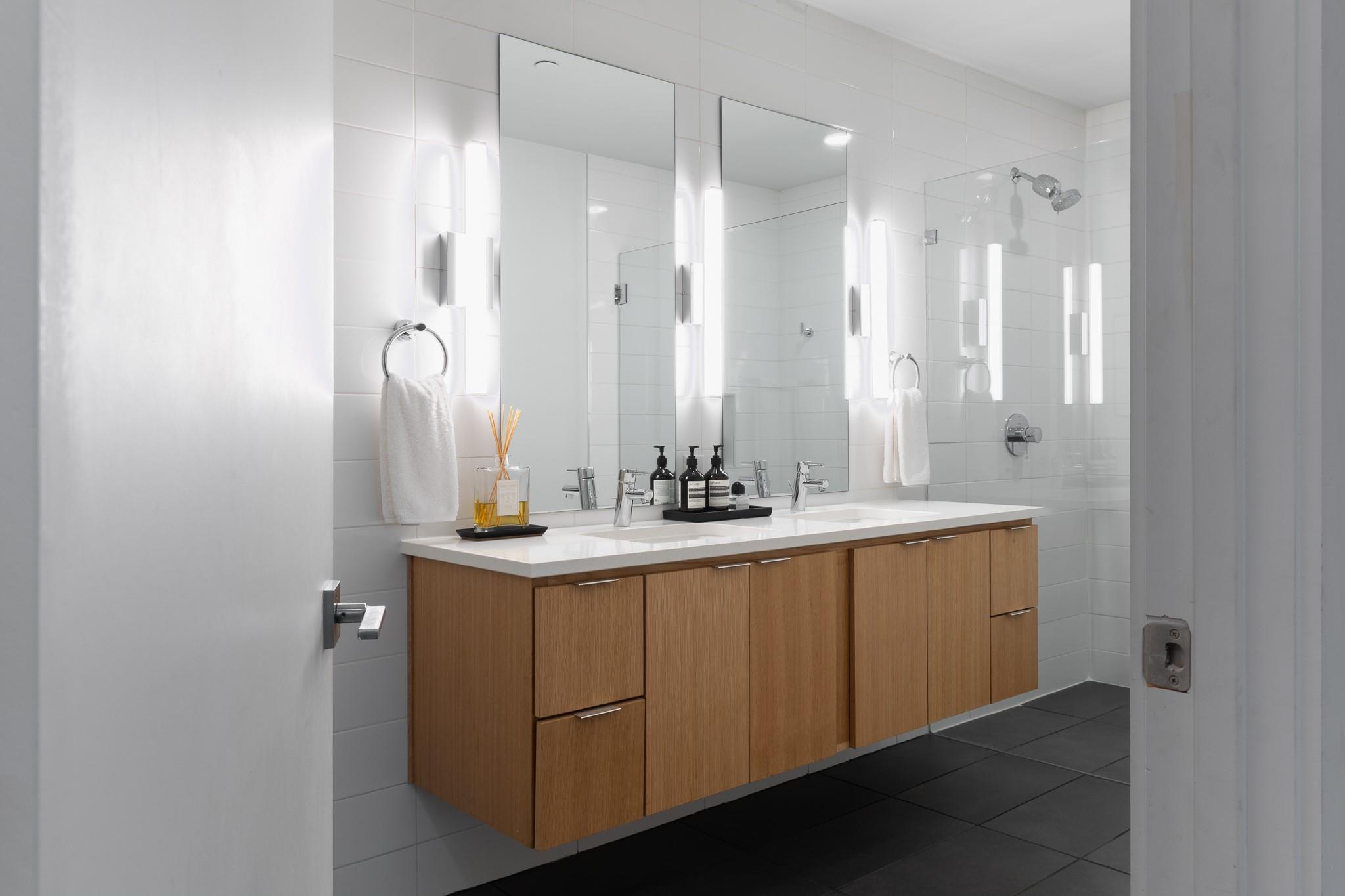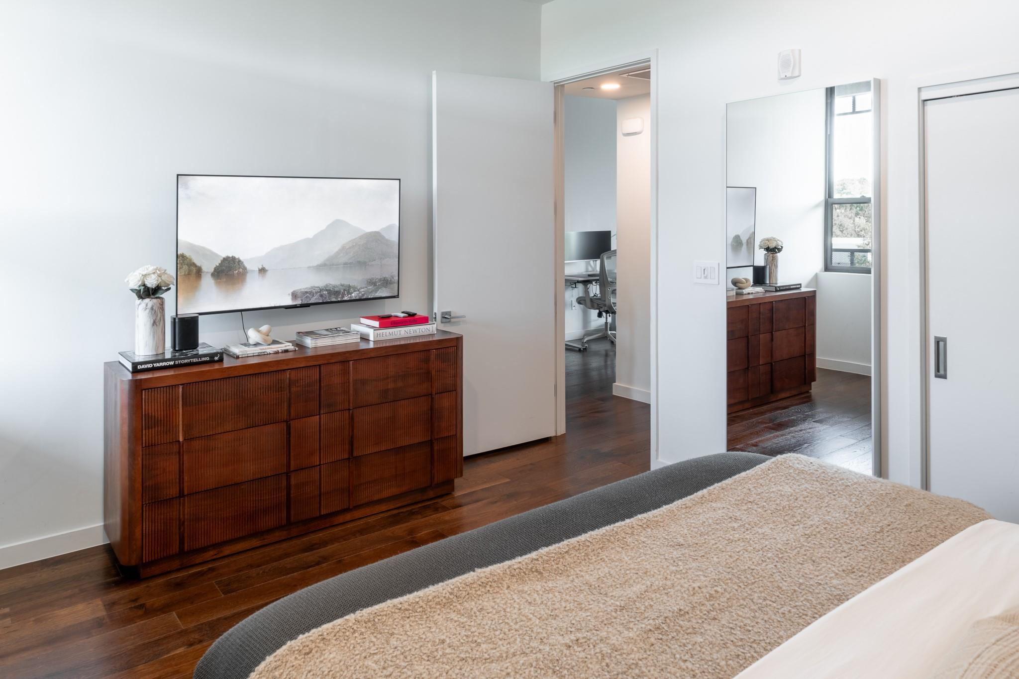 The condo showcases modern finishes throughout, including beautiful hardwood floors, quartz countertops, custom cabinetry, and high-end stainless steel appliances. Recent upgrades include a striking Mont Blanc quartzite backsplash imported from Brazil, electric blackout shades in the bedroom, Lutron dimmers with screw-less wall plates on all lighting, and designer light fixtures.