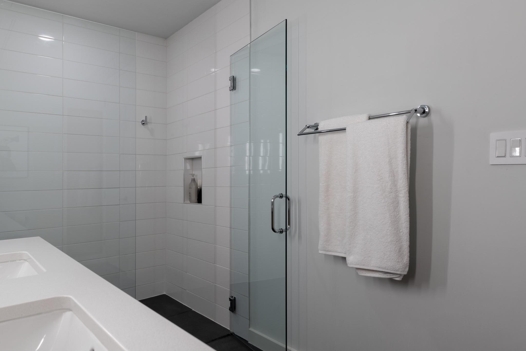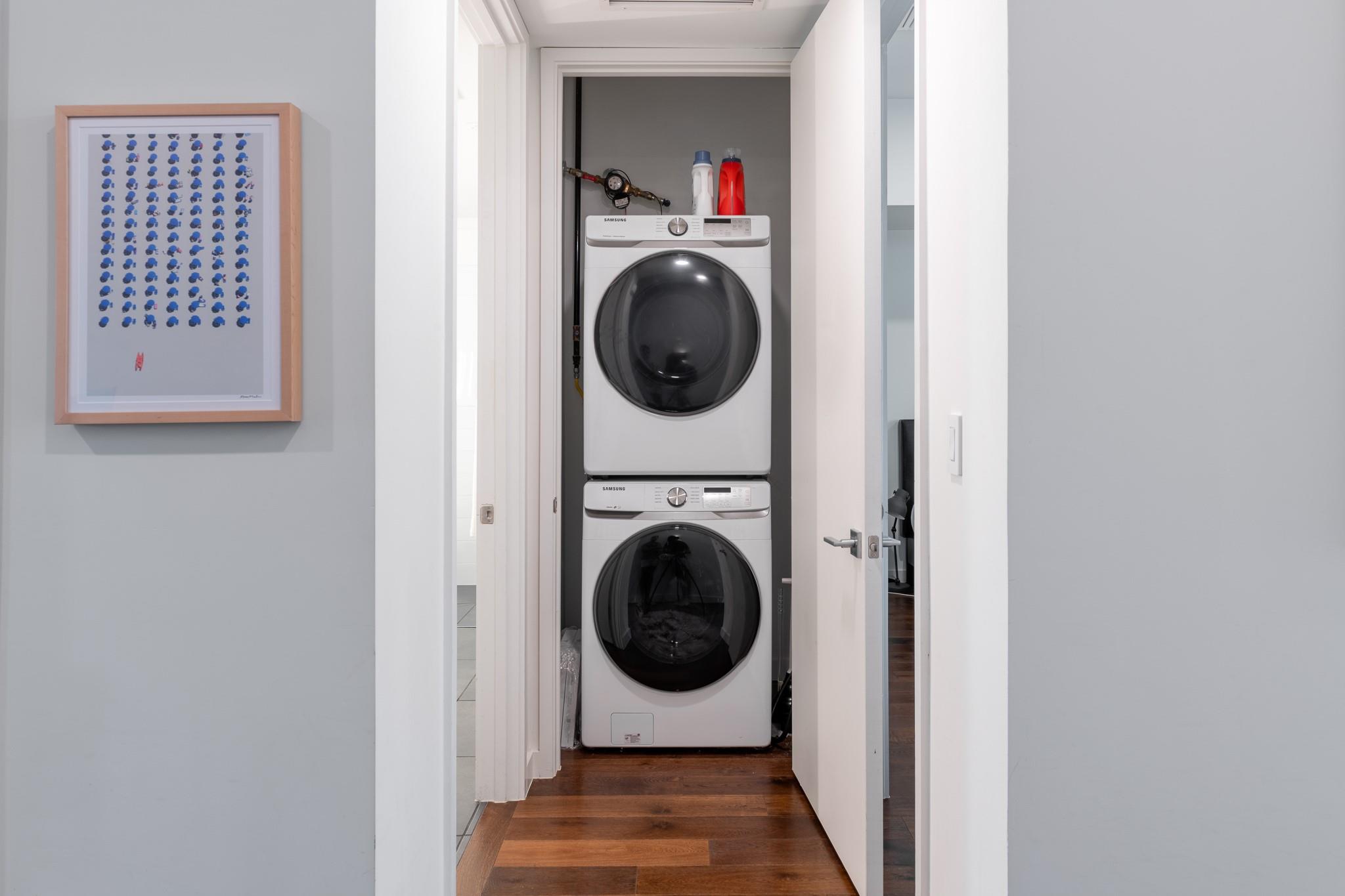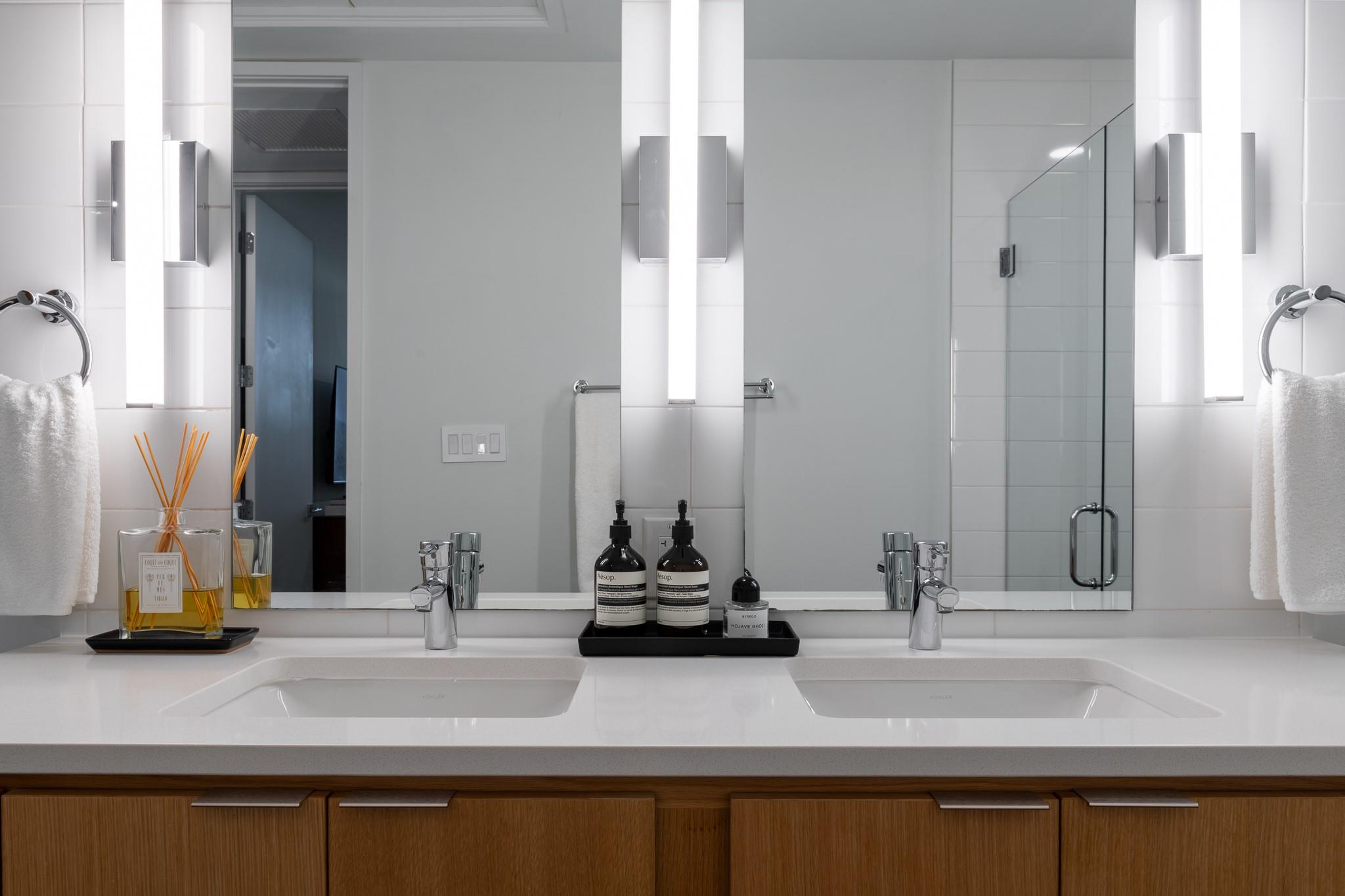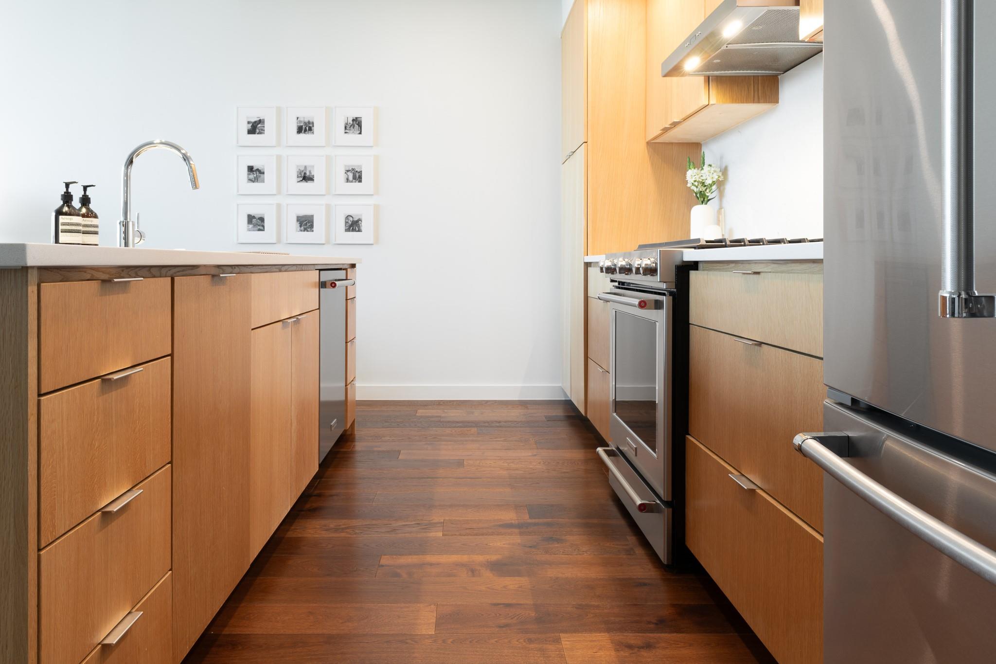 The condo showcases modern finishes throughout, including beautiful hardwood floors, quartz countertops, custom cabinetry, and high-end stainless steel appliances. Recent upgrades include a striking Mont Blanc quartzite backsplash imported from Brazil, electric blackout shades in the bedroom, Lutron dimmers with screw-less wall plates on all lighting, and designer light fixtures.