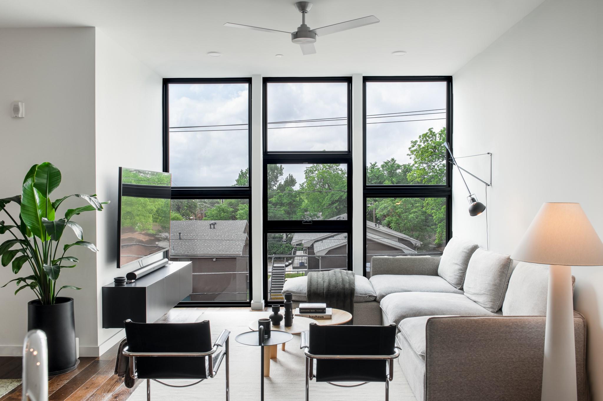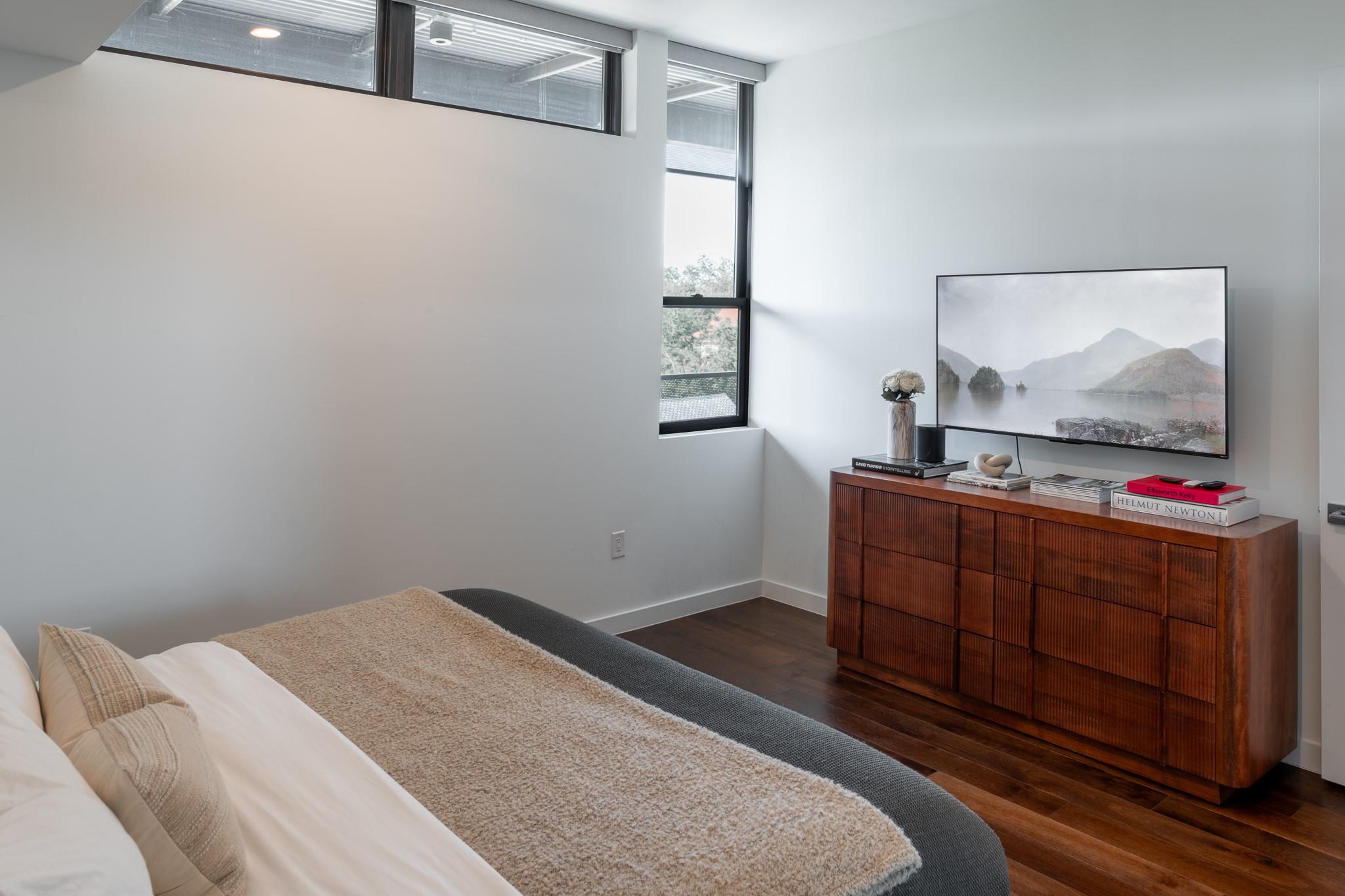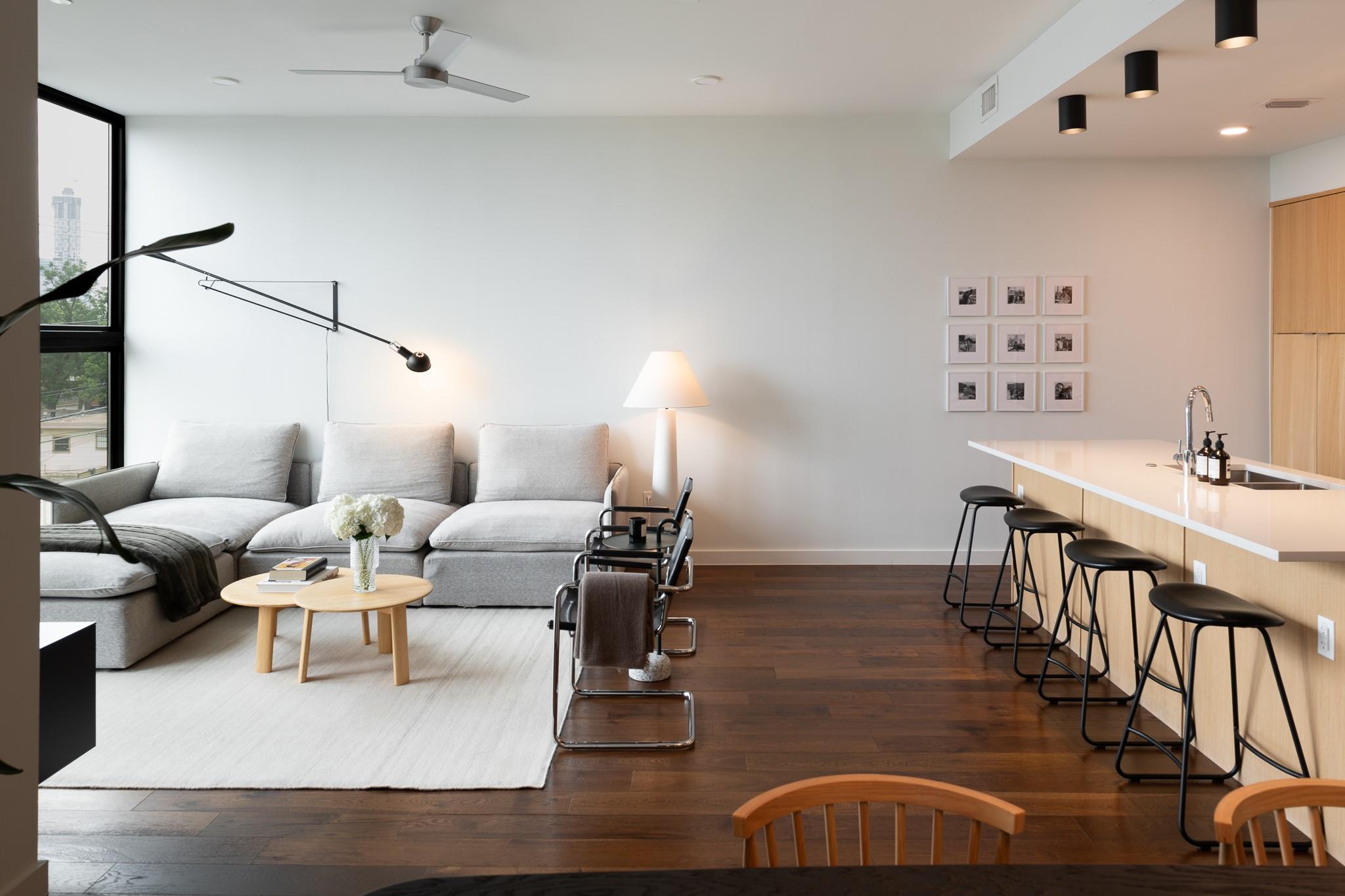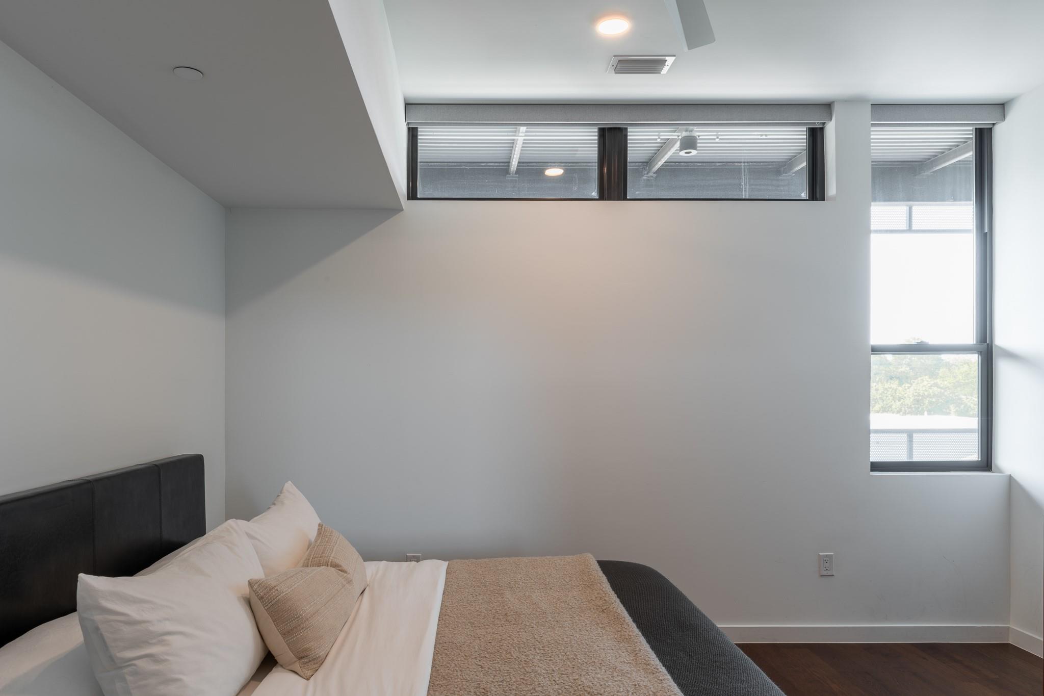 This stunning East Austin condo is one of the largest single-story one-bedroom units available and is packed with premium features and thoughtful design. Soaring 11-foot ceilings, expansive floor-to-ceiling windows, and a covered balcony fill the space with natural light and create an airy, open feel. The flexible, open-concept layout is ideal for both entertaining and working from home, with wide hallways and an oversized bathroom featuring a glass walk-in shower and dual vanity. The HOA also allows 30+ day leases and up to two weeks of short-term rental per year--perfect for generating extra income during major Austin events like SXSW and ACL. Making this unit attractive to investors too.
