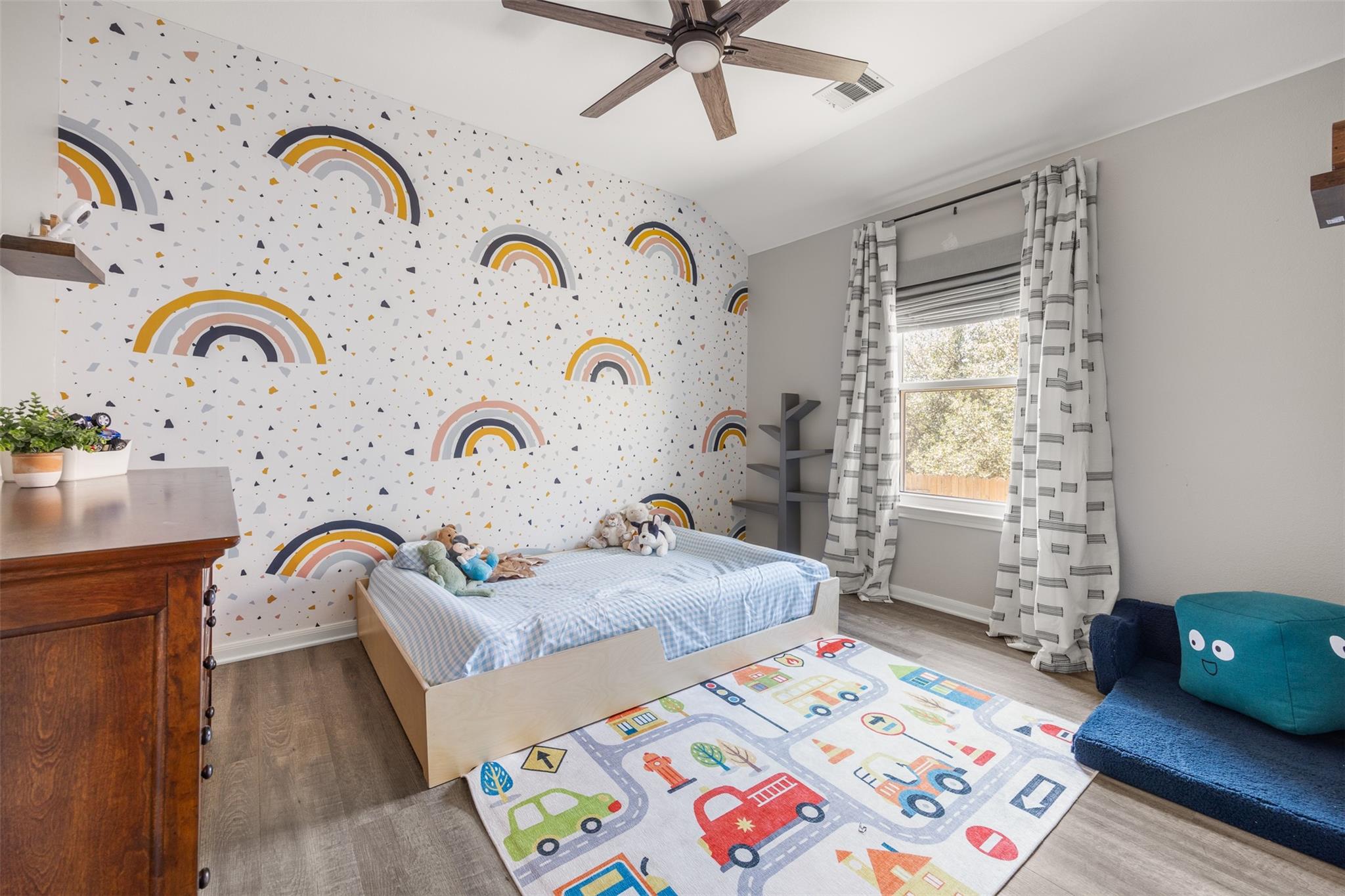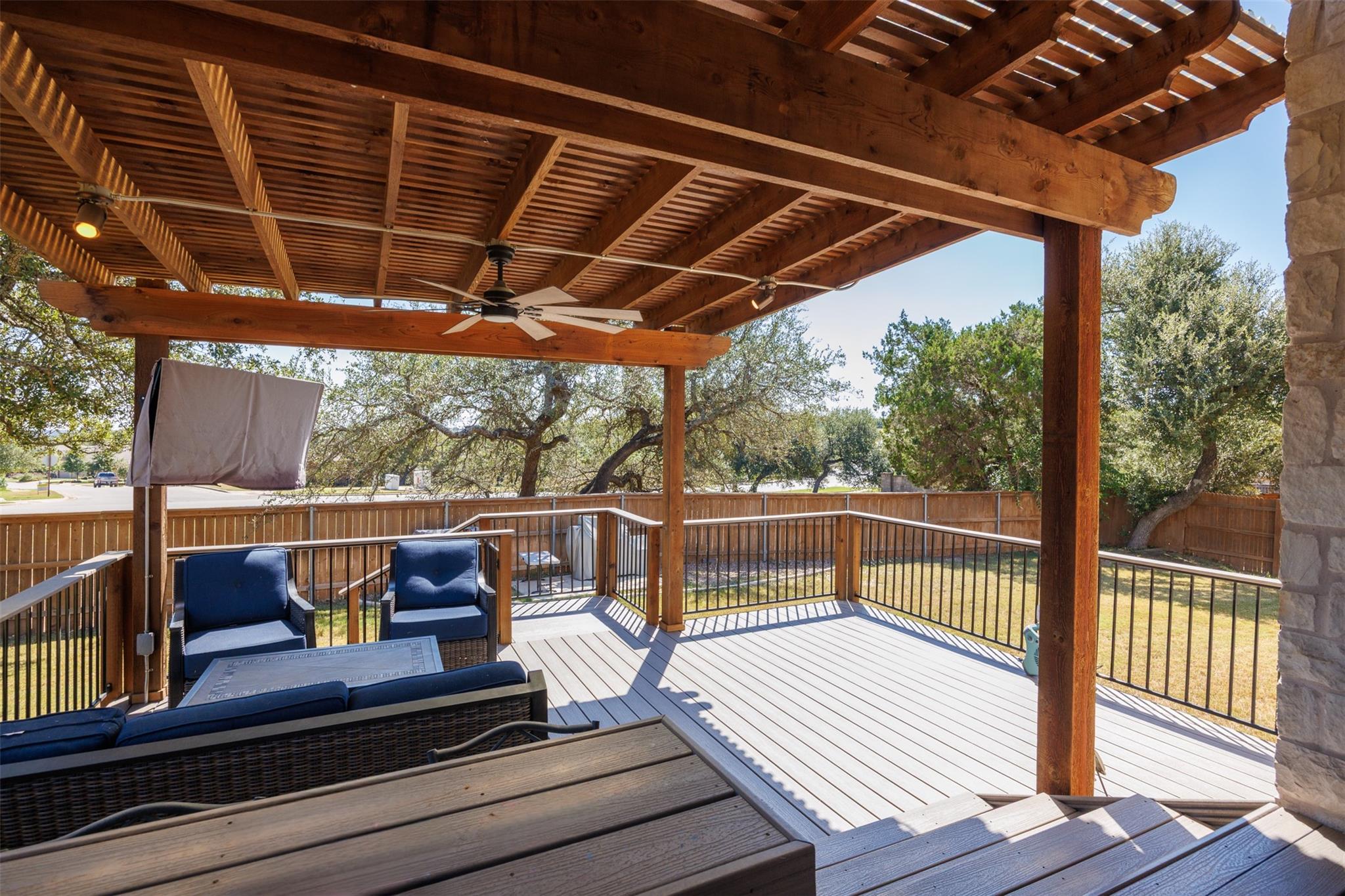 Step outside to a backyard retreat with a deck and pergola, offering privacy and the perfect spot to relax or entertain.