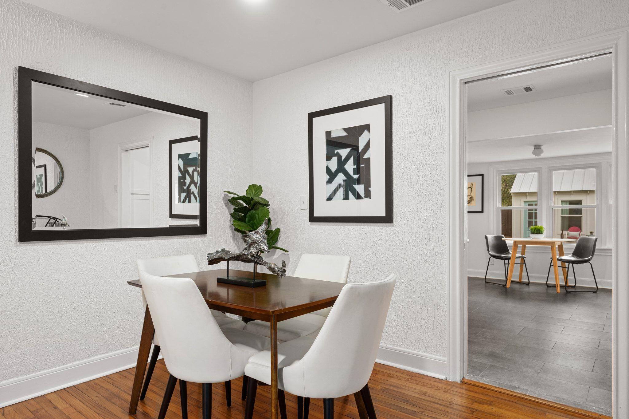 Paying homage to the home's heritage, original wood floors sprawl through the main living / dining and well appointed bedrooms with a large walk-in w/ tailored shelving. The spacious kitchen now sports new cabinetry, quartz counters offer ample space for food prep, updated flooring and stainless appliances while providing backyard views and a wealth of sunlight thru the wall of windows along the back of the home.