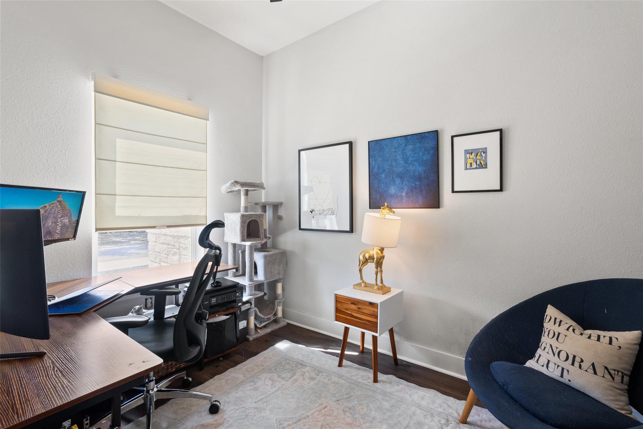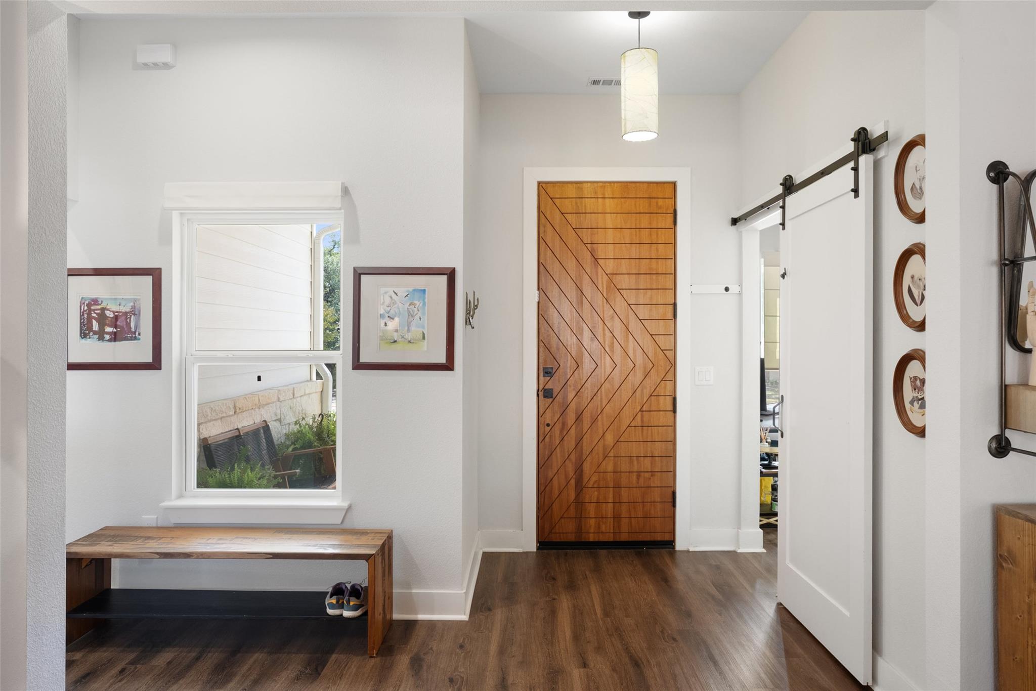 An open-concept living area flows seamlessly into a designer kitchen featuring a large quartz island, stainless appliances, custom cabinetry, and a walk-in pantry. Just off the main space, a versatile flex room with sliding barn door makes the perfect office, playroom, or creative studio.