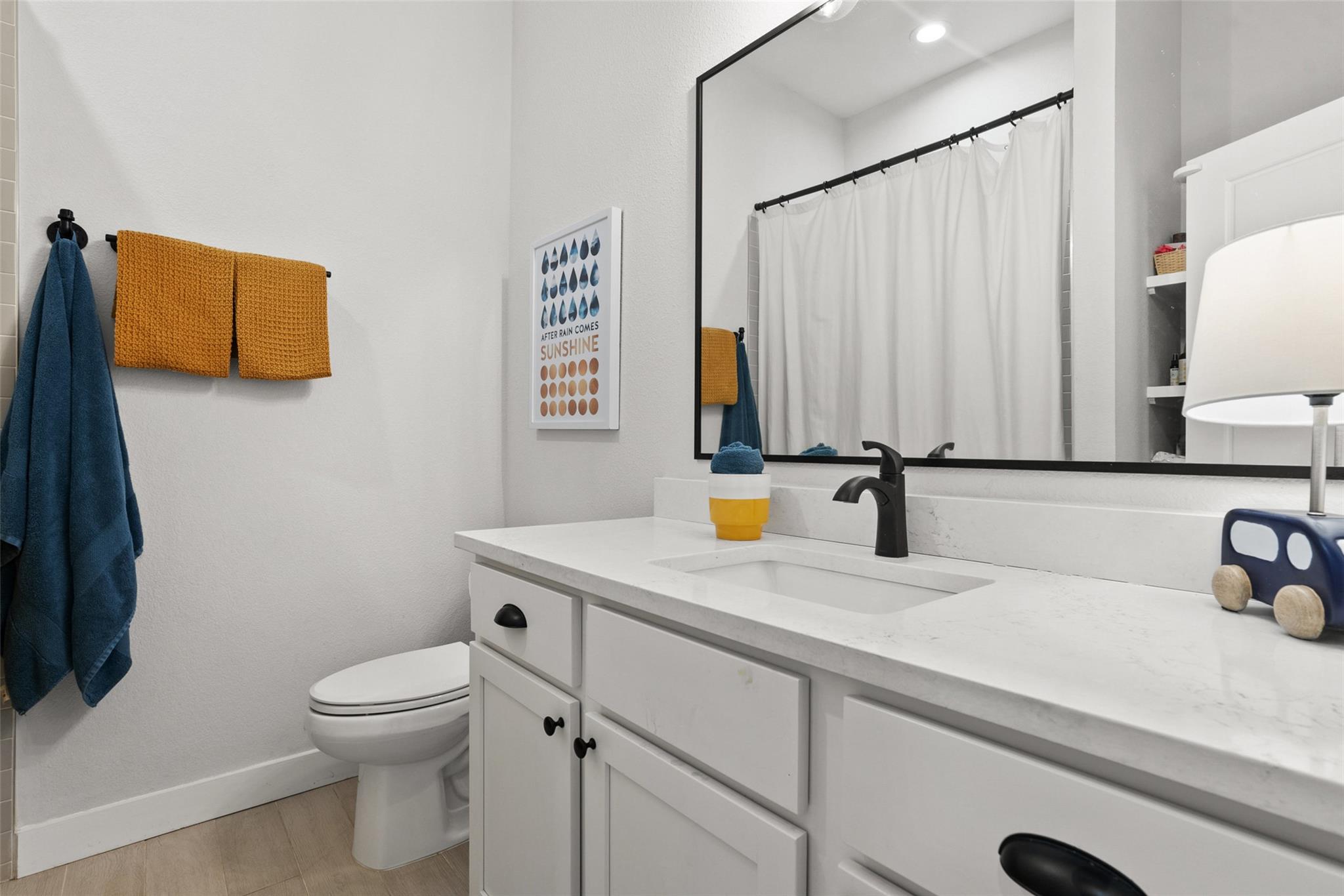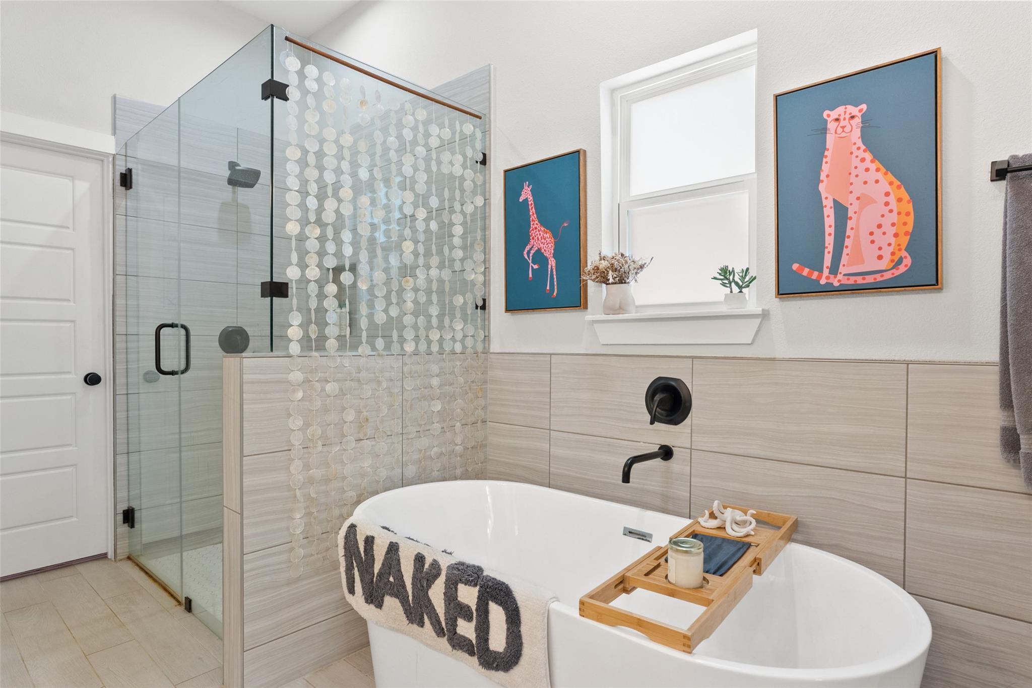 The private primary suite is tucked away at the back of the home and offers a spa-like bath with soaking tub, separate shower, dual vanities, and generous walk-in closet. Two spacious secondary bedrooms are split for privacy. Durable wood-look flooring runs throughout--no carpet anywhere.