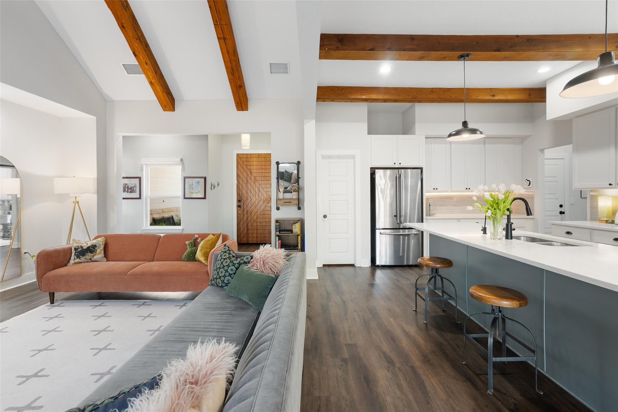 Built in 2021, this stunning single-story modern farmhouse combines fresh, stylish design with thoughtful function and energy efficiency. From the inviting front porch and handcrafted mahogany door to the vaulted, beamed ceilings inside, every detail feels custom and elevated.