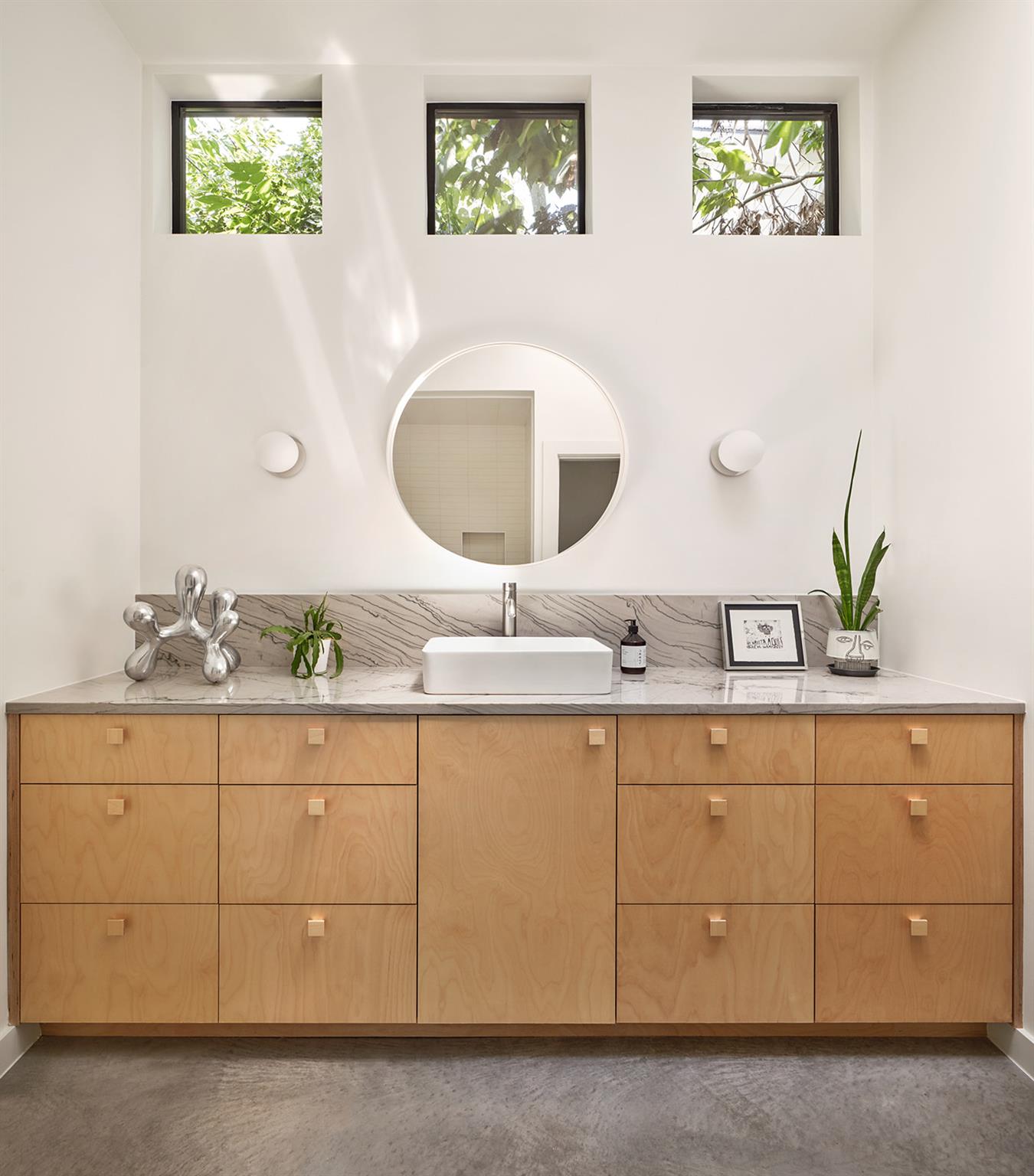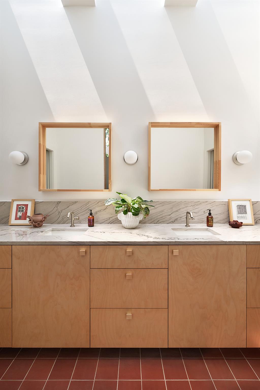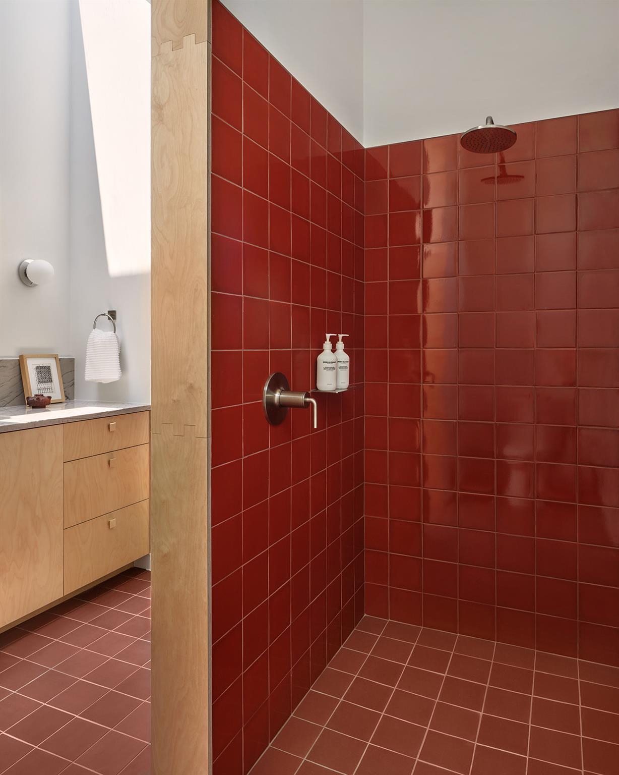 Upstairs, the private owner's suite provides a serene escape, while thoughtful appointments throughout reveal surprises at every turn. From the vibrant primary bath's tile to the warmth of the custom plywood accents, the interplay of glossy tile, shadow, and light are the stars here.