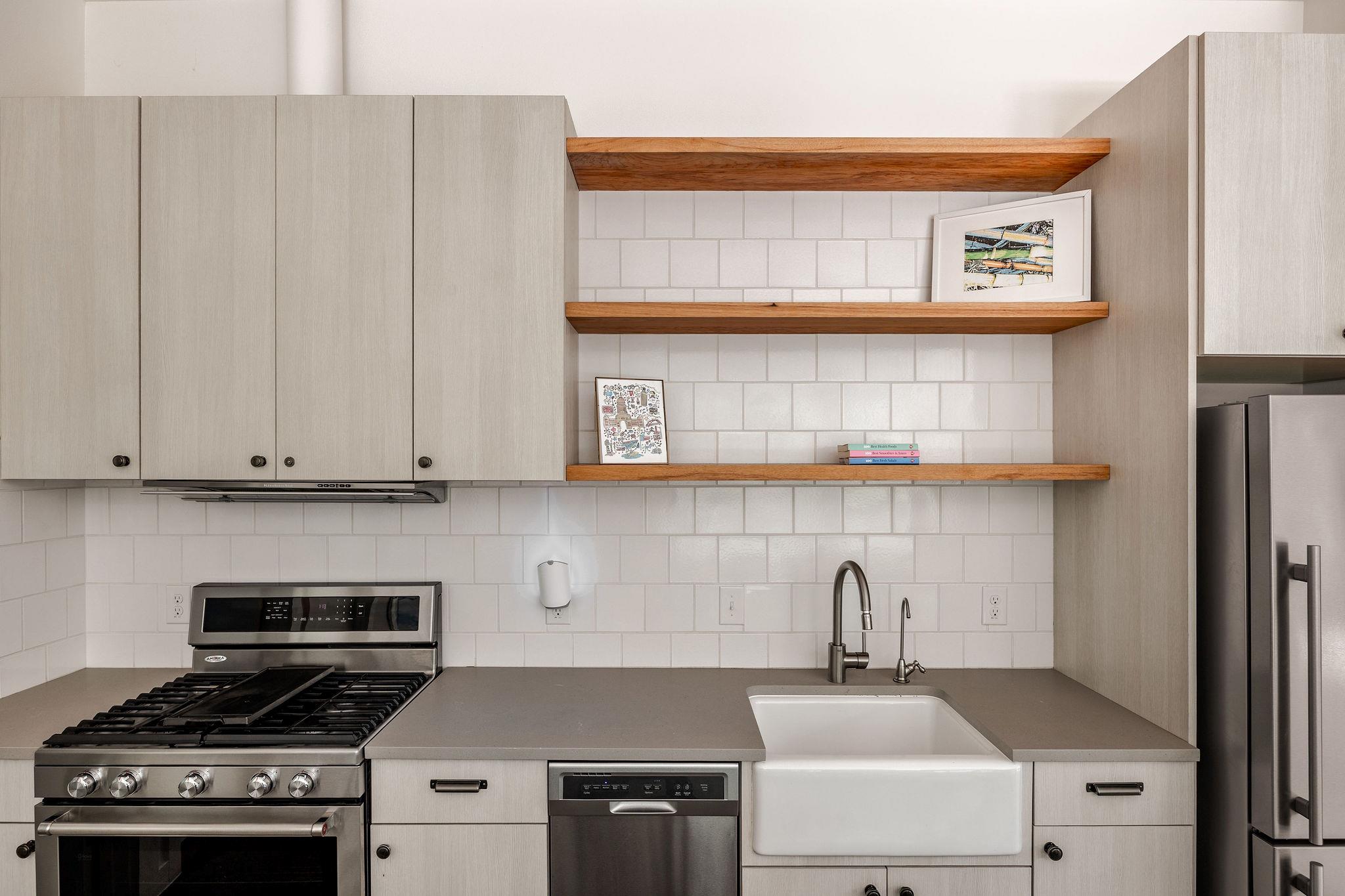 Natural light fills the open living area, which connects seamlessly to a full-size kitchen outfitted with custom cabinetry, a beautiful island that conveys, and warm pecan live-edge shelving. Sliding screen doors extend the living space outdoors to a landscaped, covered patio--creating an easy indoor/outdoor flow perfect for morning coffee or quiet evenings at home.