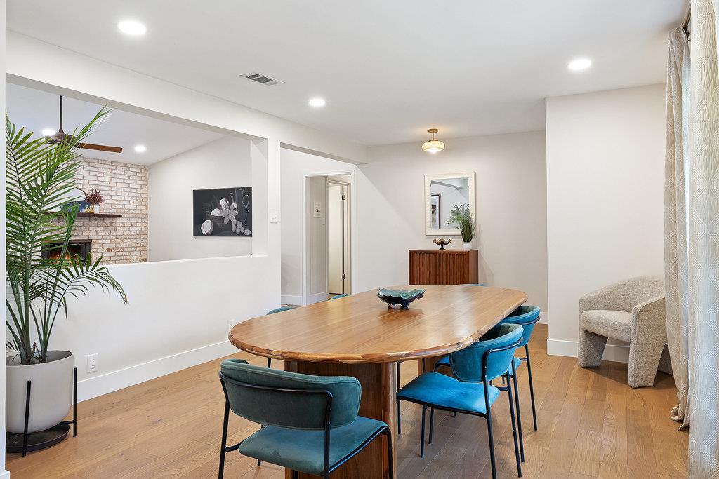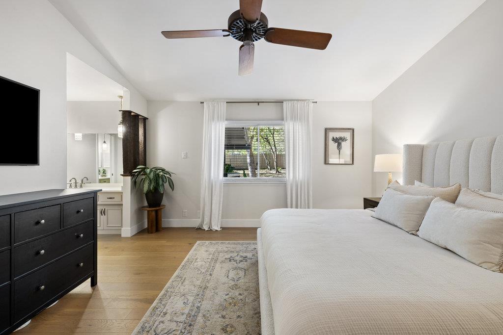 A quiet treasure in South Austin, where majestic tree-lined streets and expansive lots create a timeless neighborhood charm. This beautiful two-story single-family home features four spacious bedrooms and two full bathrooms. The primary suite is conveniently located on the first floor and boasts a vaulted ceiling, walk-in closet, and en-suite bathroom for added comfort. The home offers an inviting layout with recessed lighting, a large living room with vaulted ceilings, a cozy fireplace, and sliding doors leading to the backyard -- all perfect for entertaining. The kitchen is equipped with stainless steel appliances and ample cabinet space, making it ideal for everyday living. The large dining area provides additional space for gatherings. Enjoy the outdoors on the covered front and back patios, overlooking a spacious backyard shaded by mature trees. This home perfectly combines style, comfort, and functionality in a serene setting.
