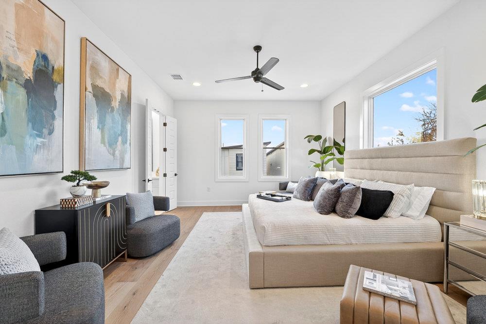 *Builder offering rates as low as 4.99%, for homes closing by 2/28. If purchasing in cash builder will credit back 3% of sales price at closing!* MODERN ARCHITECTURE + SPECTACULAR VIEW OF DOWNTOWN SKYLINE! New construction, perched above the trees overlooking the city & next to a private gated park, this 3,200sf detached townhome lives like a single-family. Great place to entertain or relax w/backdrop of the city lights! Great sunsets. 4 bedroom/4 bath (+gameroom) has a wow factor. 14ft ceilings in living area, high-end finishes, soothing color palette, light & bright, large picture windows, wide plank wood floors throughout, modern gas fireplace finished in Carrara marble to ceiling. Chef's kitchen w/Thermador appliances, 48" Pro Range w/2 ovens & built in fridge, contemporary soft-close cabinetry, quartz counters, breakfast bar, pantry, desk area + mudroom. Flex room on 1st floor can be used as a bedroom, office, gym, etc, w/attached bathroom. 2nd floor has primary suite w/picture window overlooking park. Primary bath is beyond luxurious w/Carrara marble, free standing tub, spacious shower, 2 vanities w/seating area & large closet w/door to the laundry room. Secondary bedroom overlooking trees w/ensuite bath. 3rd floor has gameroom w/stackable sliding glass doors to deck with DT view & 4th bed has direct access to deck/views. Gameroom has wetbar, fridge/freezer. Gated yard + 2-car garage. Tankless water heater. Security System. Wired for surround sound. Anderson wood windows. 8 ft doors. Warranty included. Intown Homes is a highly reputable builder that has been building in Texas for over 50 years. The Park at Sunridge community is enclave of 18 homes & pet friendly park. Architecturally beautiful community surrounded by greenery, every home is unique. Emerging area w/major development, upcoming River Park (aka "East Side Domain") w/ retail, light rail + trail system. Close proximity to Soco (new HEB), DT, hike/bike trail, airport. Landscaping maintained by HOA.