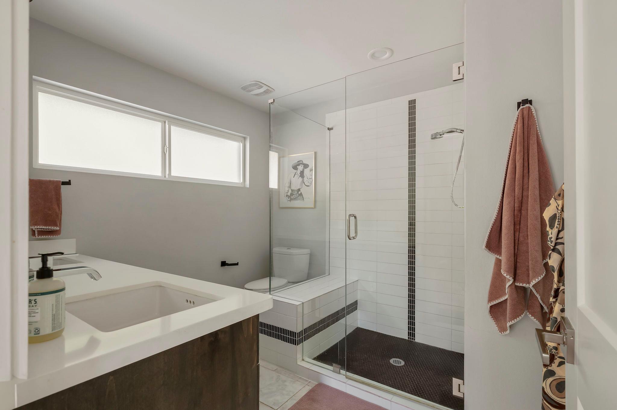 Upstairs, you'll find two bedrooms, each with their own ensuite bathroom. The primary oasis is ultra-private and features two separate closets, a dual-vanity, walk-in shower, and direct access to the back patio and yard. The second bedroom also has a private ensuite bathroom for ultimate comfort.