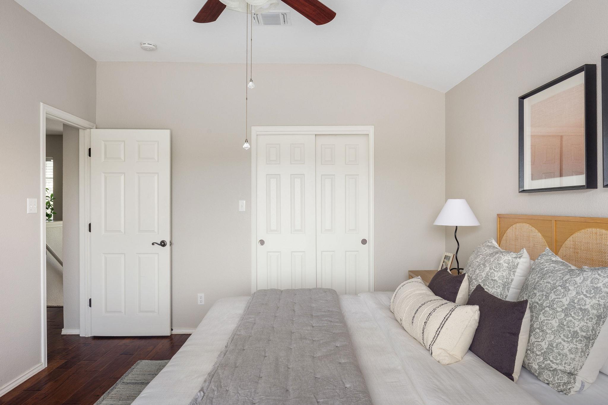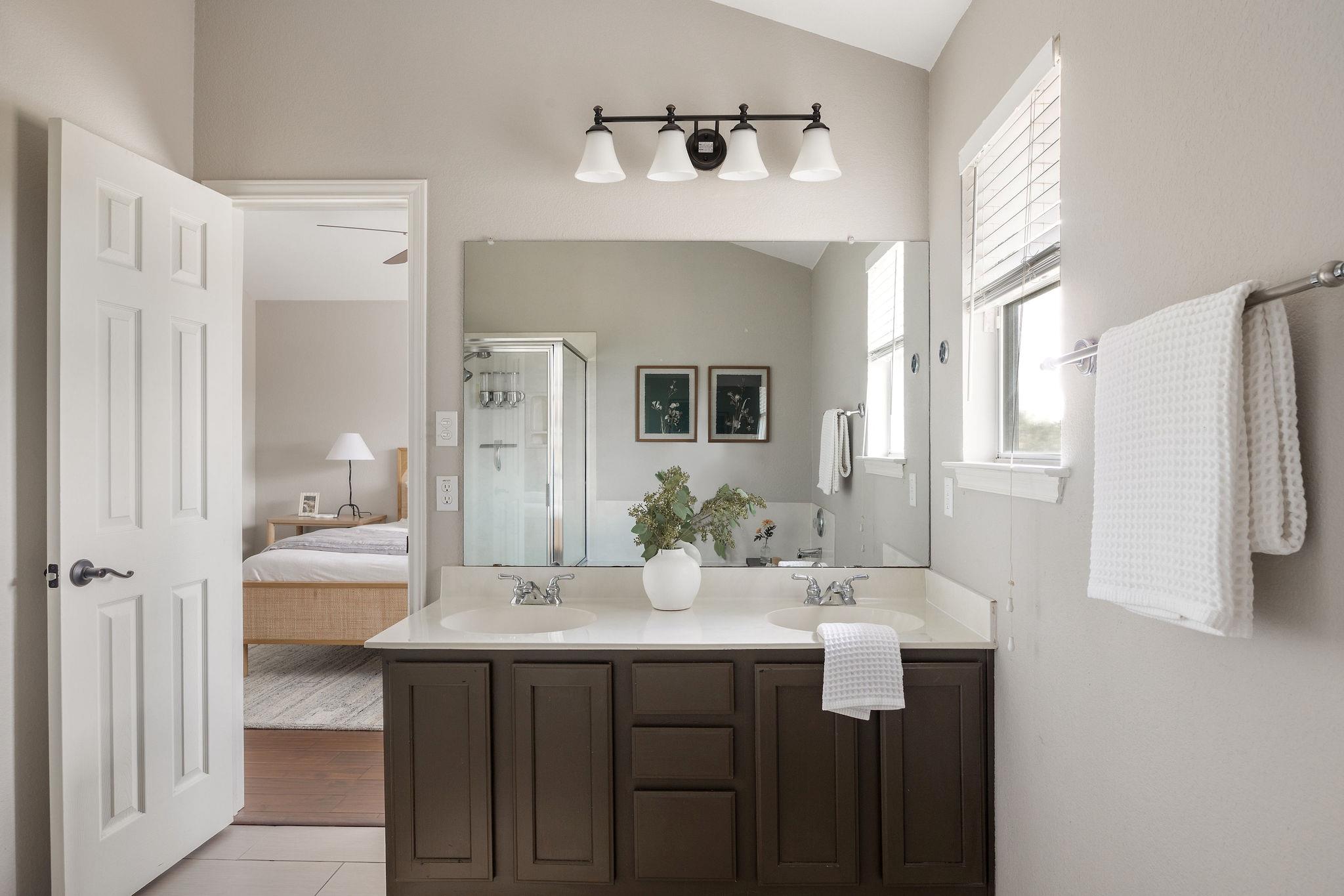 Just a block from Cowan Elementary, this Cherry Creek gem sits pretty on an oversized corner lot with a full front landscaping overhaul! No rear neighbors mean extra privacy, and the rare rear-entry 2-car garage is tucked away on a private drive. - Inside, fresh painted cabinetry and brand-new kitchen countertops give the heart of the home a crisp, updated feel. Natural light pours through oversized windows, highlighting the warm wood floors and inviting finishes. You'll love the two living spaces--one upstairs, one down--plus a cozy fireplace and a wall of windows overlooking the backyard. There's even a sunny bonus room that's perfect for plant parents, a reading nook, or your morning coffee spot. - All three bedrooms are upstairs. The primary suite feels like a retreat, with treetop views, a soaking tub, separate shower, and spacious vanity. - Located in South Austin with great schools, you're just minutes from H-E-B, shopping, dining, the neighborhood dog park, and walking trails. Quick access to Mopac, I-35, and Southpark Meadows--only 11 miles to downtown--makes life and commuting a breeze.