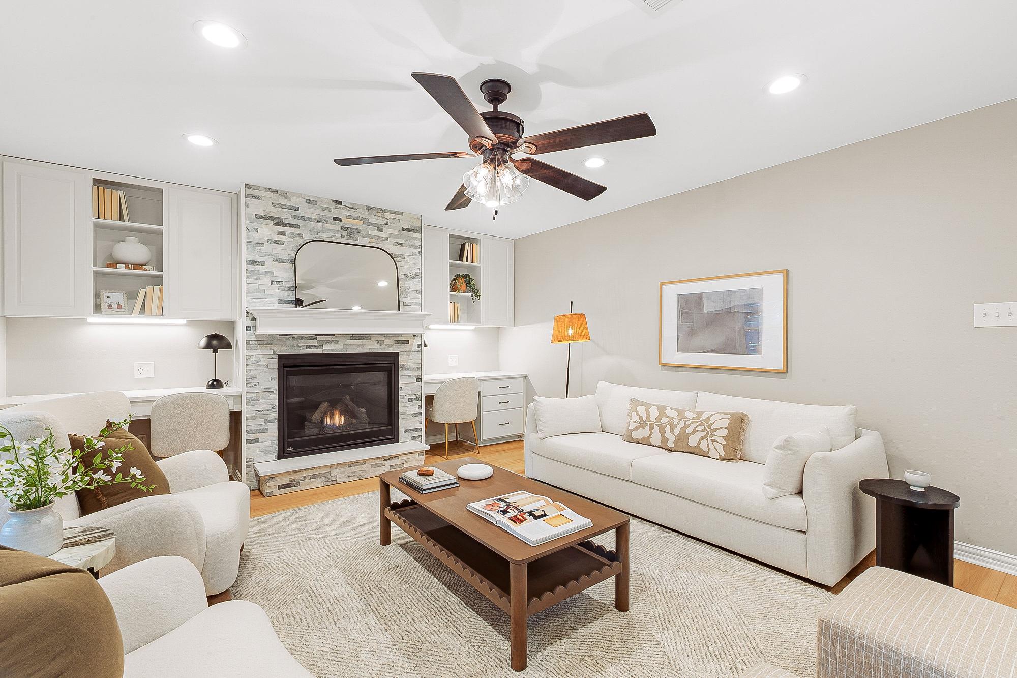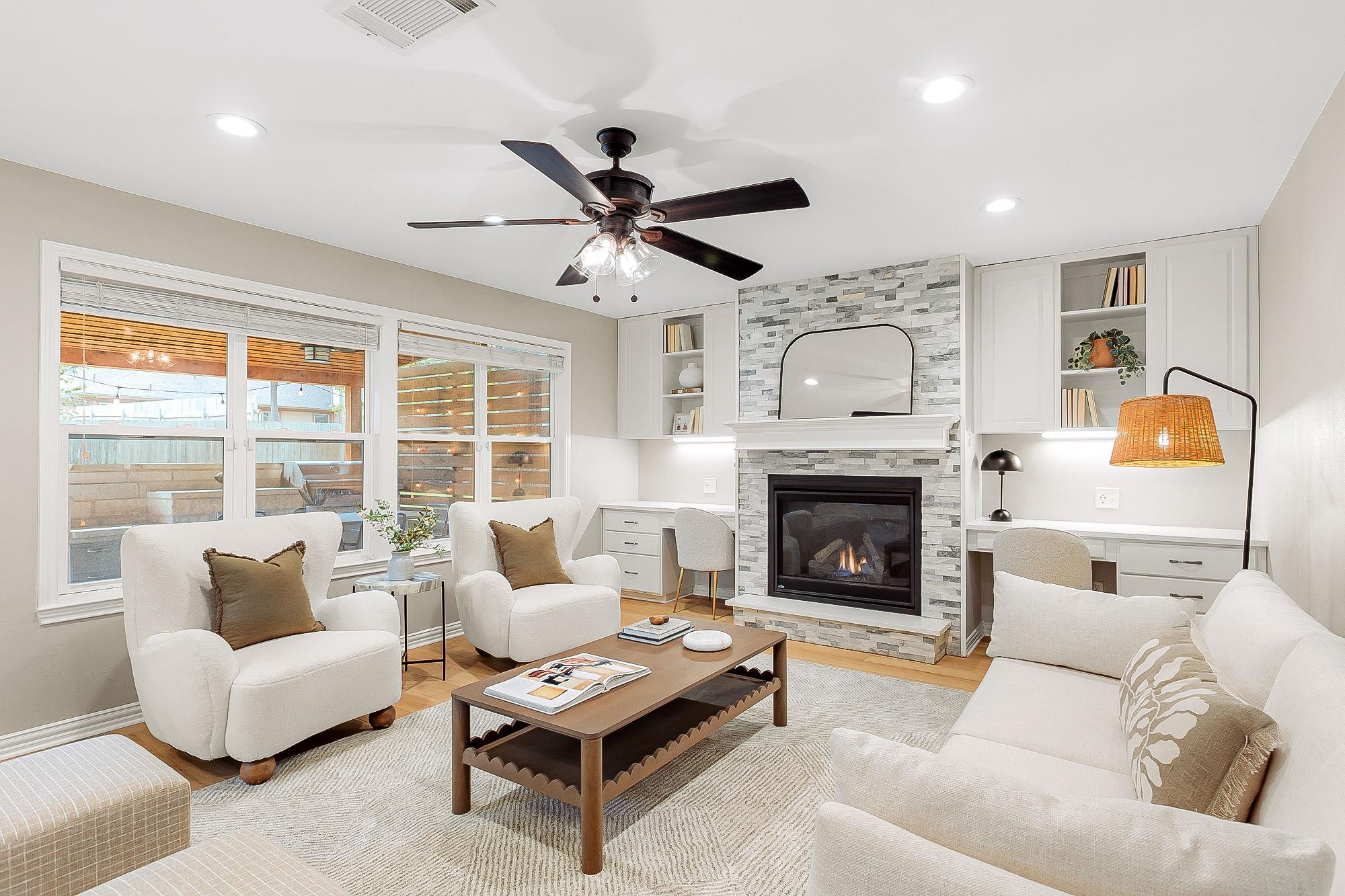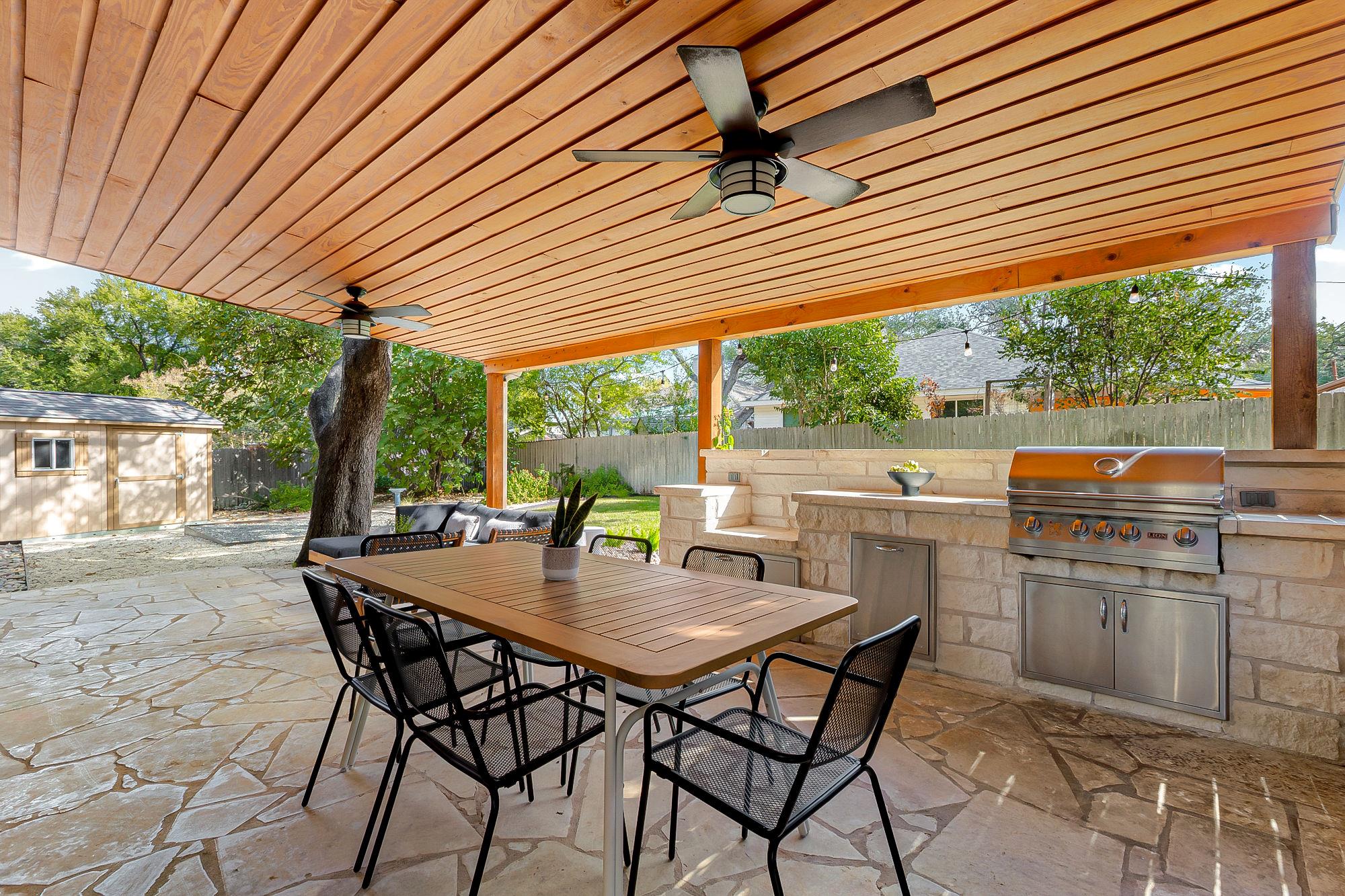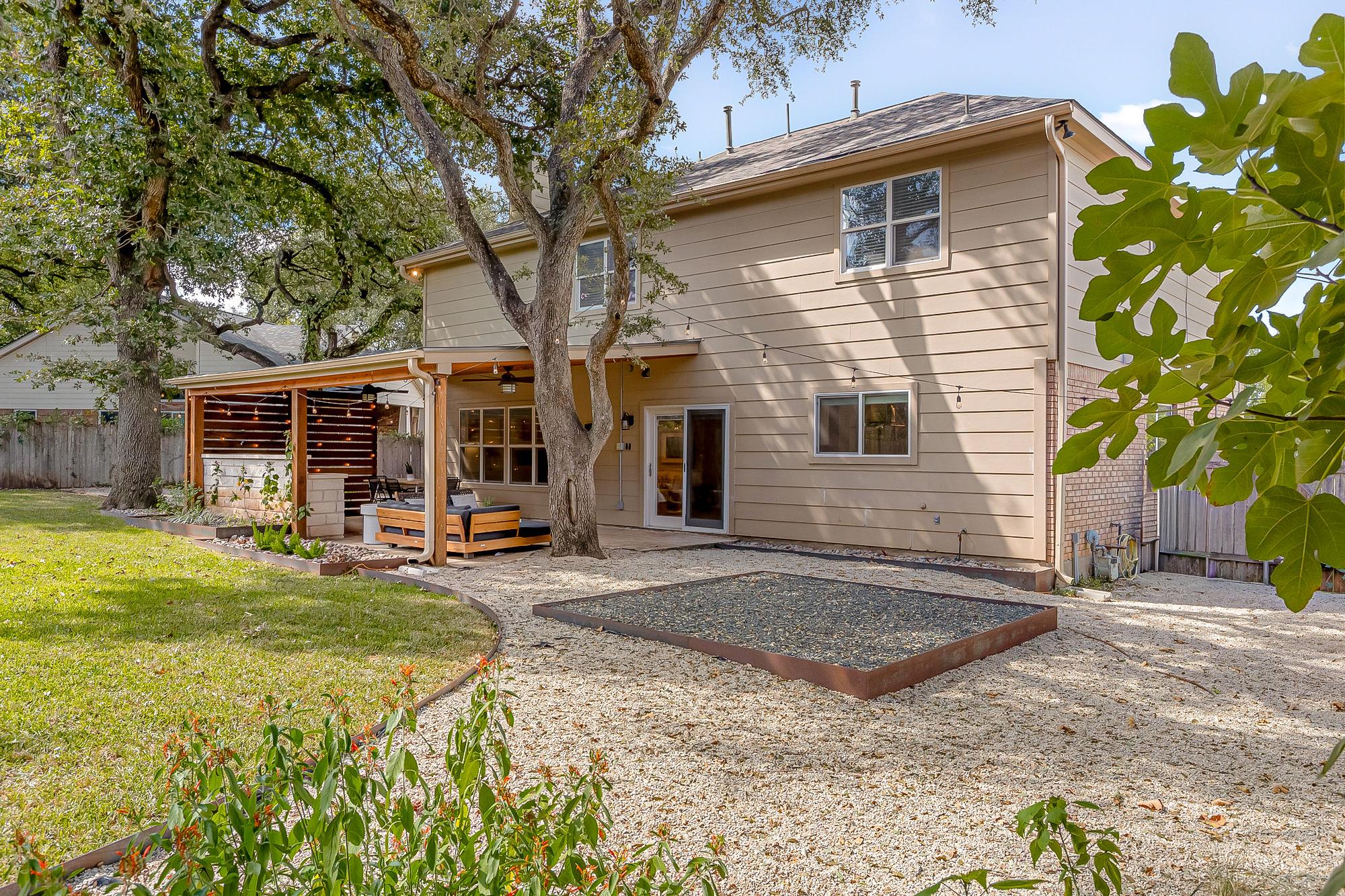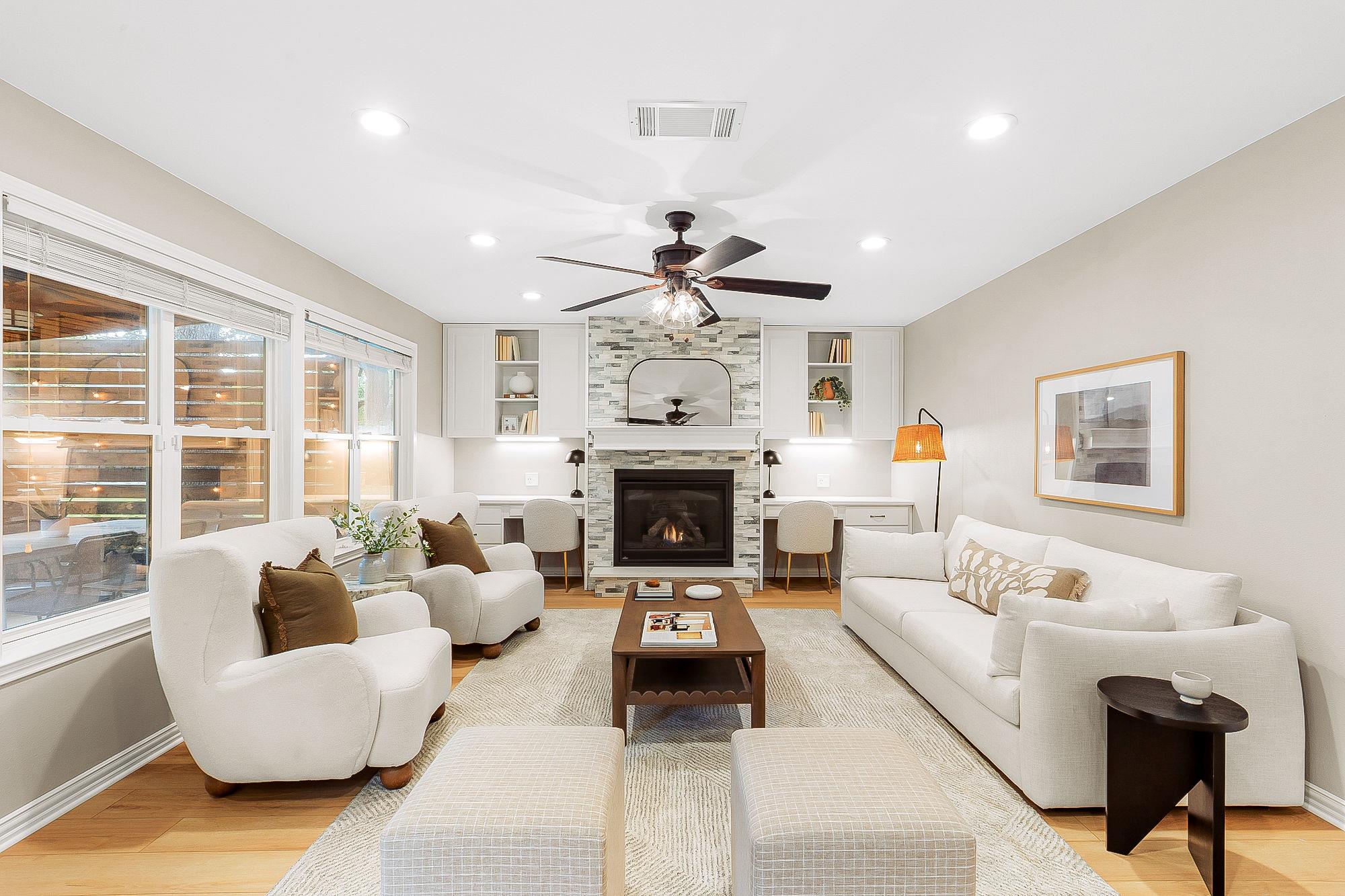 This beautifully refreshed home features newly installed flooring, multiple living spaces and an incredible backyard complete with an outdoor grilling oasis! Elegant white oak style flooring on the main level and staircase creates an inviting and updated space. The open-concept kitchen and living areas create a bright, inviting atmosphere perfect for both everyday living and entertaining. You'll love the cozy fireplace surrounded by built-ins and desk areas! The beautifully updated kitchen showcases stylish finishes, ample counter space, stainless appliances, gas cooktop, double ovens and excellent cabinet storage. Additional bar seating at the island opens seamlessly to the living and dining areas. Fabulous layout! Upstairs, the renovated primary bathroom offers a spa-like retreat with contemporary upgrades including a frameless glass walk-in shower, double vanity, amazing built-in storage and closet space. Secondary bedrooms all have recent ceiling fans and great closet storage. Additional updates: all new plush carpet upstairs! Step outside to an extended covered patio with an amazing grilling and dining area -- ideal for hosting friends or enjoying quiet evenings at home. The fully fenced backyard has been thoughtfully designed and maintained with custom landscaping, offering a private and tranquil setting to relax or entertain year round. Additional peace of mind comes with a new roof and HVAC system, both replaced in 2024. Amazing location with many neighborhood amenities including parks, playgrounds, pool, community center, sports courts and more. With its modern updates, functional layout and inviting outdoor spaces you can move right in and start living!
