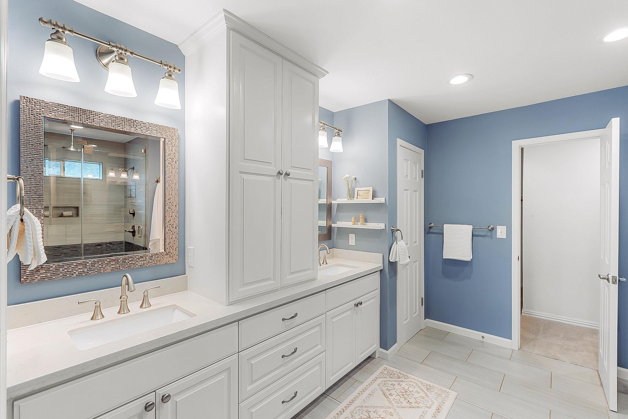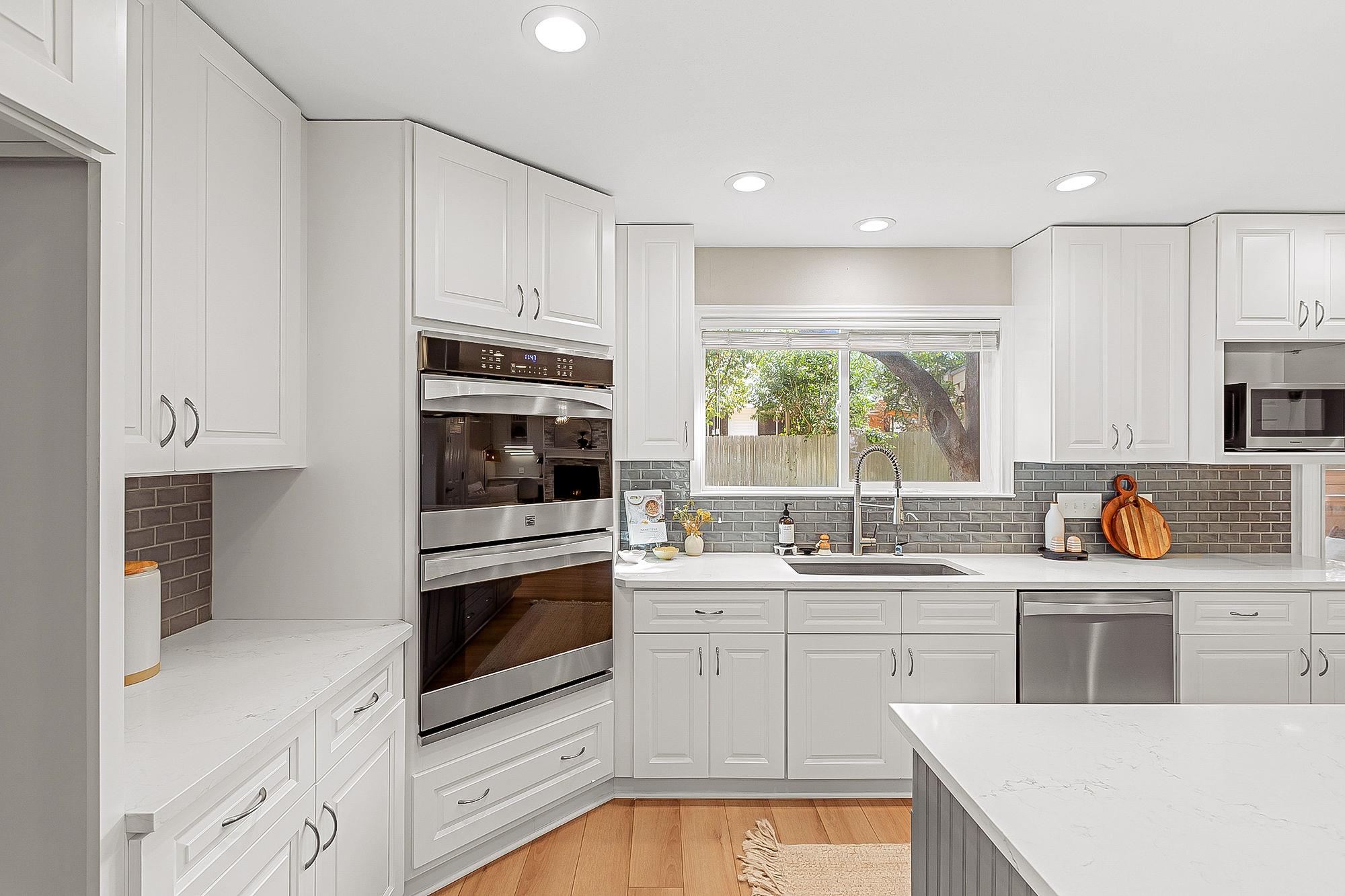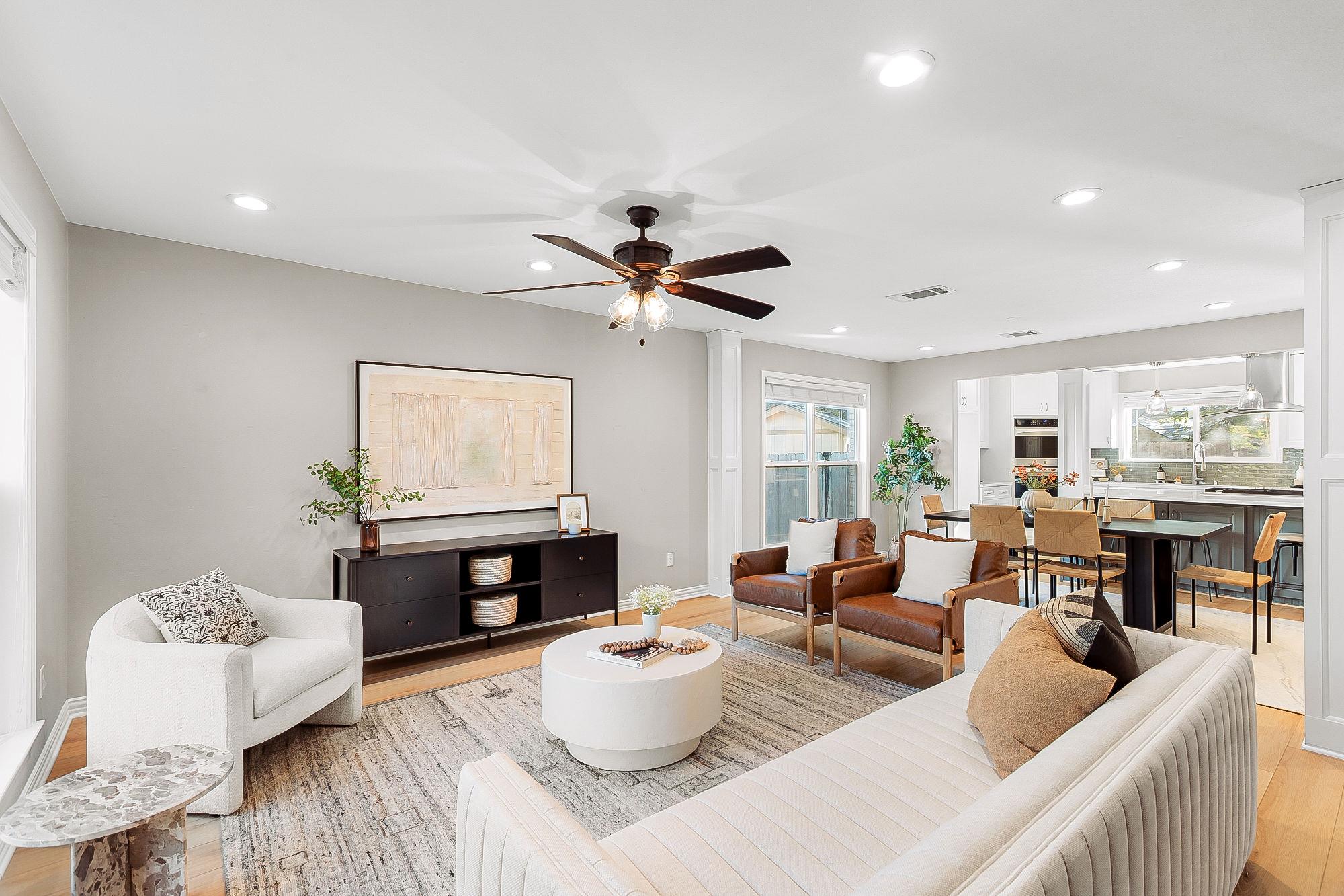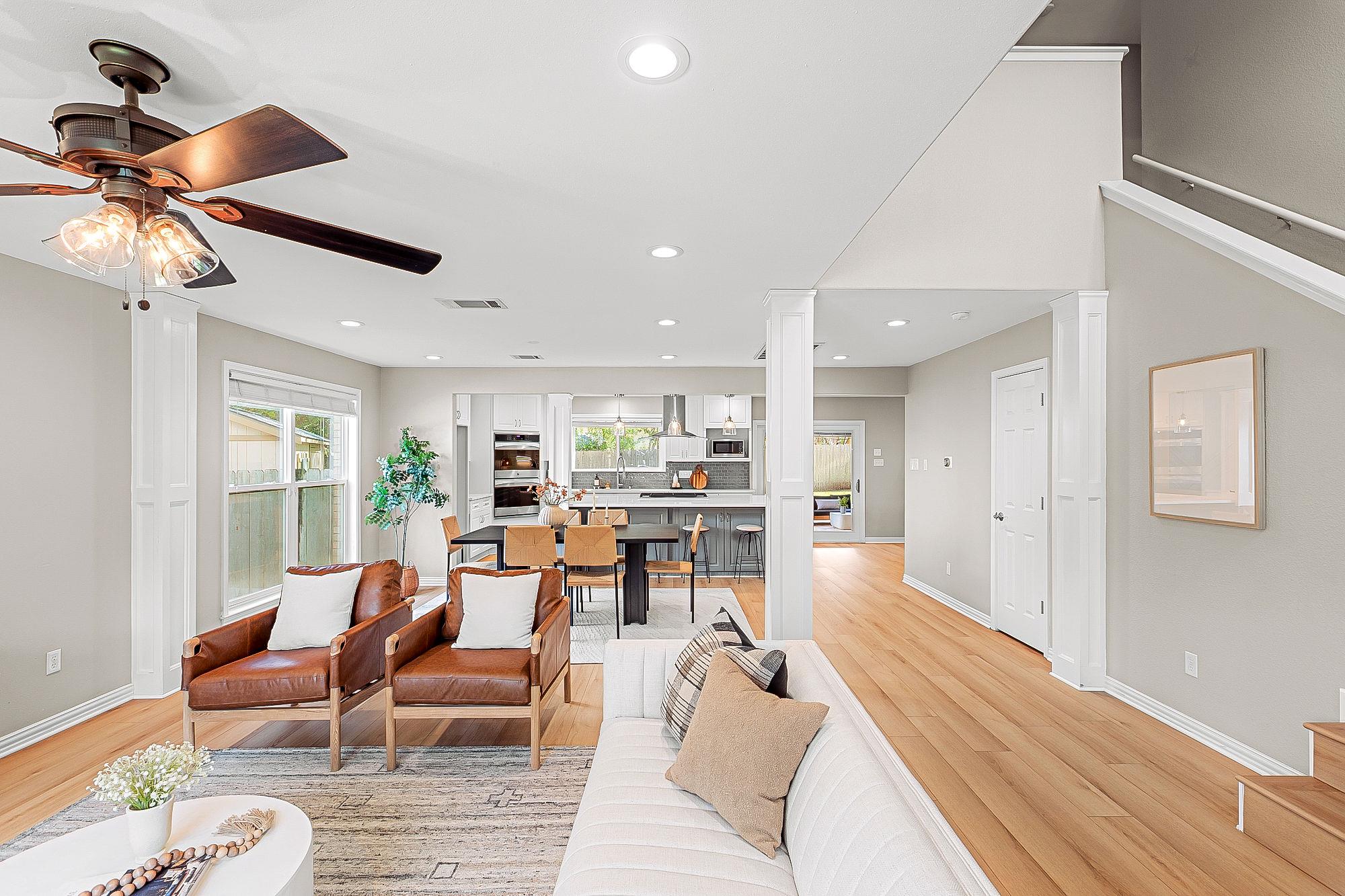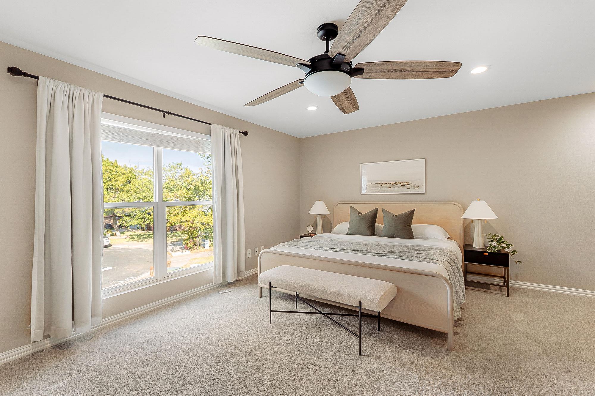 This beautifully refreshed home features newly installed flooring, multiple living spaces and an incredible backyard complete with an outdoor grilling oasis! Elegant white oak style flooring on the main level and staircase creates an inviting and updated space. The open-concept kitchen and living areas create a bright, inviting atmosphere perfect for both everyday living and entertaining. You'll love the cozy fireplace surrounded by built-ins and desk areas! The beautifully updated kitchen showcases stylish finishes, ample counter space, stainless appliances, gas cooktop, double ovens and excellent cabinet storage. Additional bar seating at the island opens seamlessly to the living and dining areas. Fabulous layout! Upstairs, the renovated primary bathroom offers a spa-like retreat with contemporary upgrades including a frameless glass walk-in shower, double vanity, amazing built-in storage and closet space. Secondary bedrooms all have recent ceiling fans and great closet storage. Additional updates: all new plush carpet upstairs! Step outside to an extended covered patio with an amazing grilling and dining area -- ideal for hosting friends or enjoying quiet evenings at home. The fully fenced backyard has been thoughtfully designed and maintained with custom landscaping, offering a private and tranquil setting to relax or entertain year round. Additional peace of mind comes with a new roof and HVAC system, both replaced in 2024. Amazing location with many neighborhood amenities including parks, playgrounds, pool, community center, sports courts and more. With its modern updates, functional layout and inviting outdoor spaces you can move right in and start living!