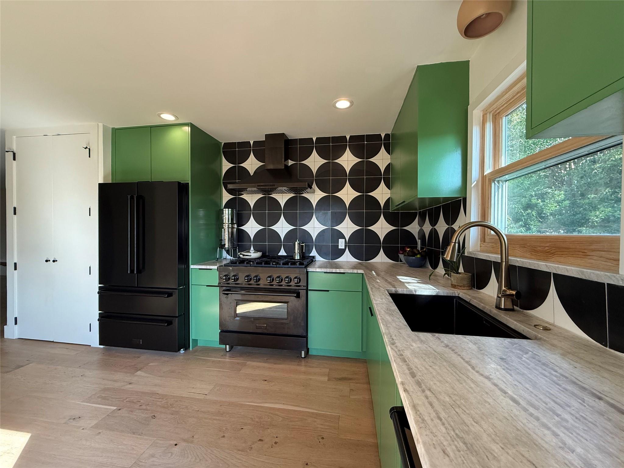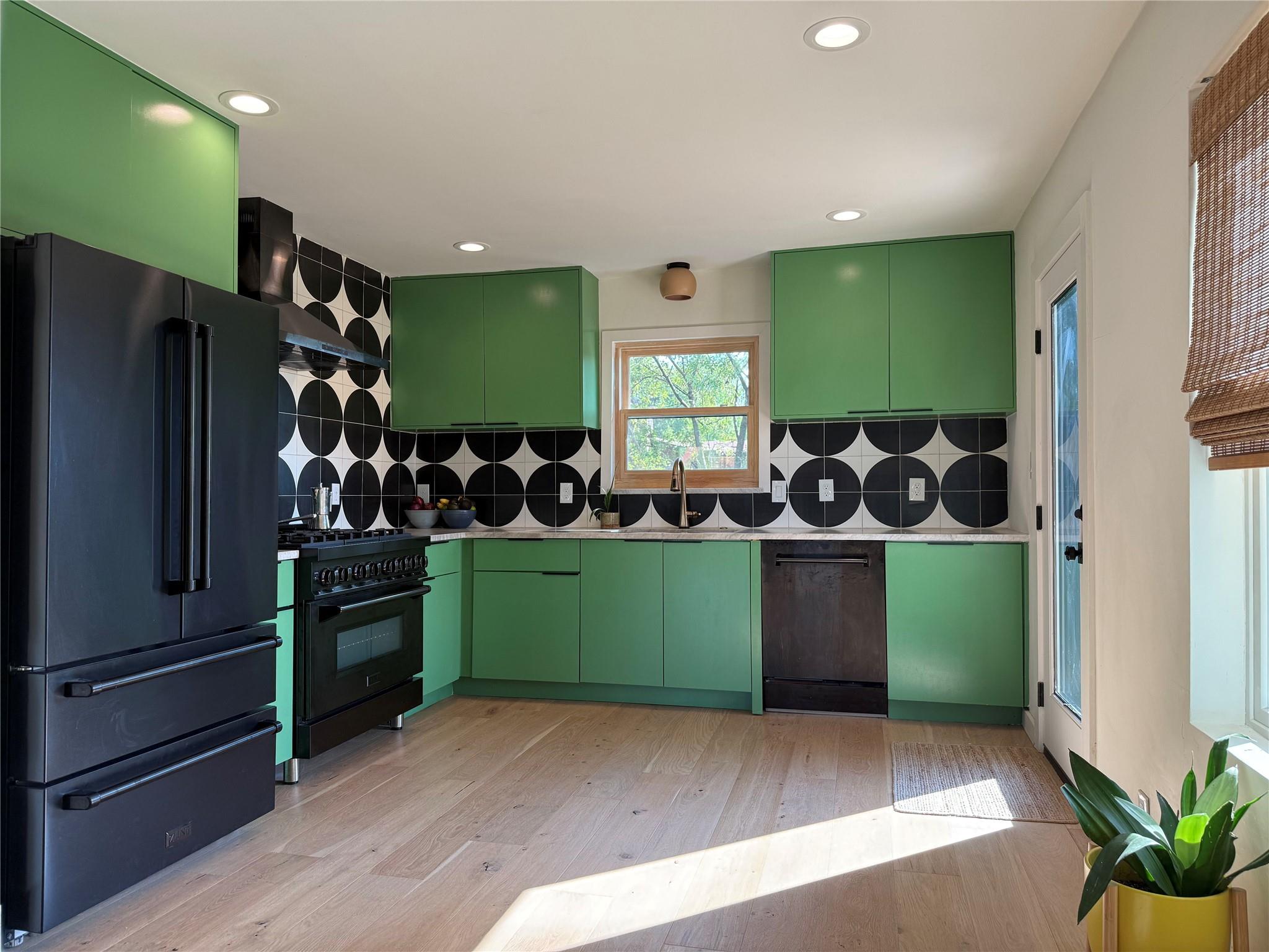 Wake up to sunlit rooms framed by smooth-finish walls, beamed ceilings, and warm wood details. The open layout flows effortlessly for gathering, entertaining, or simply enjoying slow mornings with coffee and city views. The chef's kitchen anchors the home with handmade tile, matte quartzite counters, and a professional 36" gas range--perfect for dinner parties or late-night creative cooking.