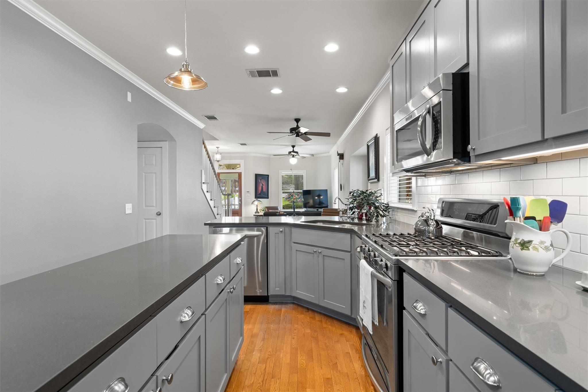 In the heart of 78704, this 3-bedroom, 2.5-bath home delivers modern comfort wrapped in South Austin charm. A grand red oak greets you out front, shading a modern take on a Victorian cottage, playful turret and charming porch trim included. Inside, the layout is open and welcoming. Wood floors and high ceilings carry through the open living and dining area, anchored by a kitchen that impresses with polished gray quartz countertops, subway tile backsplash, a center island, and a breakfast bar. Stainless steel appliances tie the look together. The spacious primary suite sits quietly at the back of the home, with backyard views and a sliding barn door leading to an ensuite bath. Echoing the kitchen's clean lines and modern edge, the ensuite features dual vanities, gray quartz counters, and an oversized walk-in shower with dual shower heads. Upstairs, two secondary bedrooms and a full bath offer plenty of flexibility for guests, work, or creative space. The backyard is made for relaxing and gathering, a raised deck rests under the canopy of a century-old oak while mature trees beyond the fence add shade and privacy, creating a backyard retreat that makes you forget you are in the city. But what really sets this home apart is the location. Then there's the location: one of South Austin's most walkable, dog-friendly pockets. Grab your morning coffee at Summer Moon or Radio Coffee & Beer, walk to Galindo Elementary, stroll to nearby parks, or bike to Zilker, Barton Springs, or the Greenbelt in minutes. Groceries, dining, and local favorites on South Lamar and South 1st are just around the corner, with easy access to St. Edward's, St. David's South, and major highways for commuting. Living here means the eclectic, laid-back vibe that defines 78704 living, is right outside your doorstep. Roof replaced, July 2024