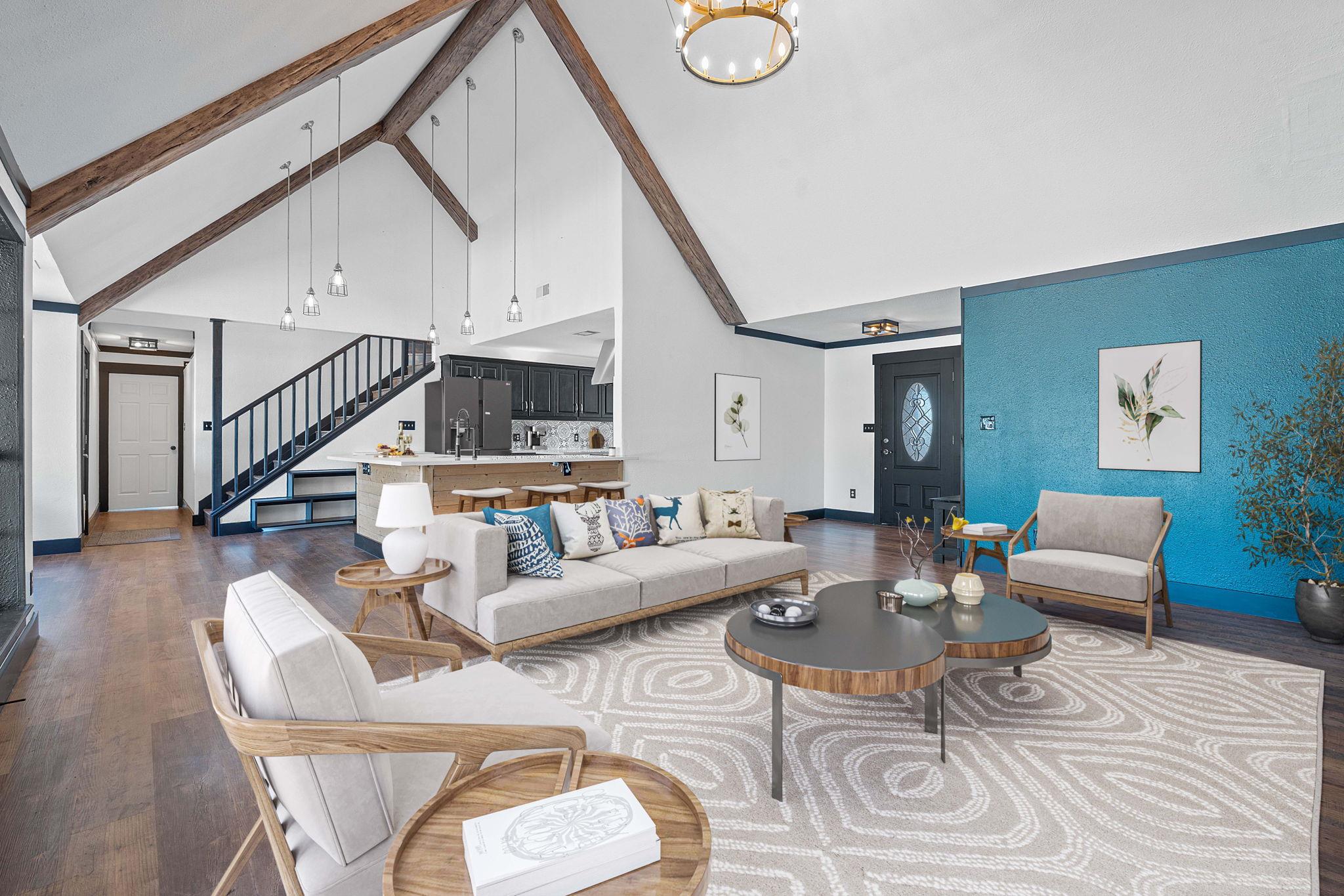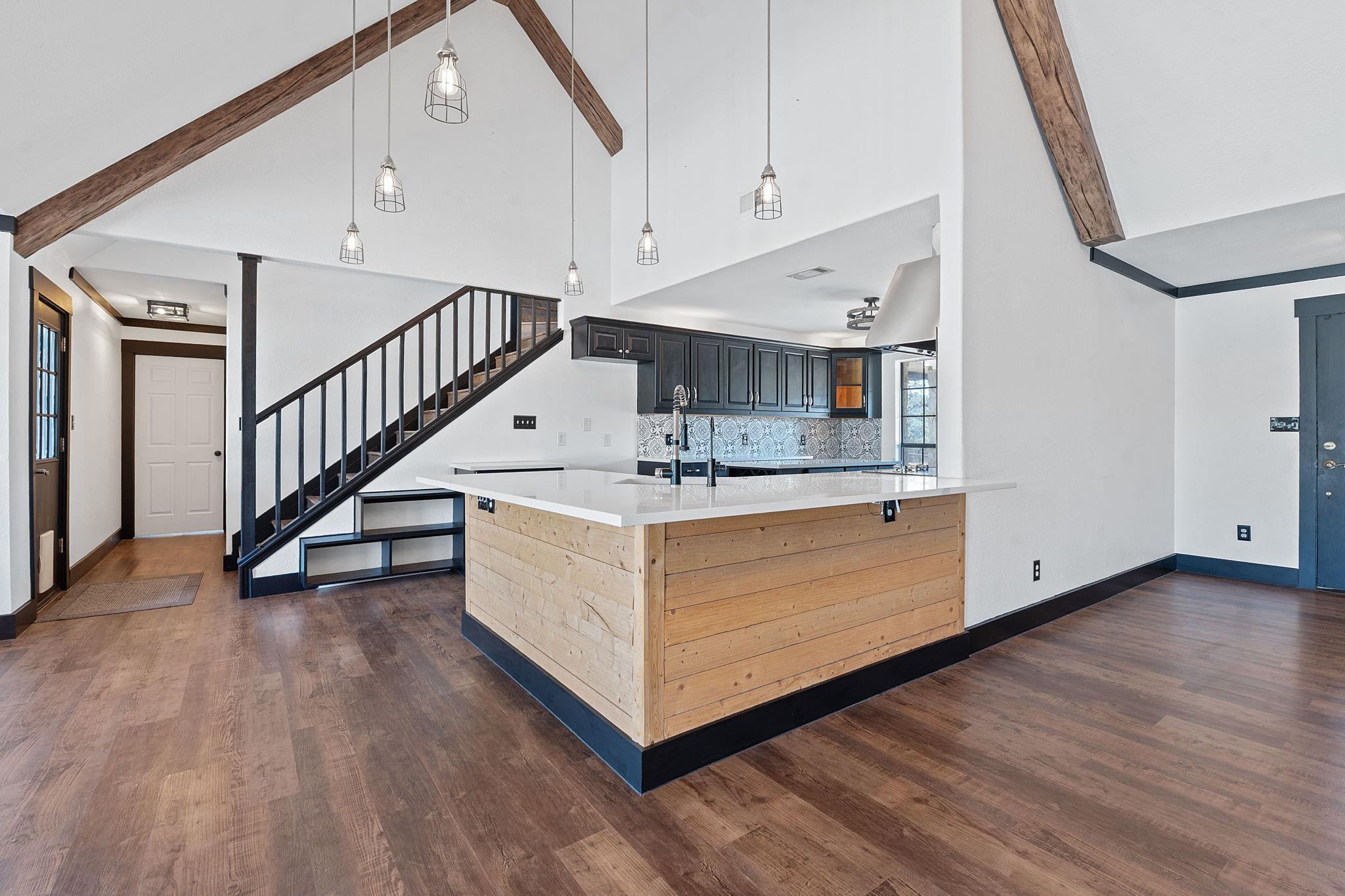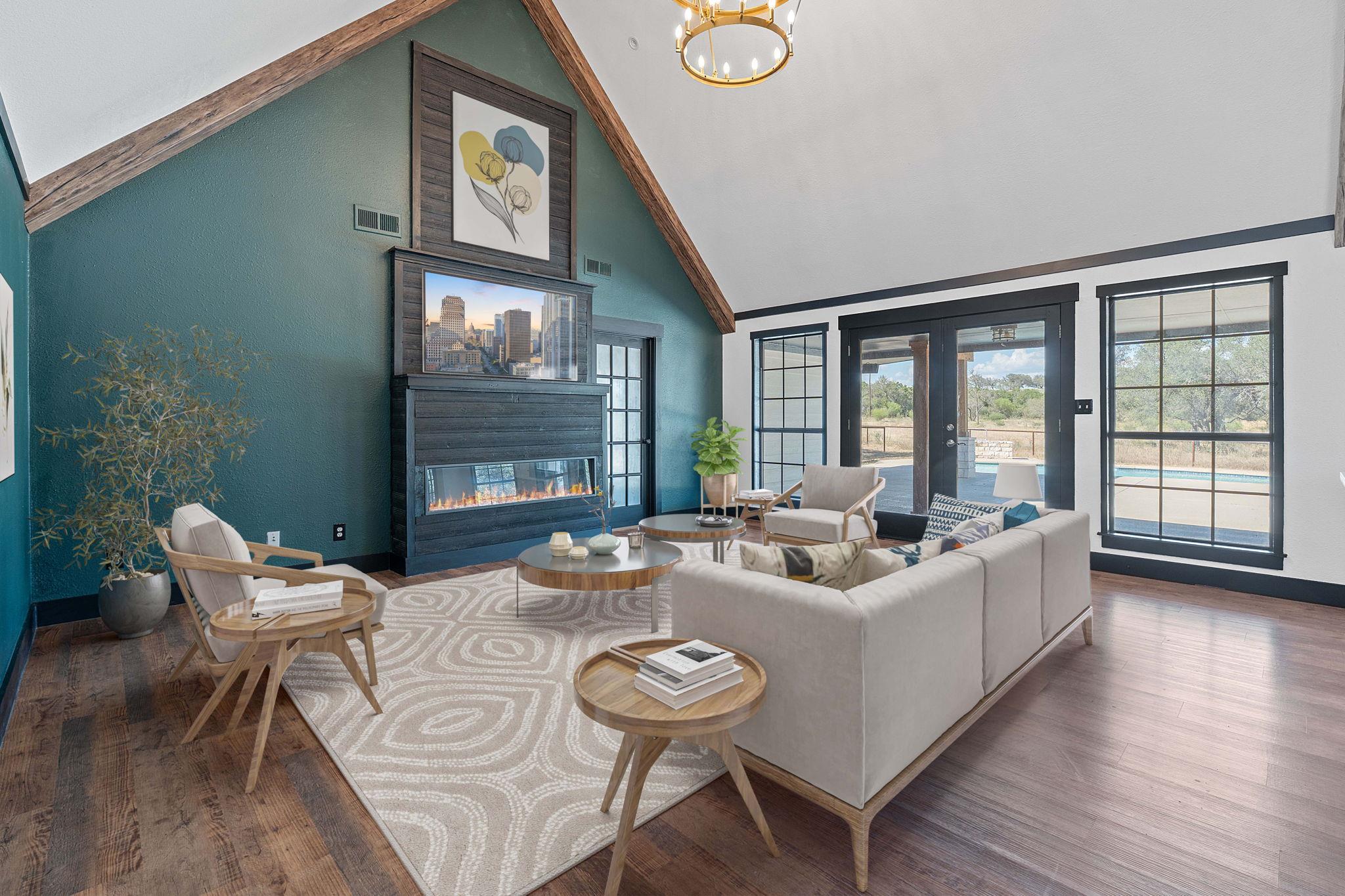 Inside, the custom home features soaring vaulted ceilings with exposed wood beams and a striking reclaimed-wood fireplace as the centerpiece of the living room. The gourmet kitchen showcases a large vent hood, double ovens, center island, abundant counter space, and an oversized breakfast bar--perfect for entertaining. The layout includes two primary suites on the main level, providing exceptional flexibility for multi-generational living or guest accommodations. Large "Texas Basement" on the second level perfect for a media room or secondary living area.