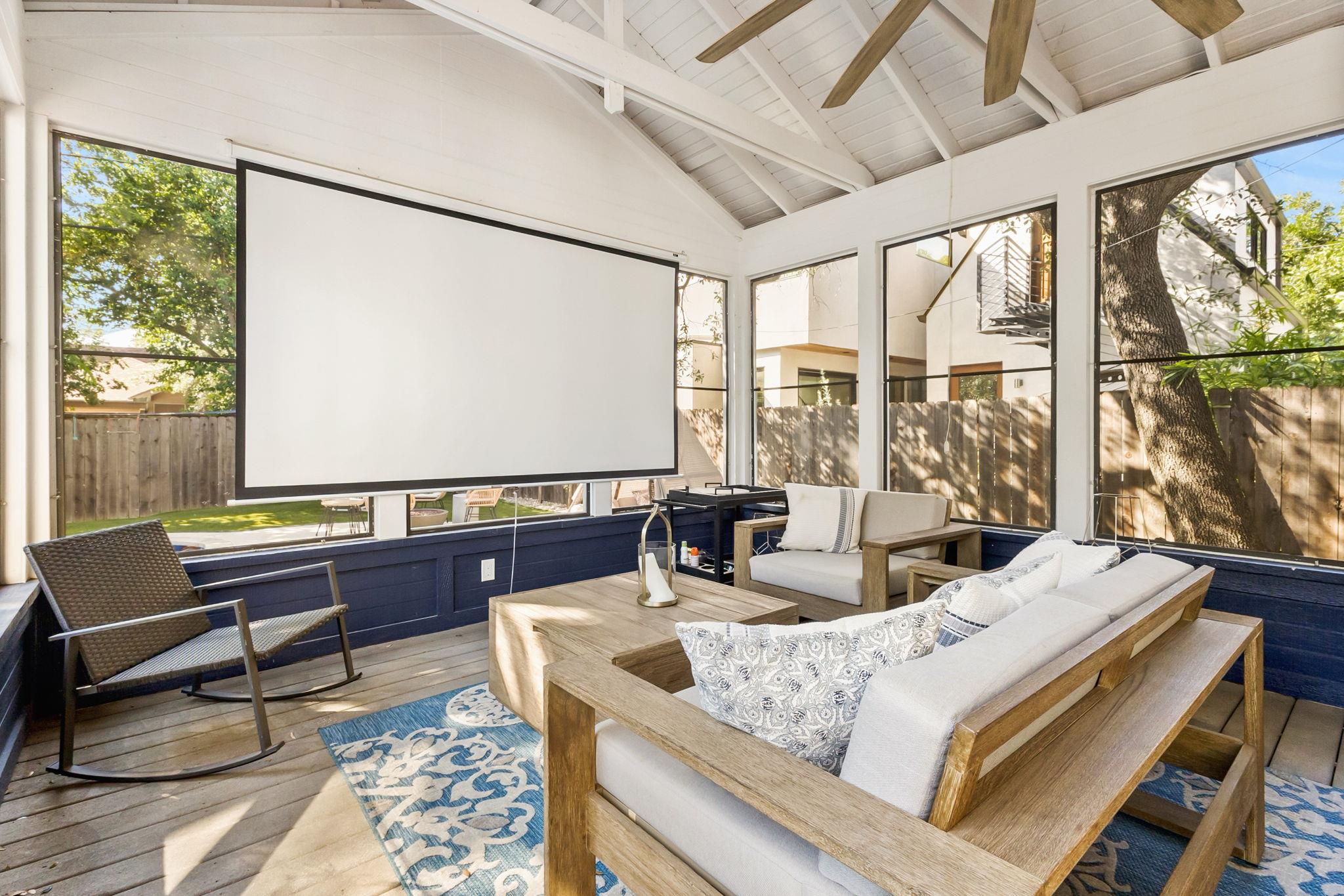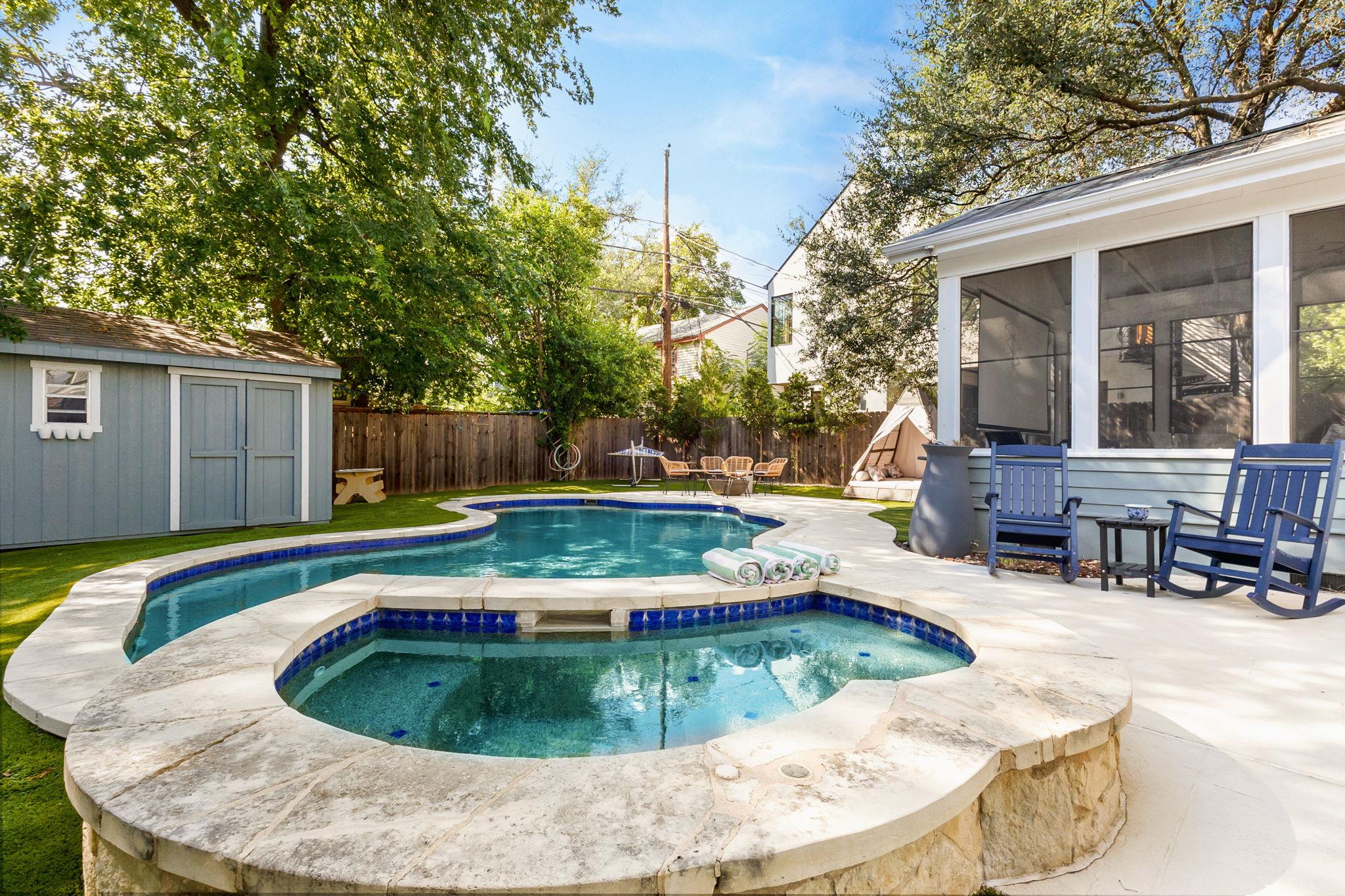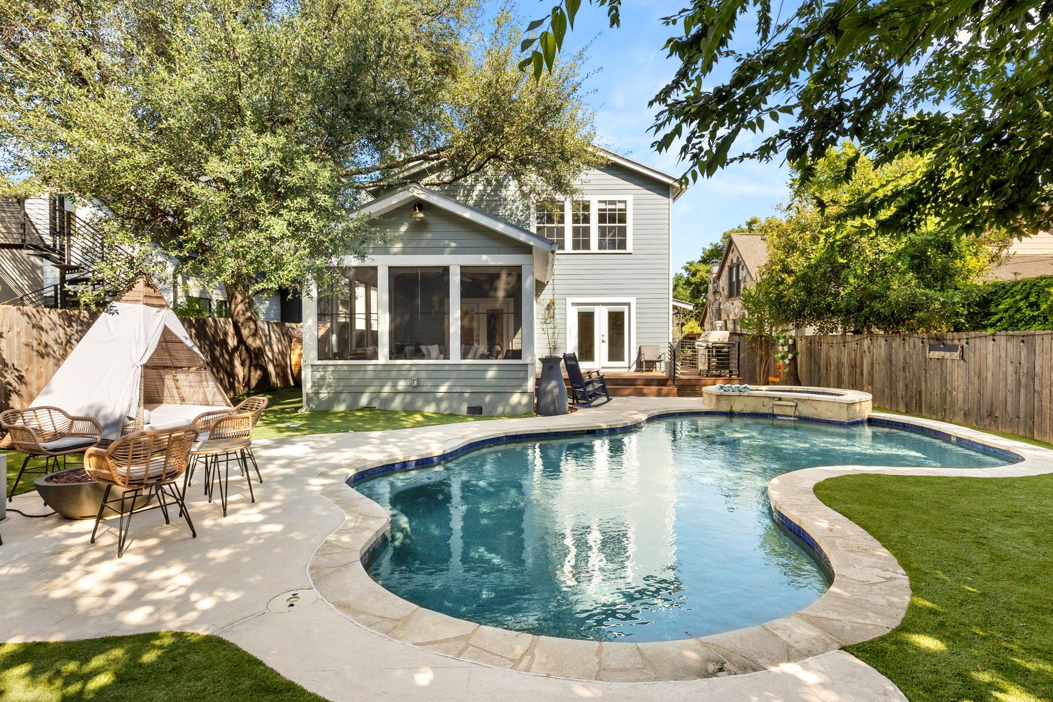 The screened-in back porch doubles is the perfect oasis to enjoy morning coffee or dinner with friends while the backyard features a stunning heated pool, hot tub, cedar sauna, putt putt area, rock climbing wall, and easy to maintain landscaping and turf grass.