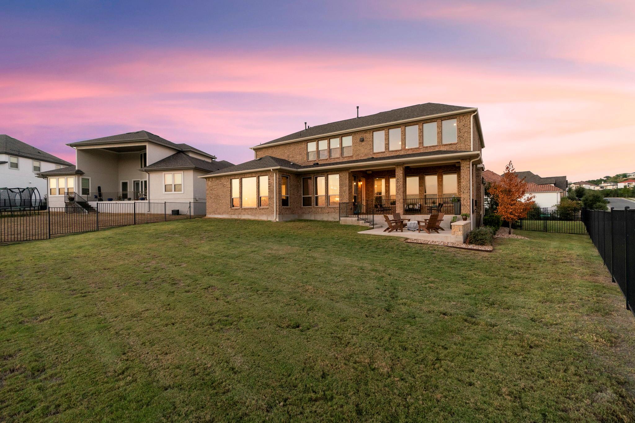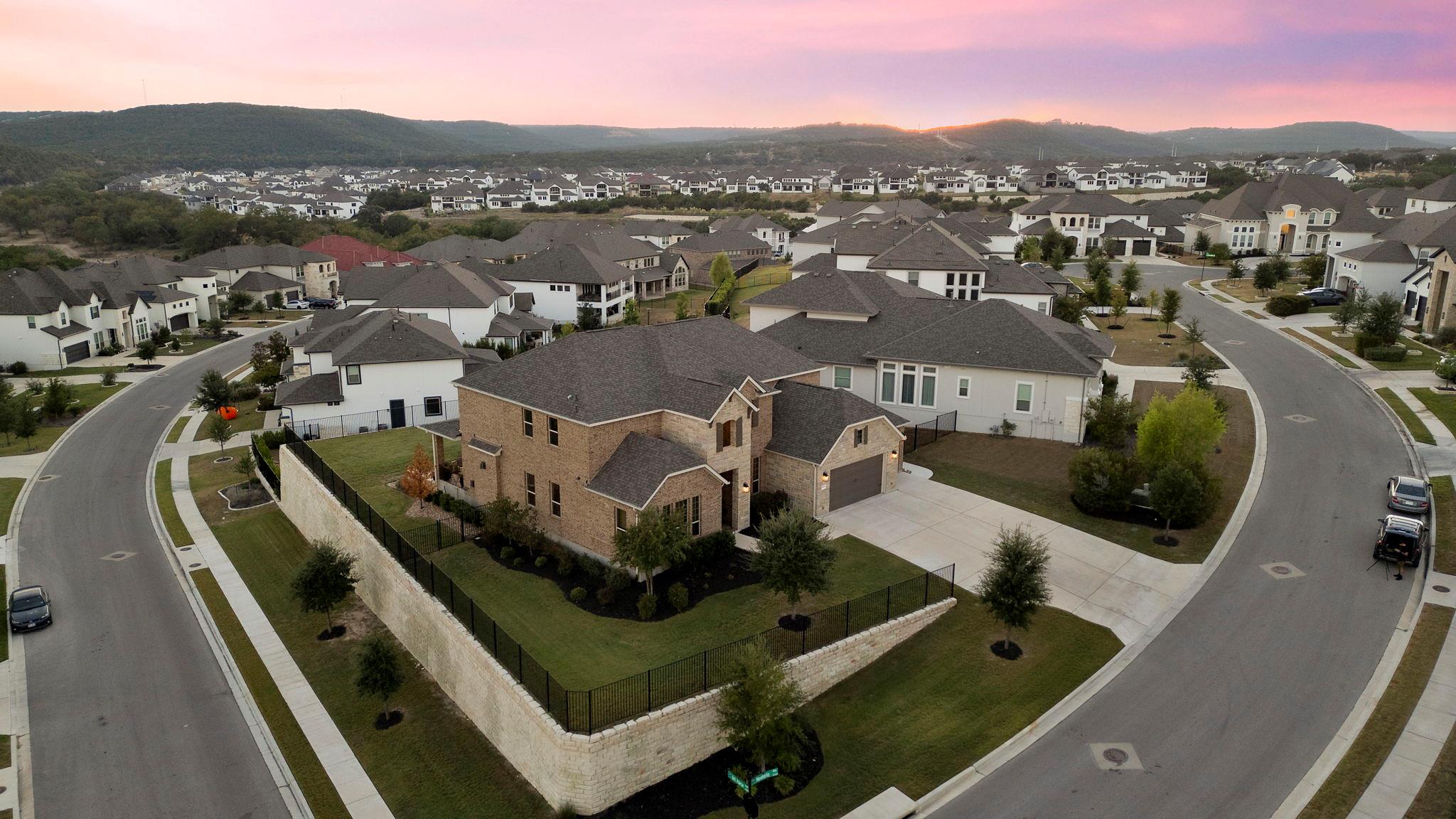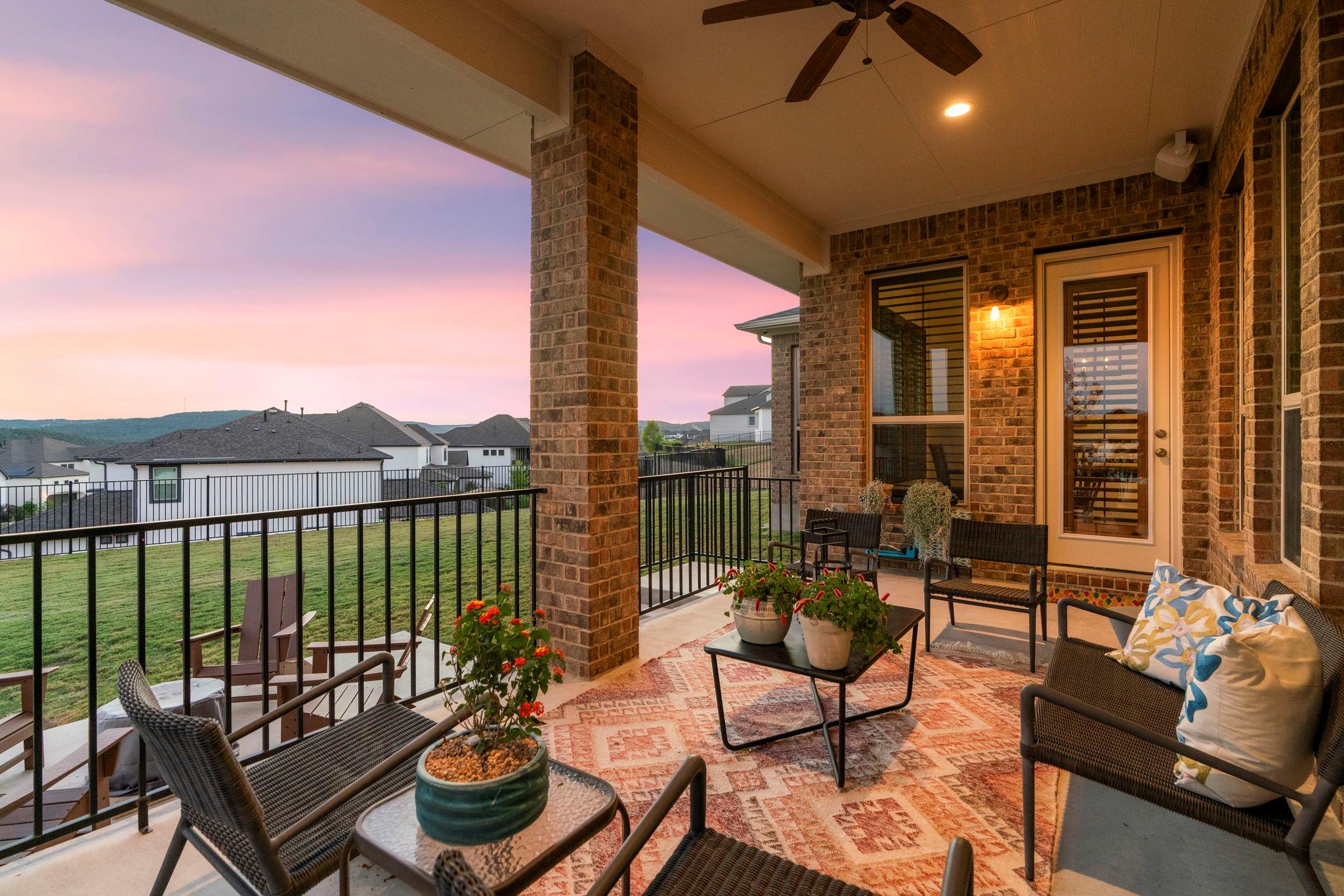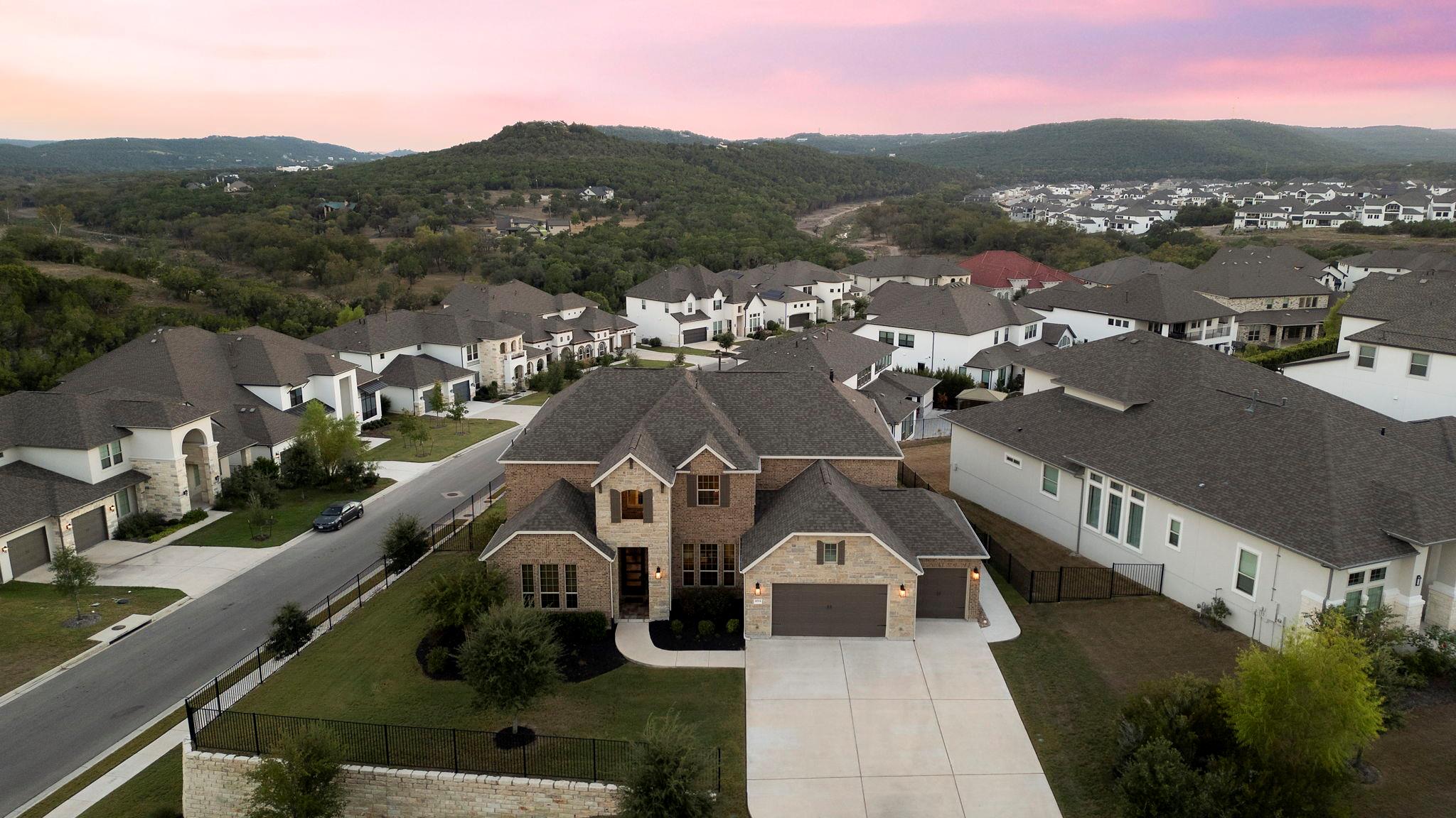 Sitting on a spacious, level northeast-facing lot, this stunning Taylor Morrison Calypso home offers breathtaking Hill Country views from the backyard. Elevated above street level, this corner lot offers enhanced privacy, creating a secluded oasis in the backyard. The home features elegant solid oak flooring throughout the main level, the home welcomes you with a soaring entry foyer and an impressive two-story great room filled with natural light.