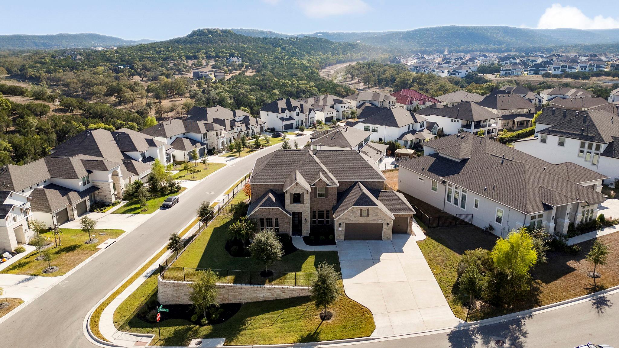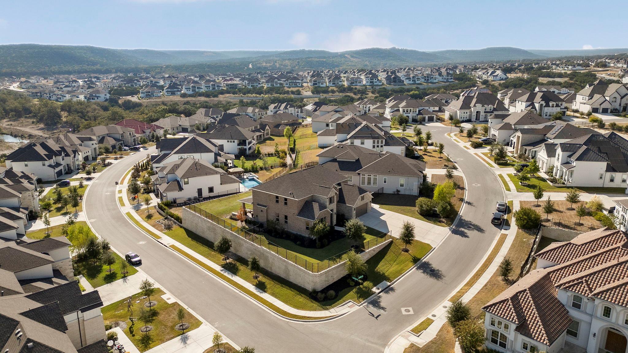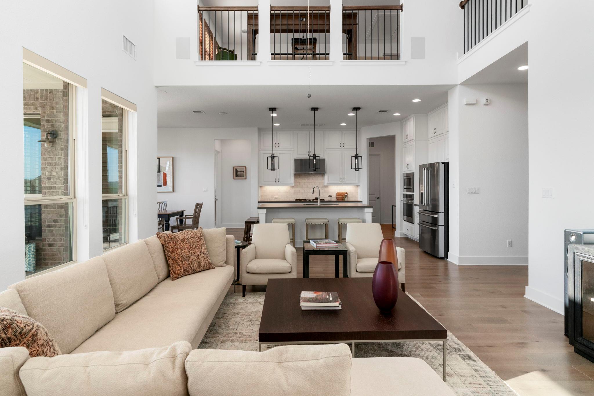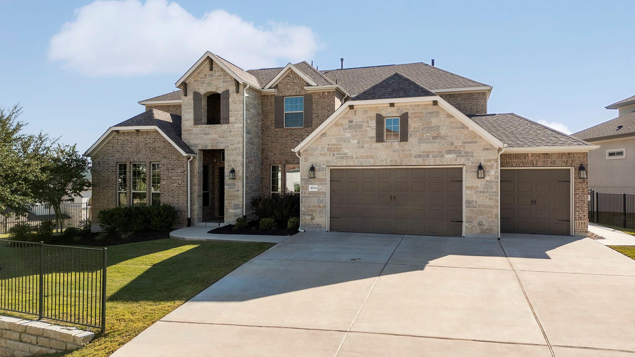 Sitting on a spacious, level northeast-facing lot, this stunning Taylor Morrison Calypso home offers breathtaking Hill Country views from the backyard. Elevated above street level, this corner lot offers enhanced privacy, creating a secluded oasis in the backyard. The home features elegant solid oak flooring throughout the main level, the home welcomes you with a soaring entry foyer and an impressive two-story great room filled with natural light.