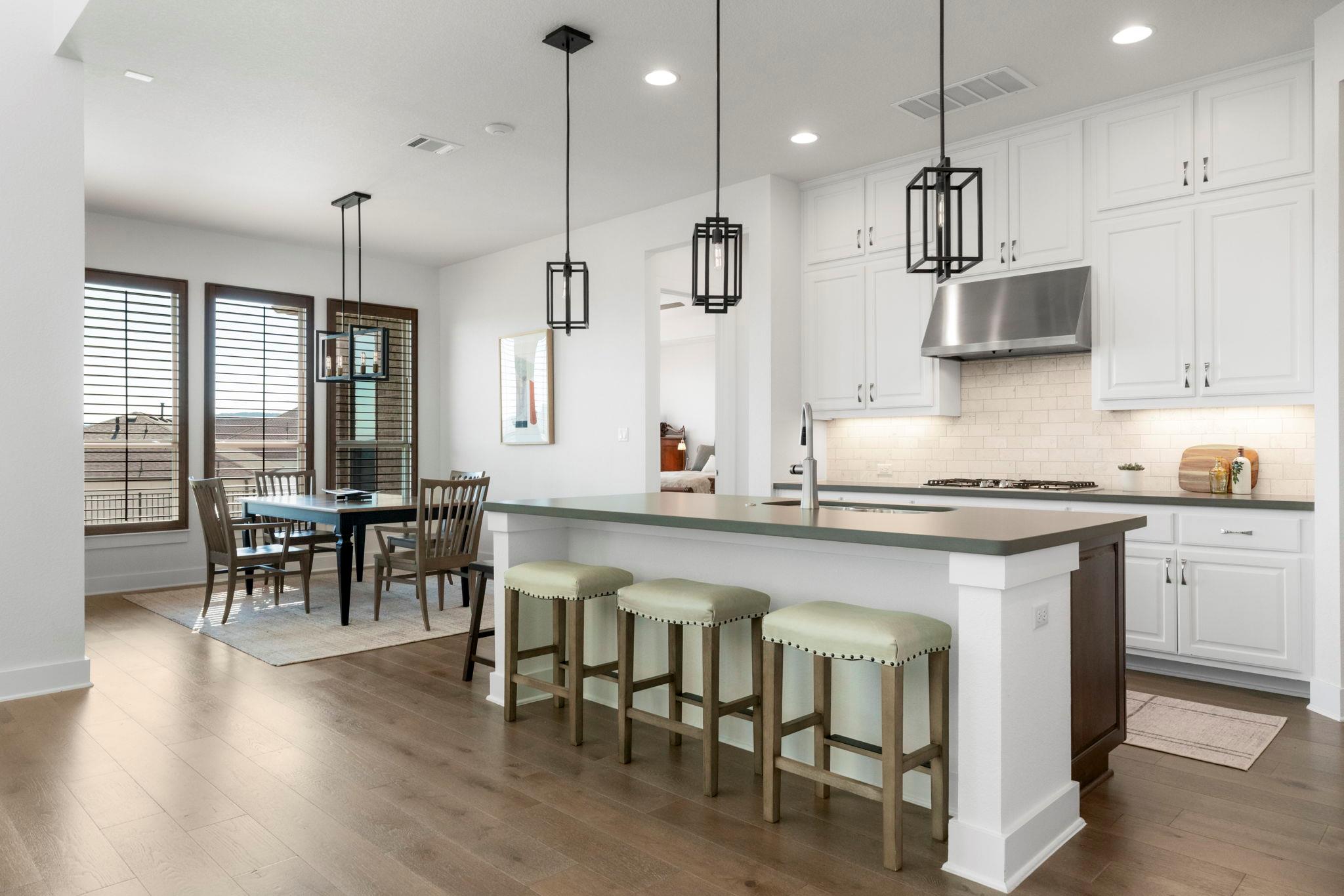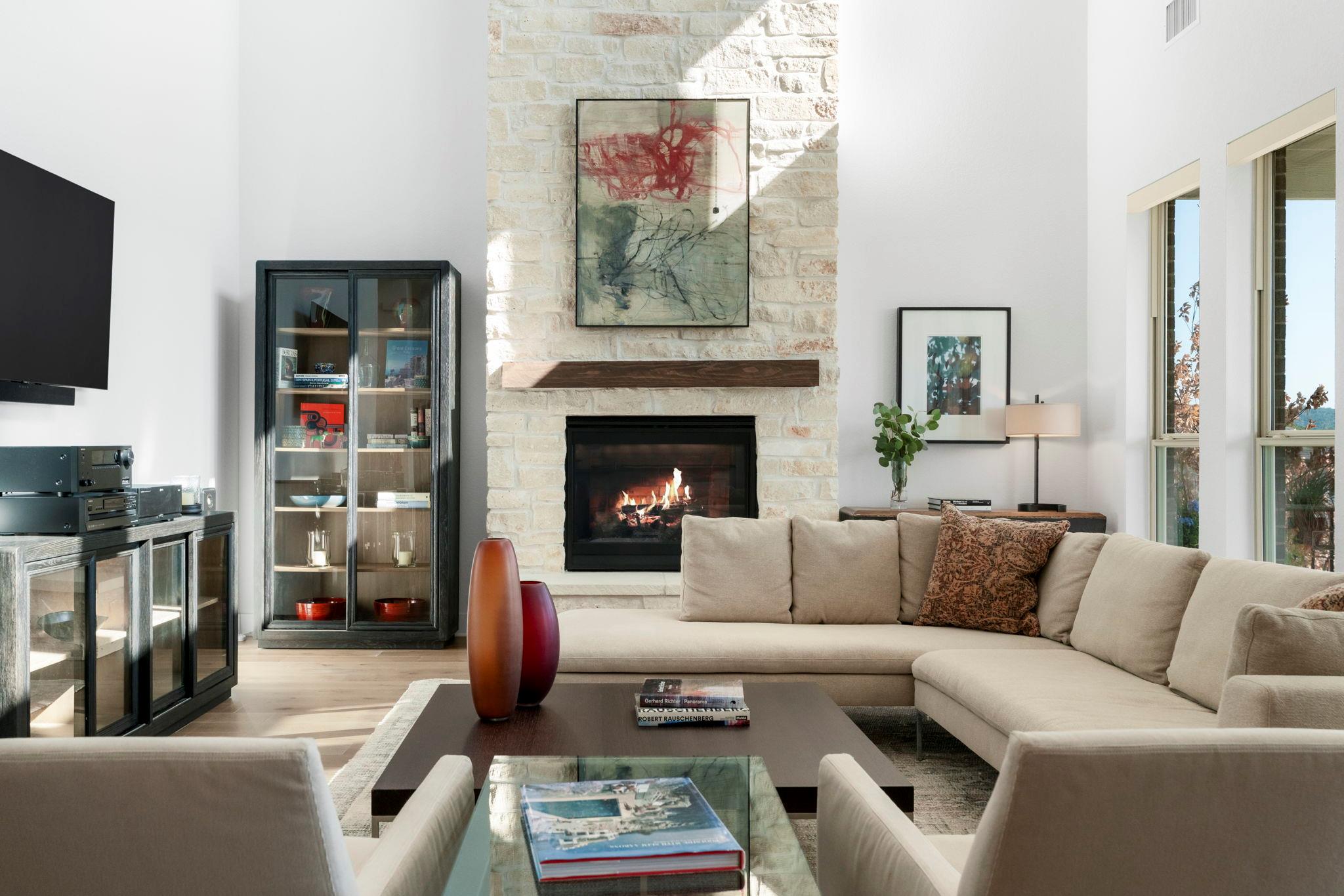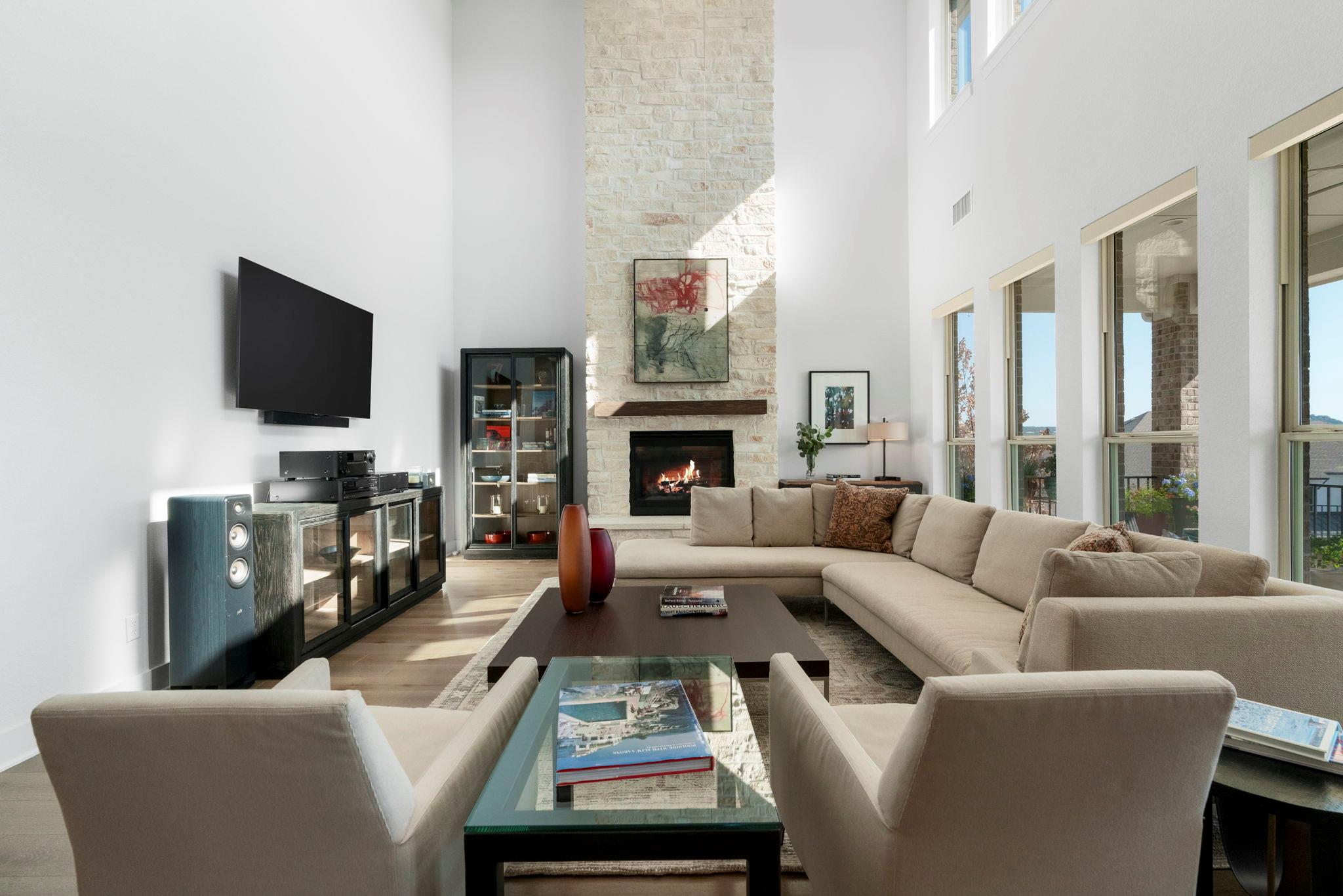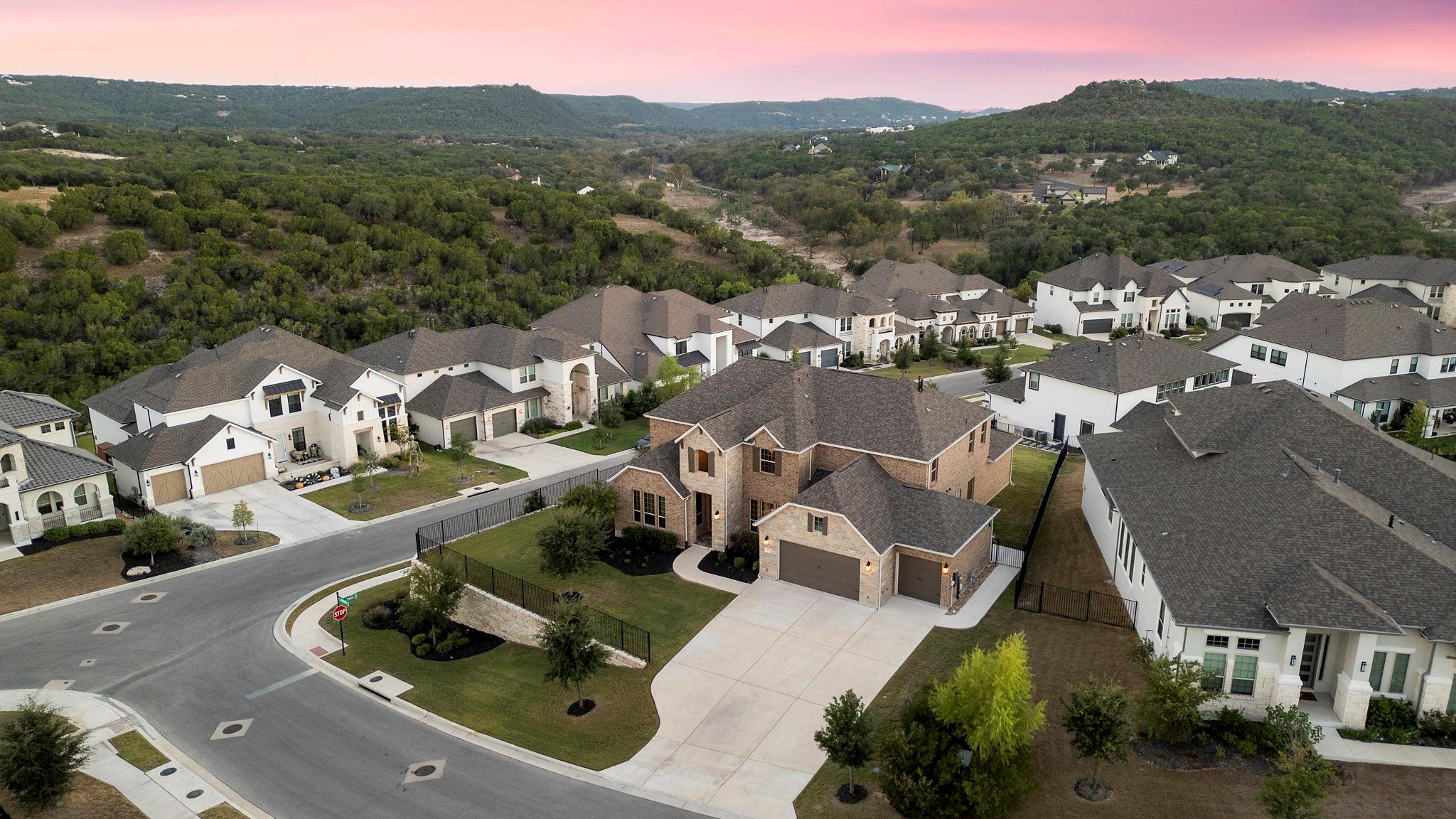 Sitting on a spacious, level northeast-facing lot, this stunning Taylor Morrison Calypso home offers breathtaking Hill Country views from the backyard. Elevated above street level, this corner lot offers enhanced privacy, creating a secluded oasis in the backyard. The home features elegant solid oak flooring throughout the main level, the home welcomes you with a soaring entry foyer and an impressive two-story great room filled with natural light.