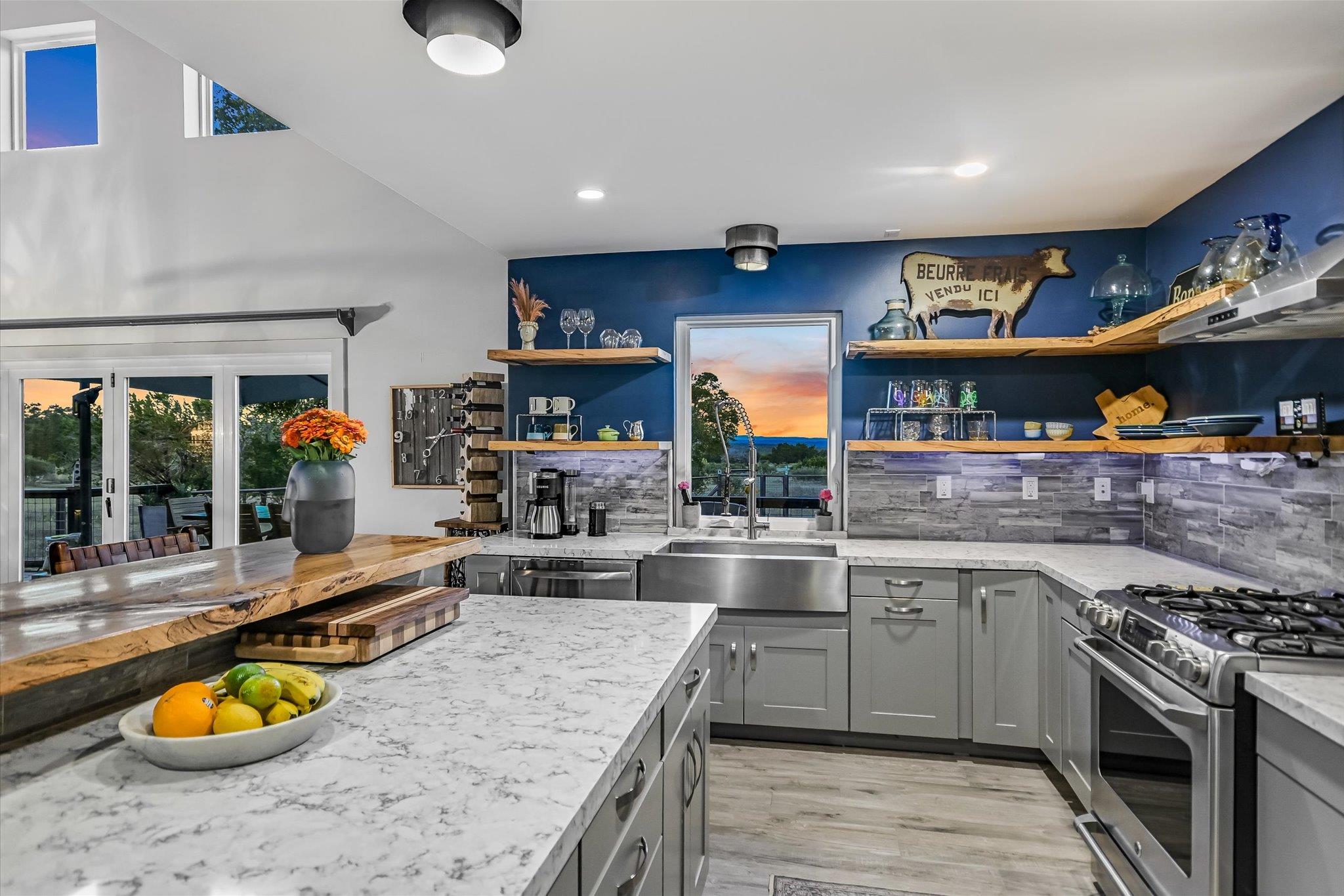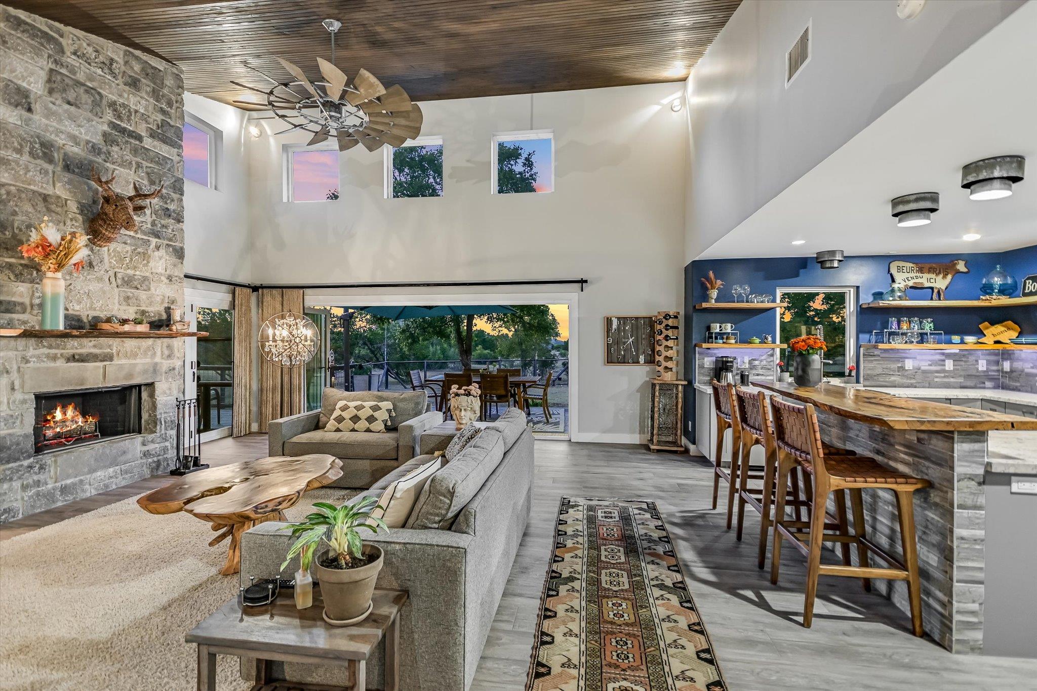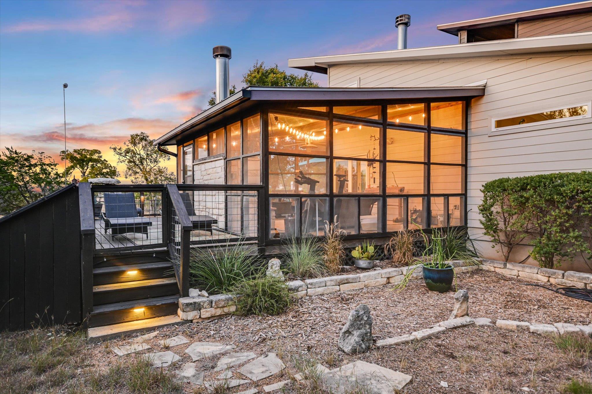 Experience Hill Country living at its finest in this modern 2-home Wimberley retreat! The beautiful 3-bedroom, 3-bath main home sits on just under 5 acres of peaceful Texas Hill Country, offering plenty of space, privacy, and charm. The 1, 200 sq ft guest house comes complete with a full kitchen, spacious living room, and one bedroom with dedicated bath, perfect for guests or extended family. The guest house also has a dedicated store room for sports equipment, luggage or seasonal decorations. Attached to the guest house is the dreamiest outdoor living space; a sprawling entertainment area/outdoor kitchen centered around a massive island, ideal for gatherings and sunset dinners. It's perfect for parties featuring a chefs grill, wine cooler and ice machine. Every evening brings a new reason to fall in love with the views, whether you're catching a game under the outdoor pavilion or soaking in those incredible Hill Country sunsets. Inside, the main home blends comfort and style with open living areas, abundant natural light highlighted by an accordion sliding door, live edge counters and mantels and inviting spaces designed for connection. Each secondary bedroom features its own private full bathroom, providing both comfort and convenience for family or guests. When youre ready to venture out, enjoy access to the neighborhood pool within the gated community or take a short drive to the iconic Wimberley Square, known for its charming shops, local restaurants, live music, and small-town hospitality. Every corner of this property is designed for relaxation, entertaining, and embracing the laid-back Wimberley lifestyle where each evening feels like a getaway. After a day of exploring, rinse off in the private outdoor shower under your very own starlit sky.