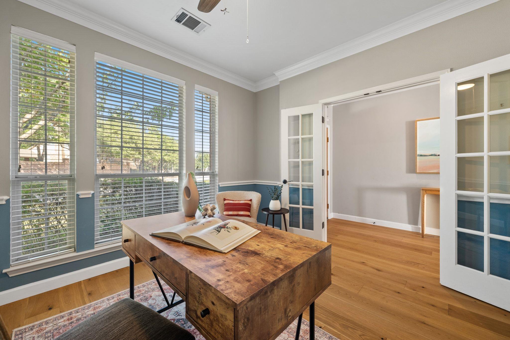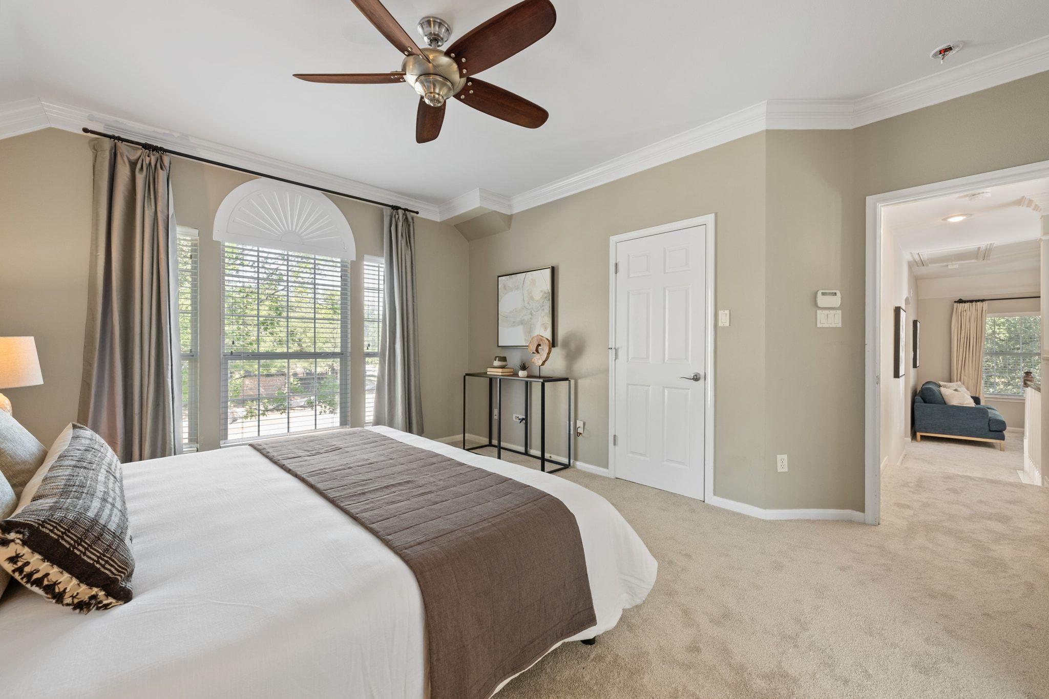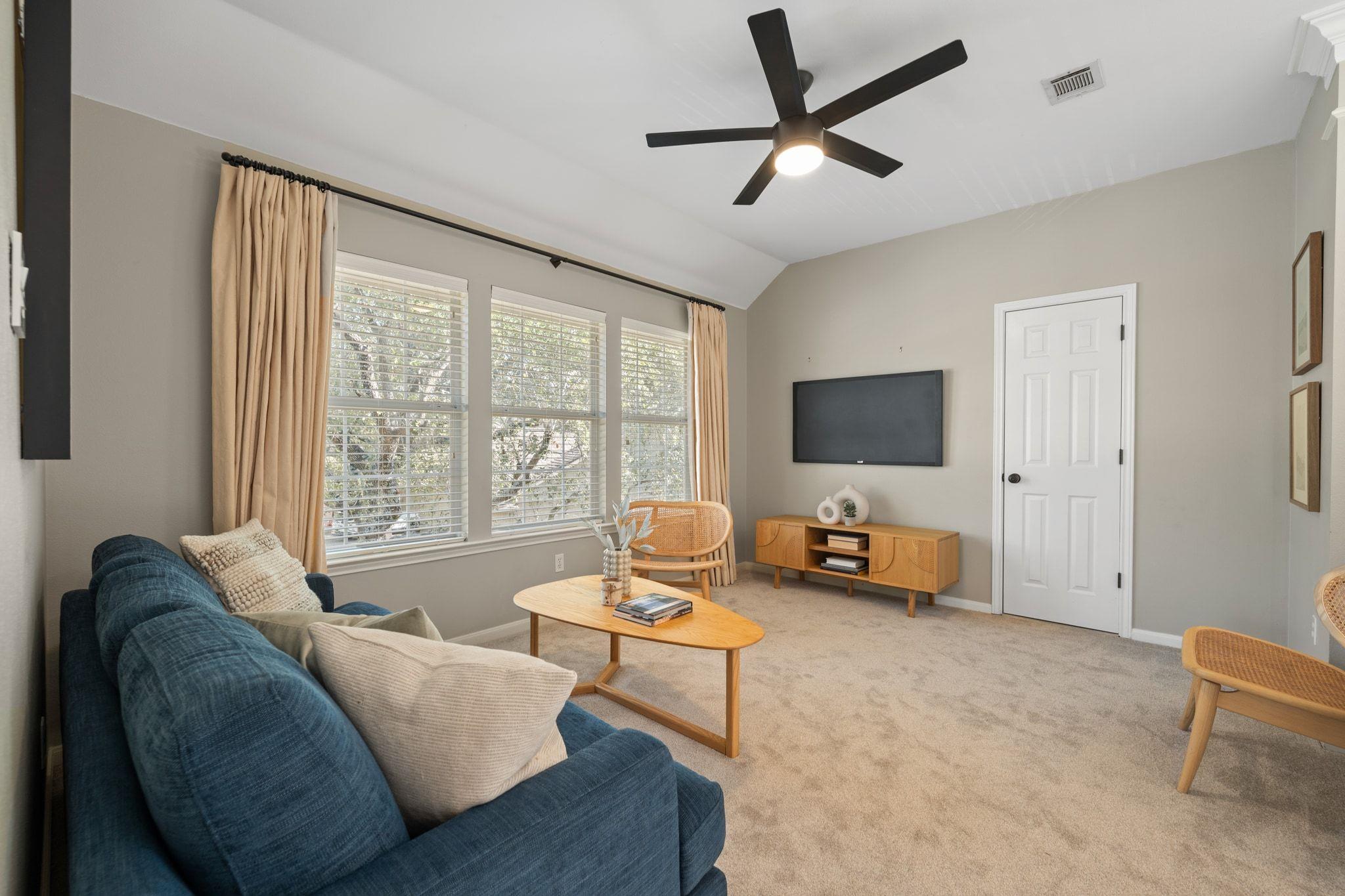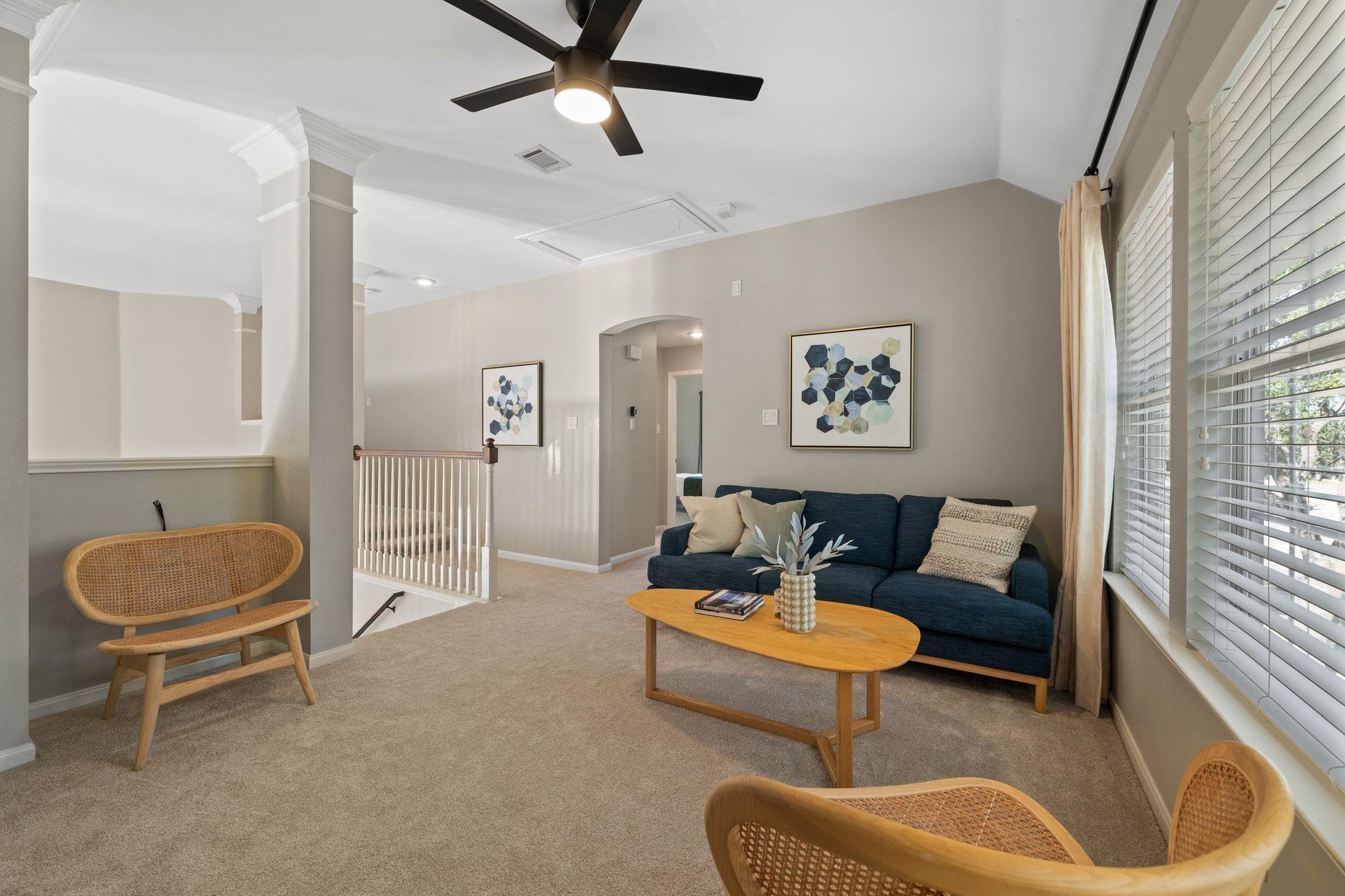 Upstairs has new, lush carpet. There, you'll find a spacious bonus living area with extra storage area ideal for a playroom, extra study, or cozy TV space. The primary suite is bright and airy, with new carpet and a luxurious, remodeled bath featuring a large shower and relaxing soaking tub. There are two additional bedrooms with Elfa shelving and a full bathroom.