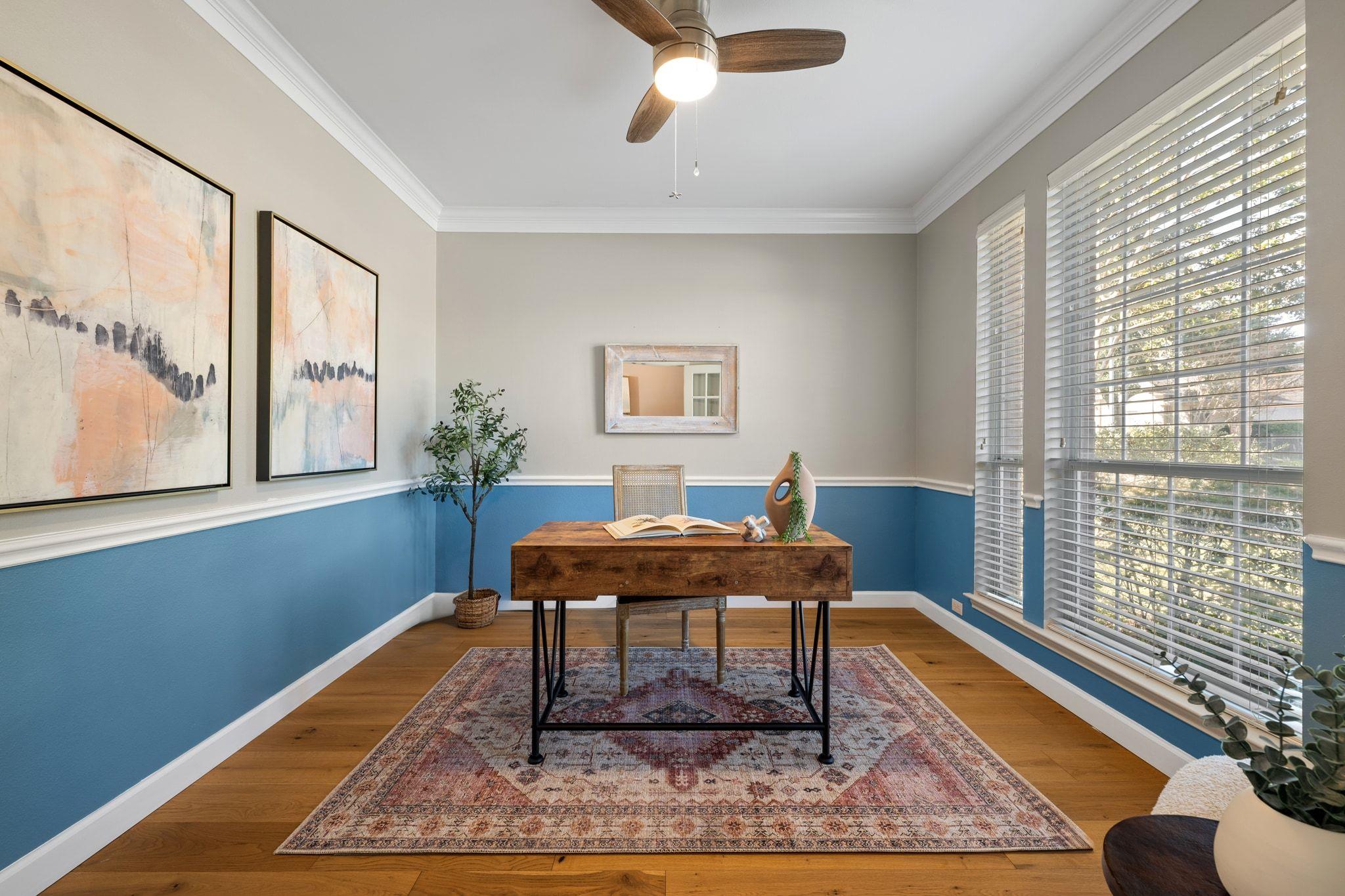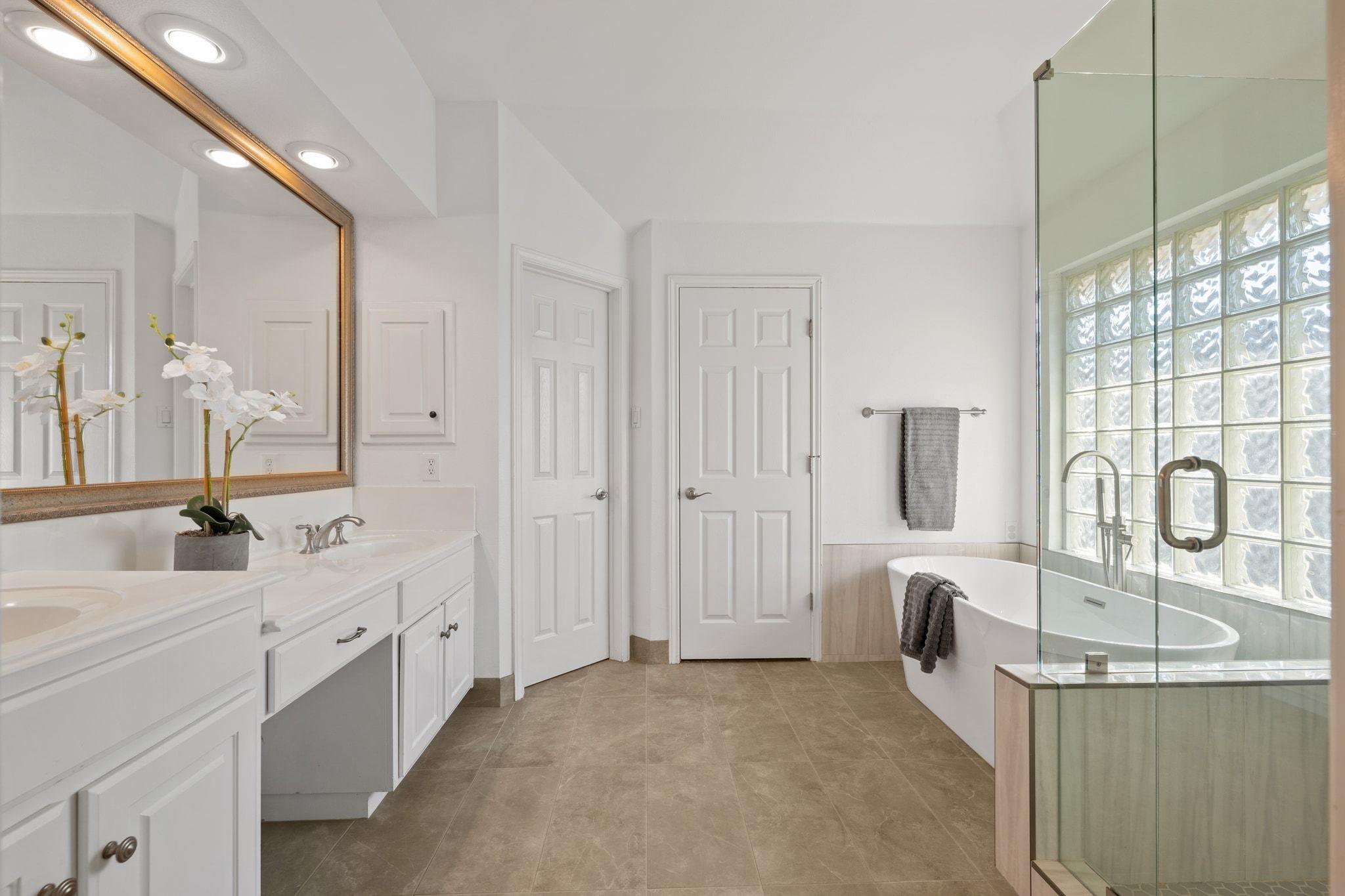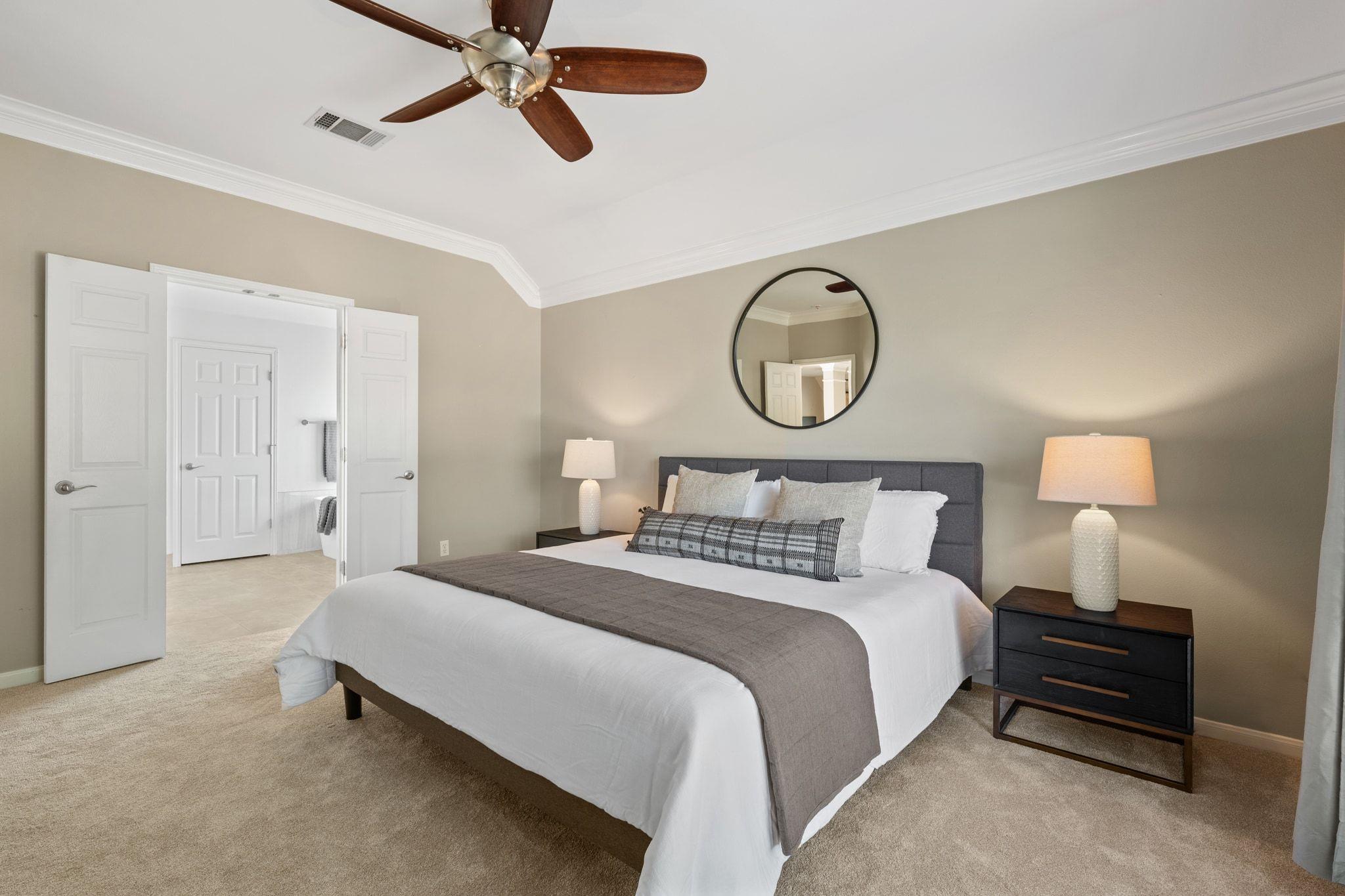 Upstairs has new, lush carpet. There, you'll find a spacious bonus living area with extra storage area ideal for a playroom, extra study, or cozy TV space. The primary suite is bright and airy, with new carpet and a luxurious, remodeled bath featuring a large shower and relaxing soaking tub. There are two additional bedrooms with Elfa shelving and a full bathroom.