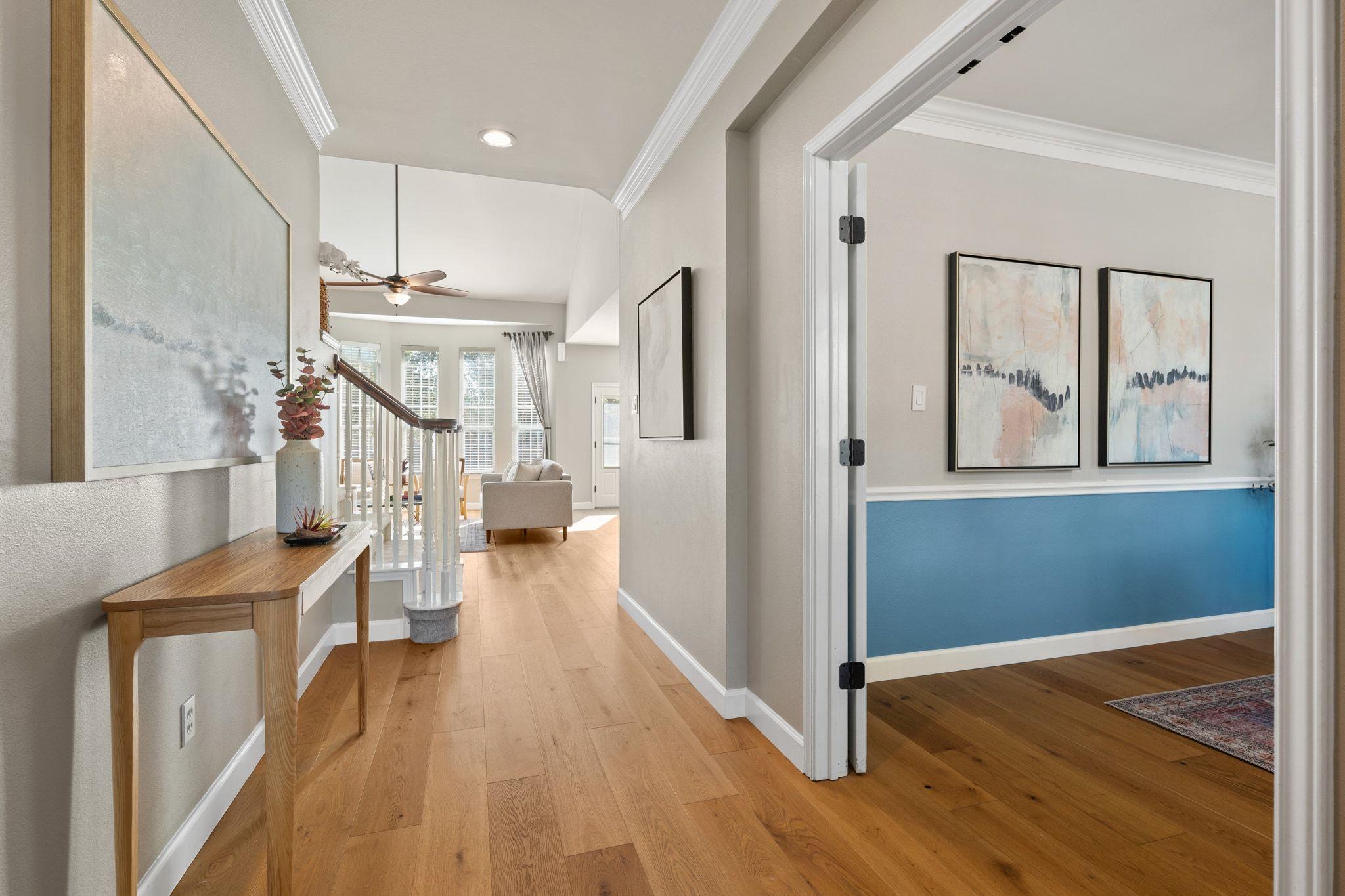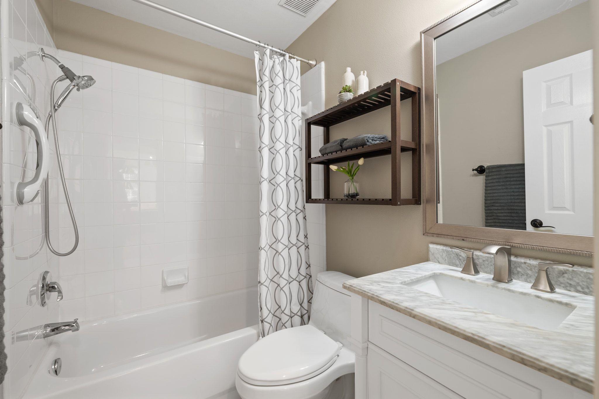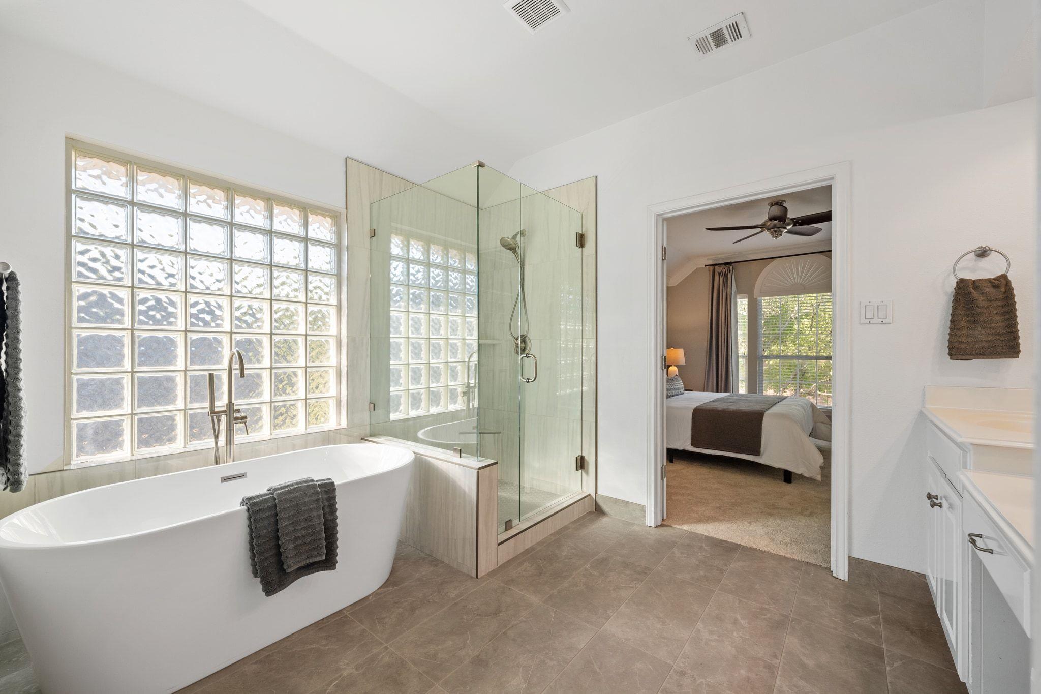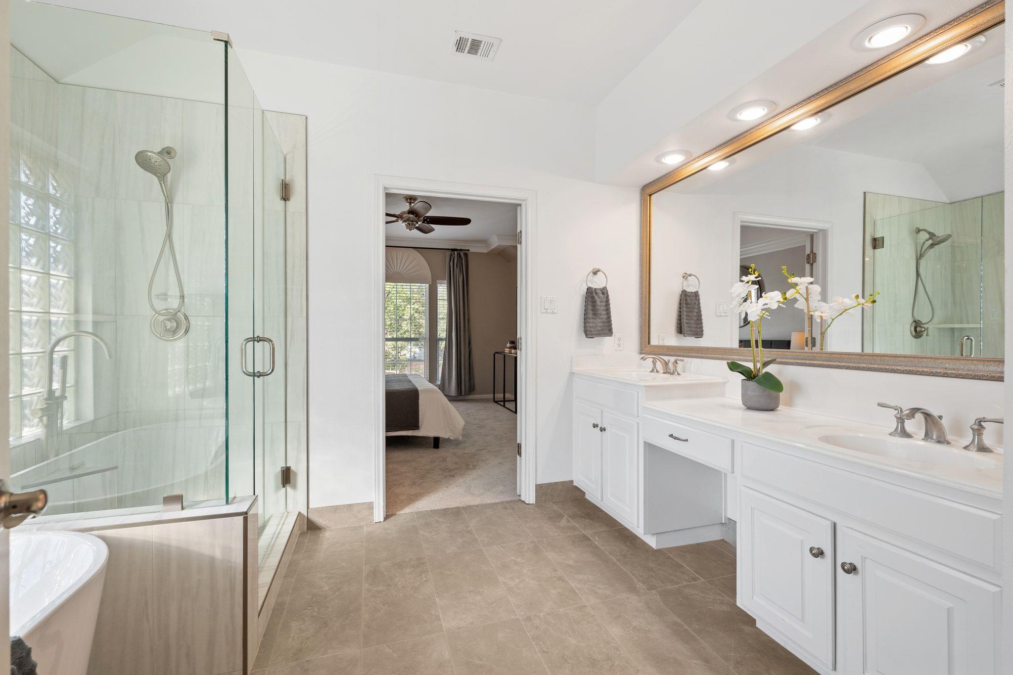 Upstairs has new, lush carpet. There, you'll find a spacious bonus living area with extra storage area ideal for a playroom, extra study, or cozy TV space. The primary suite is bright and airy, with new carpet and a luxurious, remodeled bath featuring a large shower and relaxing soaking tub. There are two additional bedrooms with Elfa shelving and a full bathroom.