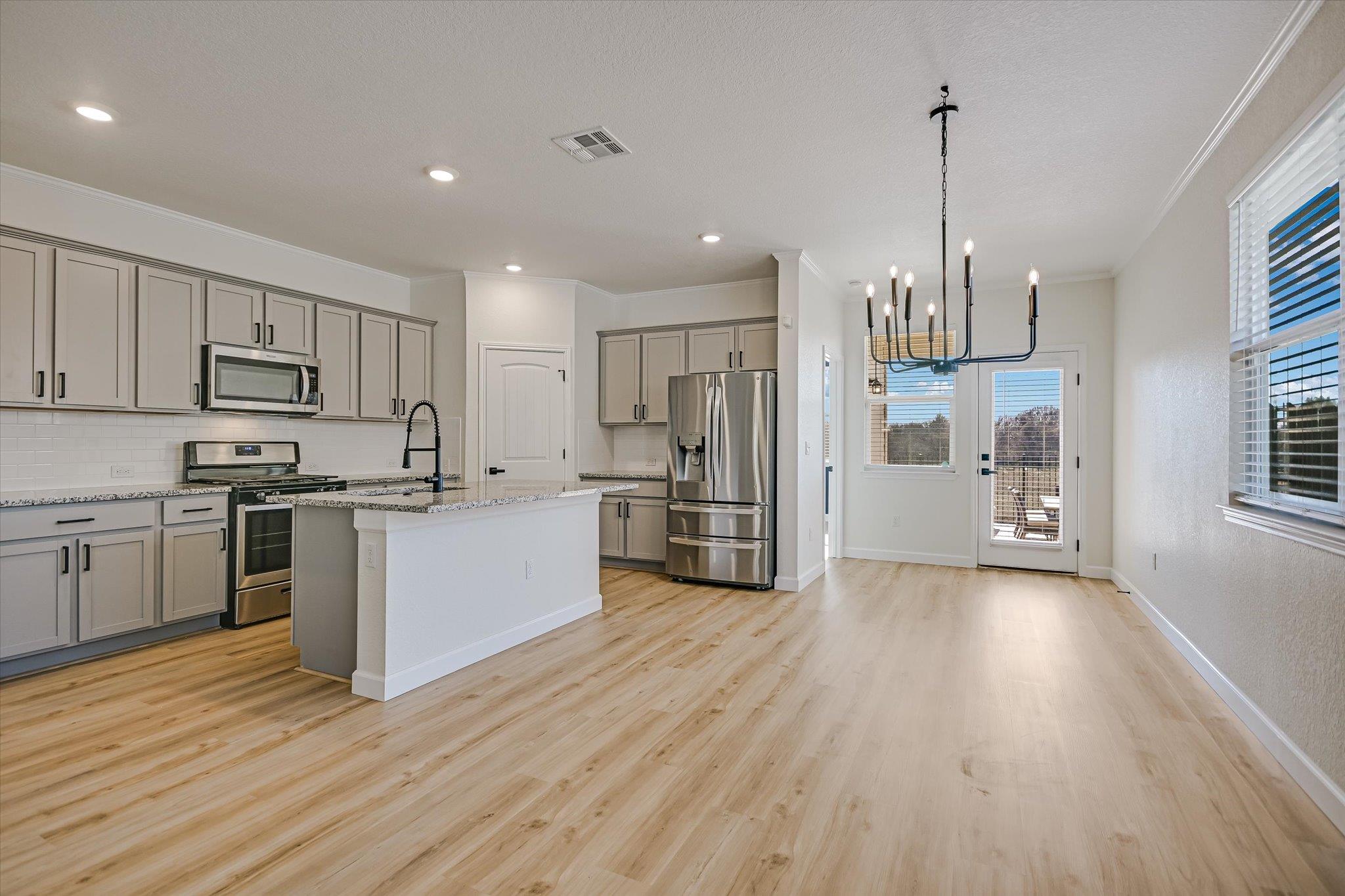 Built in 2021 and designed for modern living, this stunning 4-bedroom, 3-bathroom home offers the perfect blend of style, comfort, and privacy. Backing to a serene greenbelt, the backyard is a true retreat with a private pool and spa--ideal for relaxing evenings or entertaining guests year-round. The thoughtfully designed main level features a spacious primary suite, providing the ease and privacy of main-floor living. Upstairs, a large bonus loft offers flexible space for a game room, media room, or home office, along with a fourth bedroom and full bathroom--perfect for guests or multi-generational living. Flooded with natural light, the open-concept layout showcases gorgeous finishes throughout, including luxury vinyl plank wood floors and a curated selection of upgraded details that enhance the home's modern appeal. The kitchen and living areas flow seamlessly, creating a welcoming space for everyday living and entertaining. In addition to the private backyard oasis, residents enjoy access to neighborhood amenities including a community pool and playground. With its contemporary construction, (2) 220V outlets for EV charging, functional floor plan, and resort-style living overlooking peaceful green space, this exceptional home offers the lifestyle you've been waiting for.