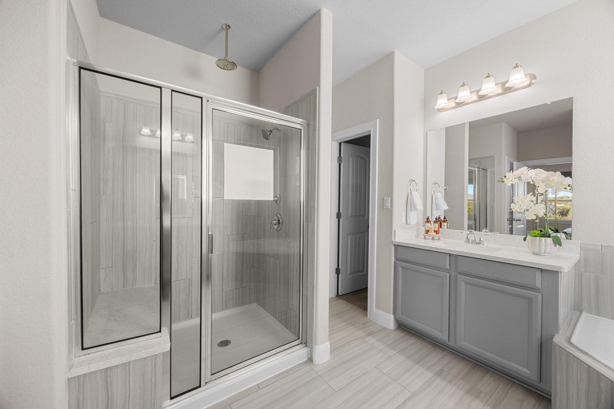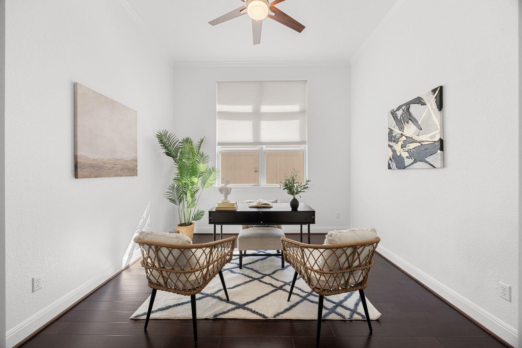 The primary suite showcases a cozy bay window, dual vanities, a walk-in closet, and convenient direct access to the laundry room. The three-car garage is finished with epoxy flooring, and the home is enhanced with crown molding, exterior lighting, and a full sprinkler system. The dining room, accented by glass sliding doors, can easily function as a playroom, home office, or flexible space to fit your lifestyle.