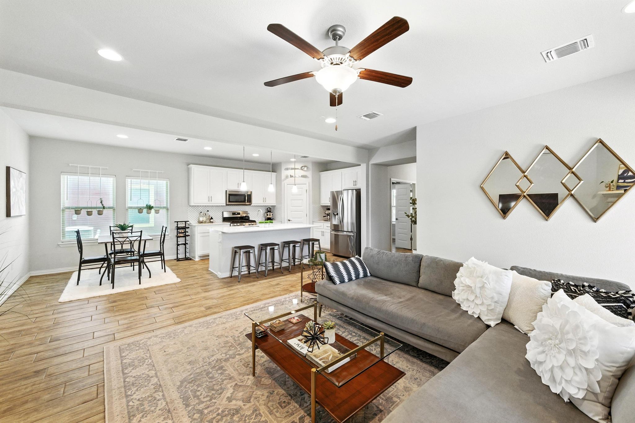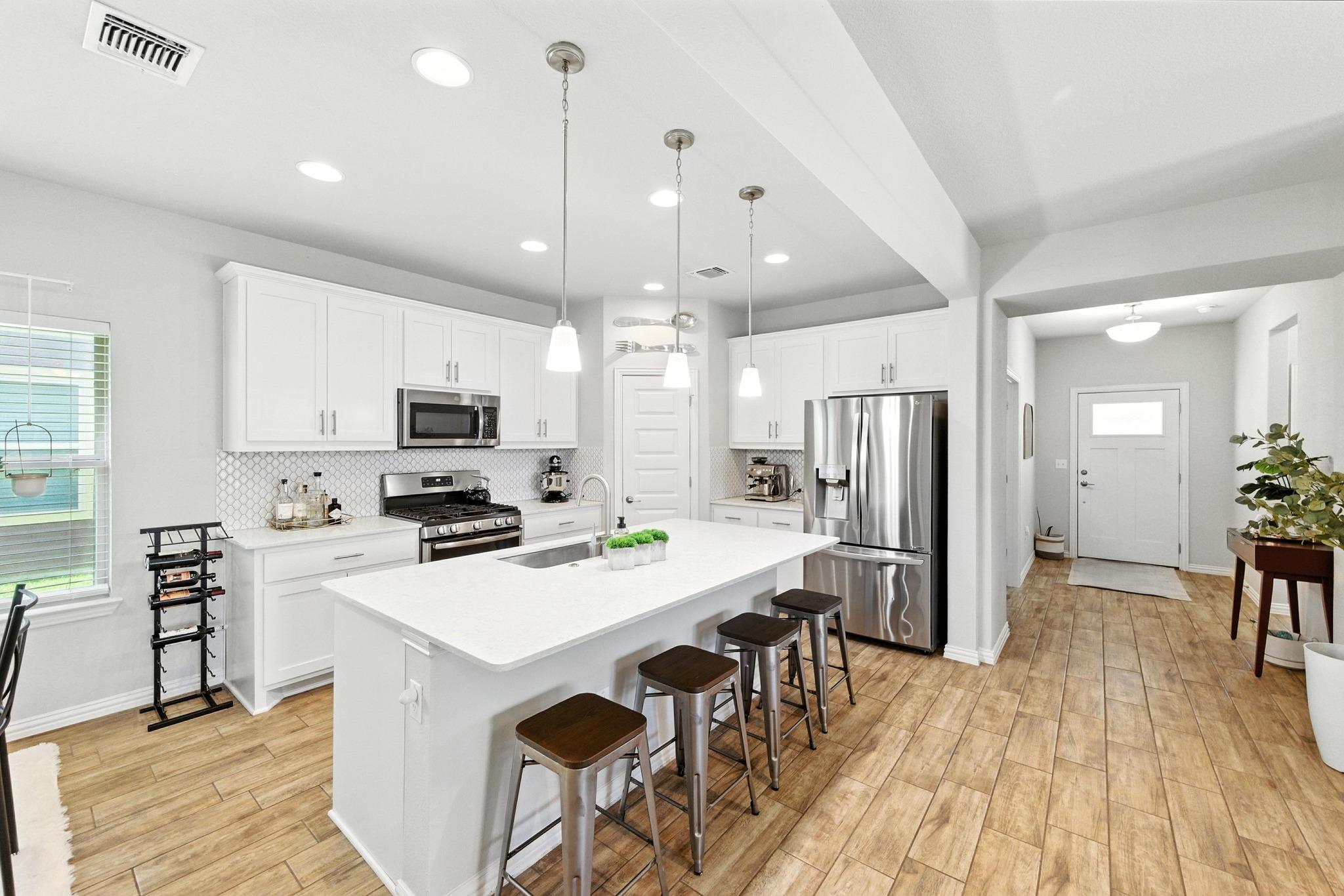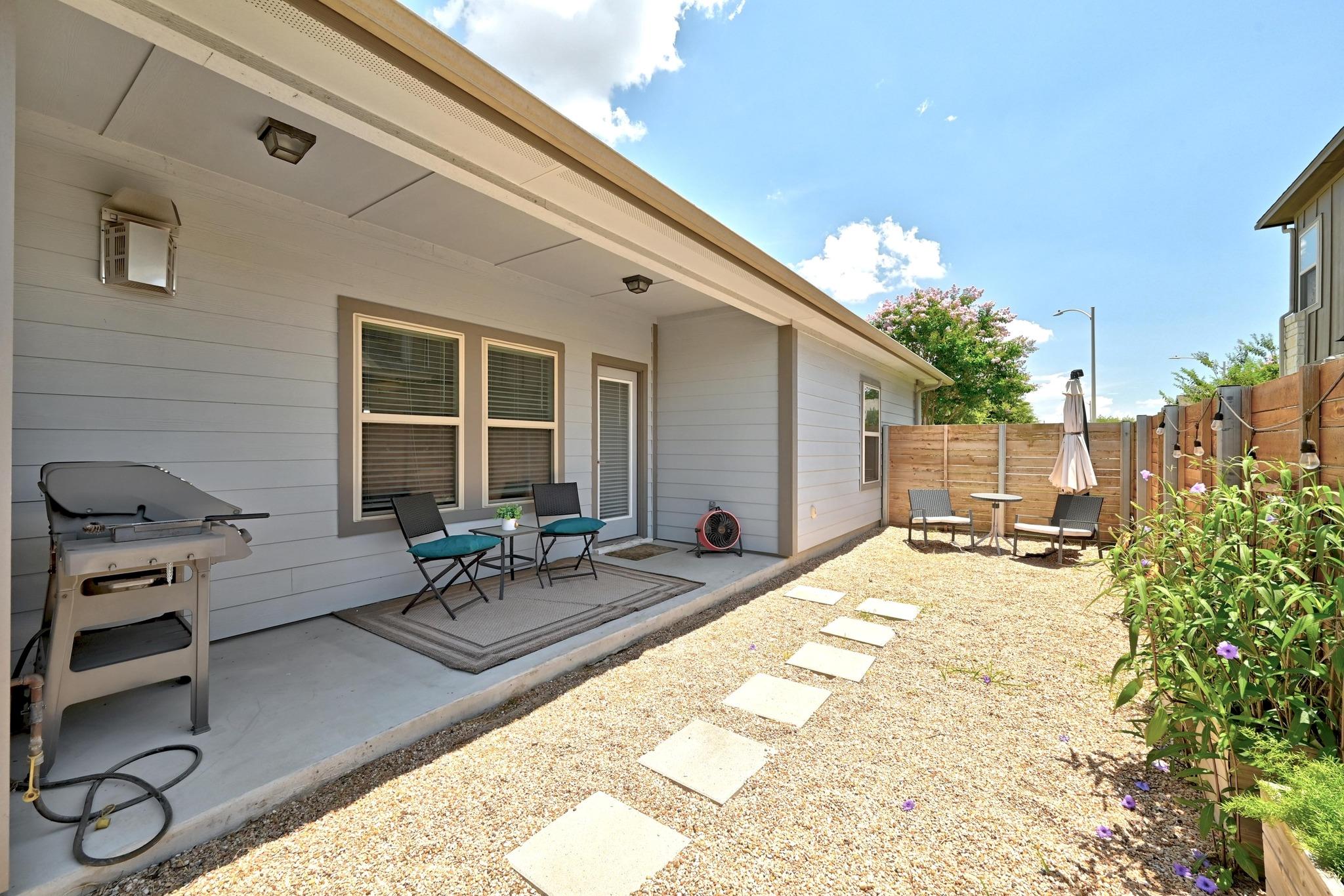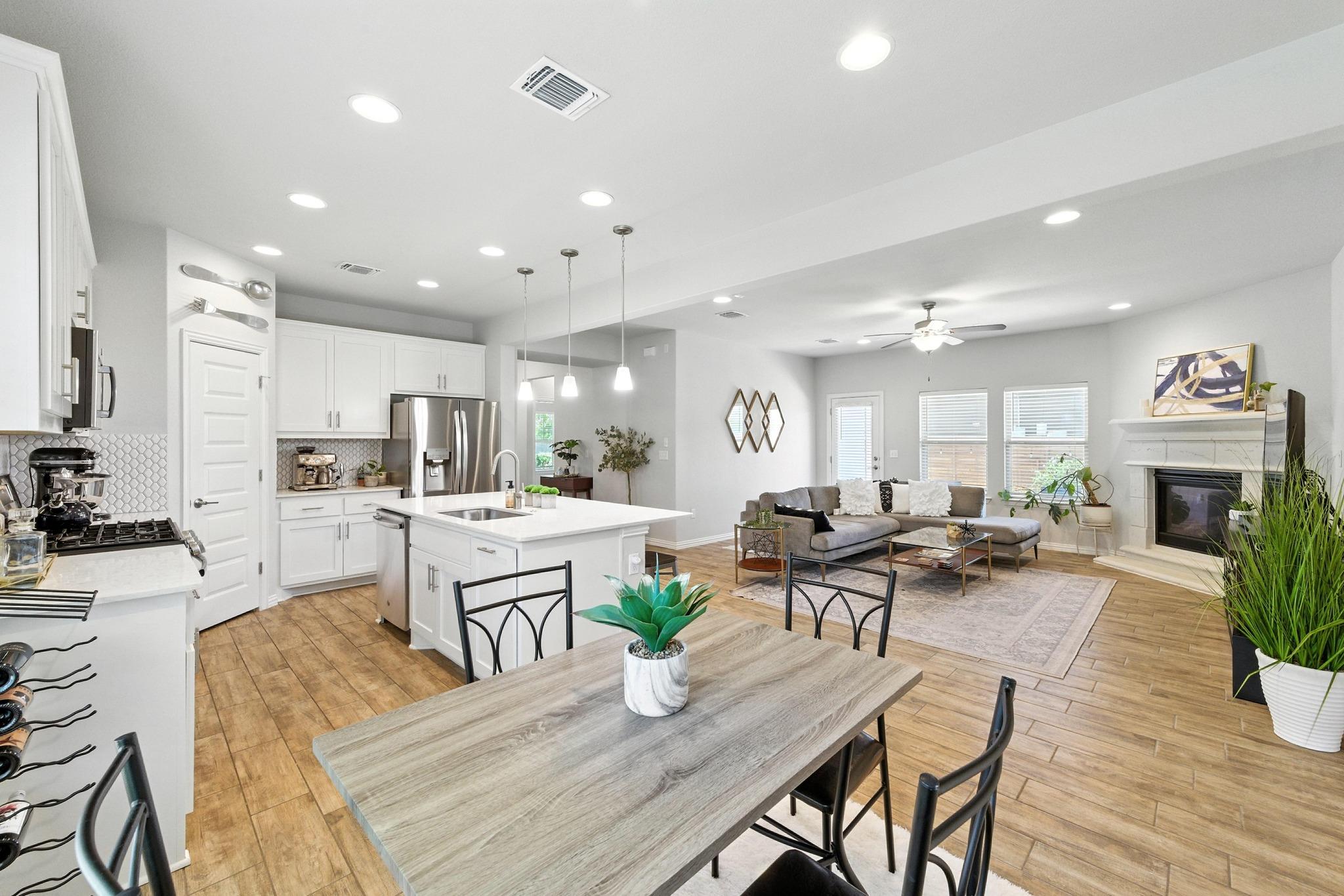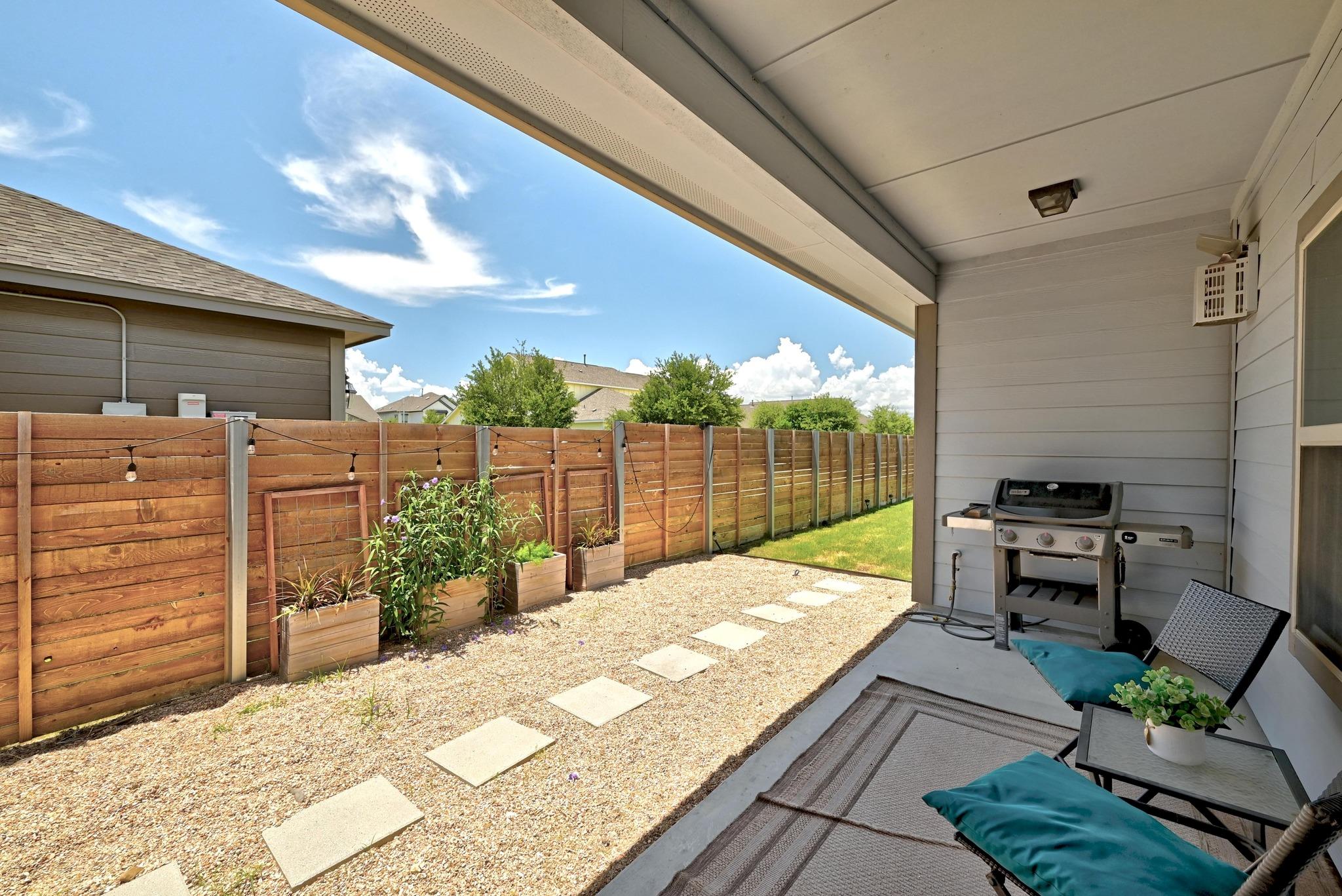 A rare opportunity in Goodnight Ranch, this 4-bedroom, 2-bathroom Craftsman-style home offers a layout that feels more like a perfect fit than a house. Wood-look tile flooring that runs throughout, high ceilings that open up every room, and neutral walls that create a canvas for whatever your style is. The living room centers around a fireplace, inviting relaxation, and opens seamlessly into the kitchen and dining area, creating one uninterrupted flow that's perfect for both everyday life and entertaining. The kitchen is far from ordinary. Quartz countertops sit alongside a tile backsplash and shaker cabinetry. Stainless appliances give you the tools you need, but the real charm is how the kitchen interacts with the living space, ensuring you're always part of the action, no matter where you are. The primary suite is tucked away at the back of the home, offering privacy and its own sense of calm. The ensuite bath brings practicality and comfort with separate vanities, a soaking tub, a step-in shower, and a walk-in closet that actually accommodates your wardrobe. A 4th bedroom at the front of the home gives you a blank canvas, whether it's a home office, guest room, or something else entirely. Out back, the yard tells a story of endless potential. The covered patio leads into a xeriscaped area with pavers, offering a low-maintenance space that flows into a large, grassy area; perfect for a garden, playscape, or even a cowboy pool. It's the kind of backyard that invites you to live outside as much as you do in. And let's talk location. Situated directly across from the amenity center, you're just a few steps away from a pool, playground, and paved trails. Enjoy community events like farmers markets and movie nights in the park, all while being just minutes from Southpark Meadows for convenient shopping and dining. This home isn't just another place to live, it's a chance to experience something different. Schedule your showing and see what sets this one apart.