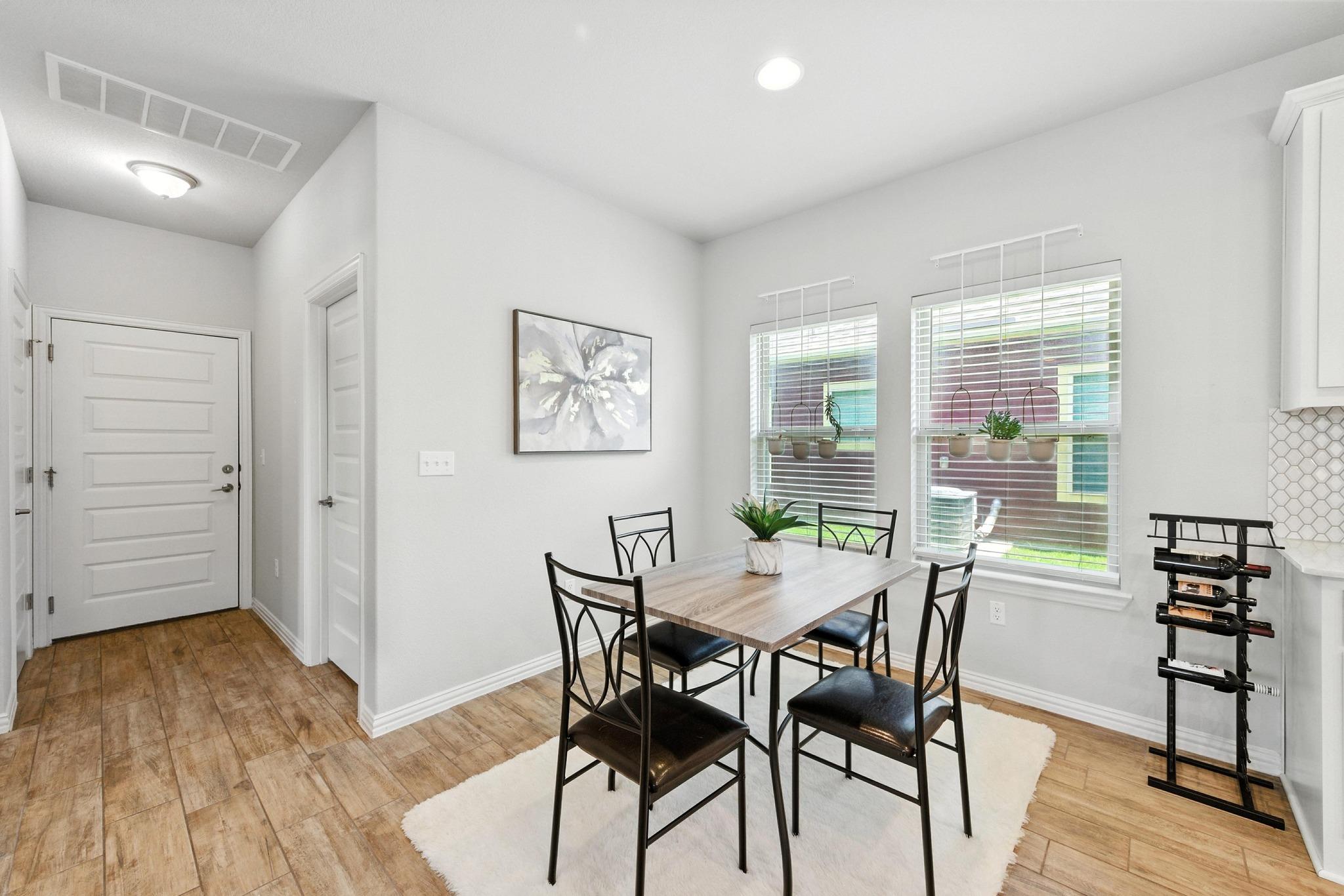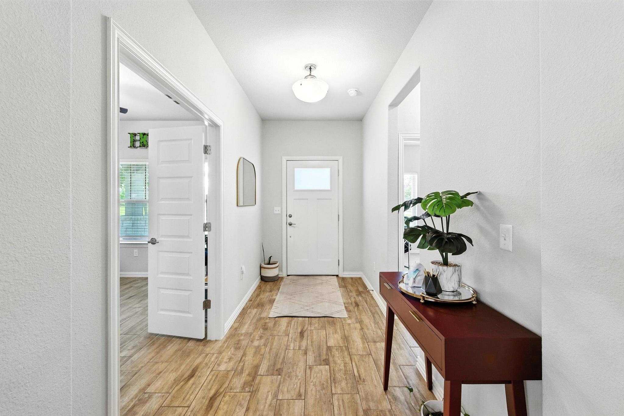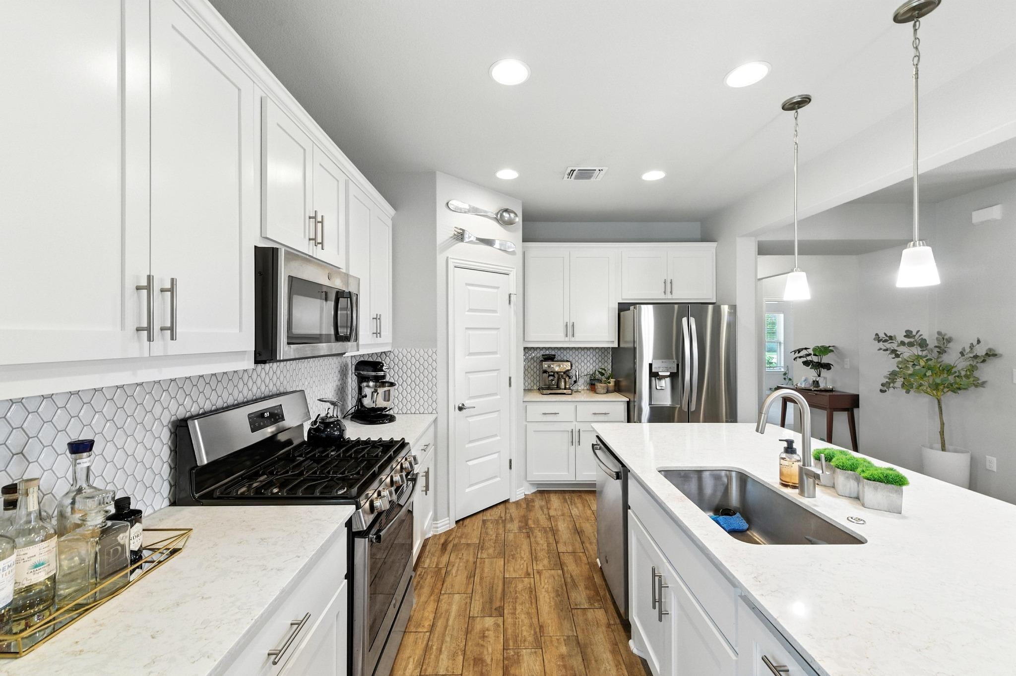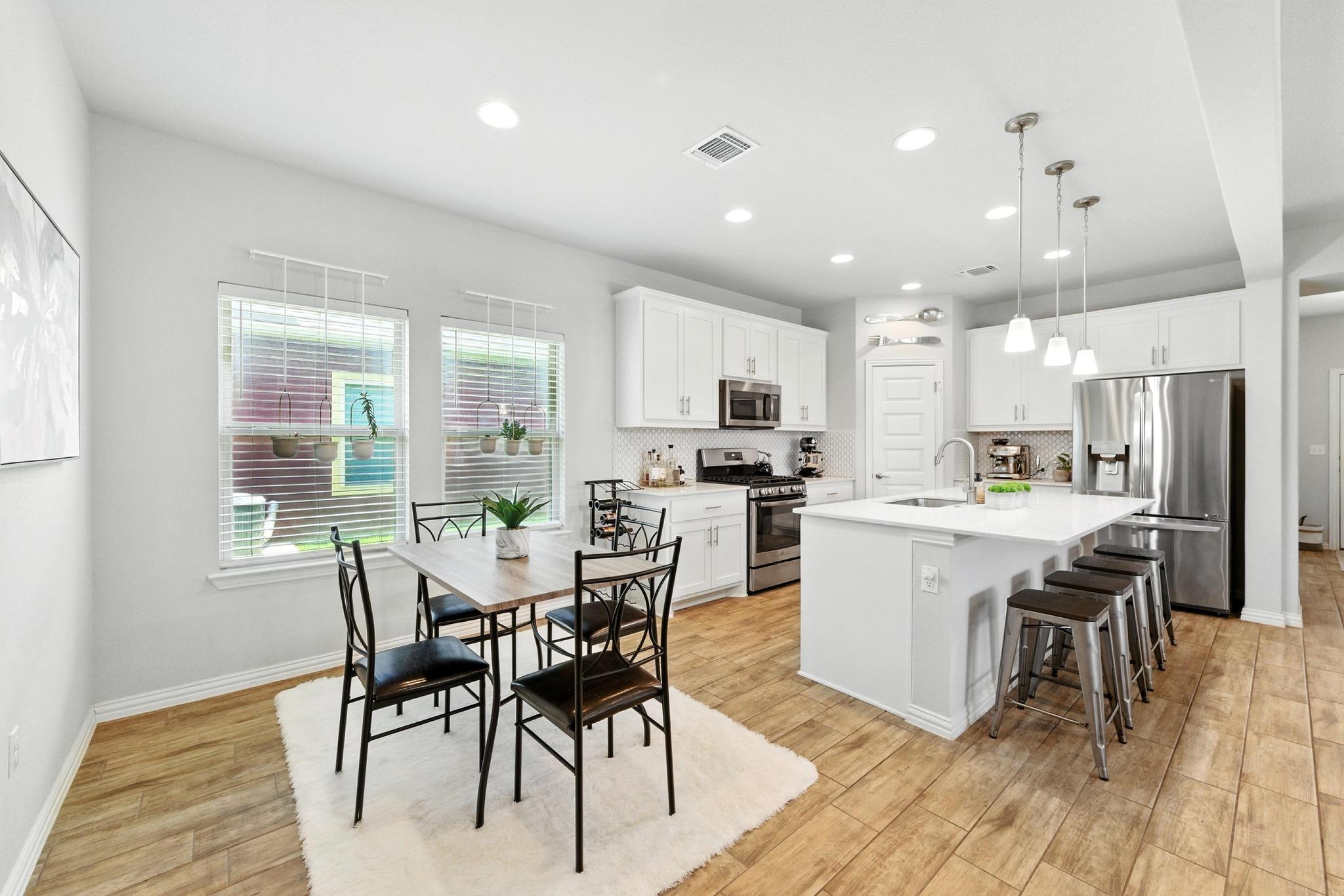 A rare opportunity in Goodnight Ranch, this 4-bedroom, 2-bathroom Craftsman-style home offers a layout that feels more like a perfect fit than a house. Wood-look tile flooring that runs throughout, high ceilings that open up every room, and neutral walls that create a canvas for whatever your style is. The living room centers around a fireplace, inviting relaxation, and opens seamlessly into the kitchen and dining area, creating one uninterrupted flow that's perfect for both everyday life and entertaining. The kitchen is far from ordinary. Quartz countertops sit alongside a tile backsplash and shaker cabinetry. Stainless appliances give you the tools you need, but the real charm is how the kitchen interacts with the living space, ensuring you're always part of the action, no matter where you are. The primary suite is tucked away at the back of the home, offering privacy and its own sense of calm. The ensuite bath brings practicality and comfort with separate vanities, a soaking tub, a step-in shower, and a walk-in closet that actually accommodates your wardrobe. A 4th bedroom at the front of the home gives you a blank canvas, whether it's a home office, guest room, or something else entirely. Out back, the yard tells a story of endless potential. The covered patio leads into a xeriscaped area with pavers, offering a low-maintenance space that flows into a large, grassy area; perfect for a garden, playscape, or even a cowboy pool. It's the kind of backyard that invites you to live outside as much as you do in. And let's talk location. Situated directly across from the amenity center, you're just a few steps away from a pool, playground, and paved trails. Enjoy community events like farmers markets and movie nights in the park, all while being just minutes from Southpark Meadows for convenient shopping and dining. This home isn't just another place to live, it's a chance to experience something different. Schedule your showing and see what sets this one apart.