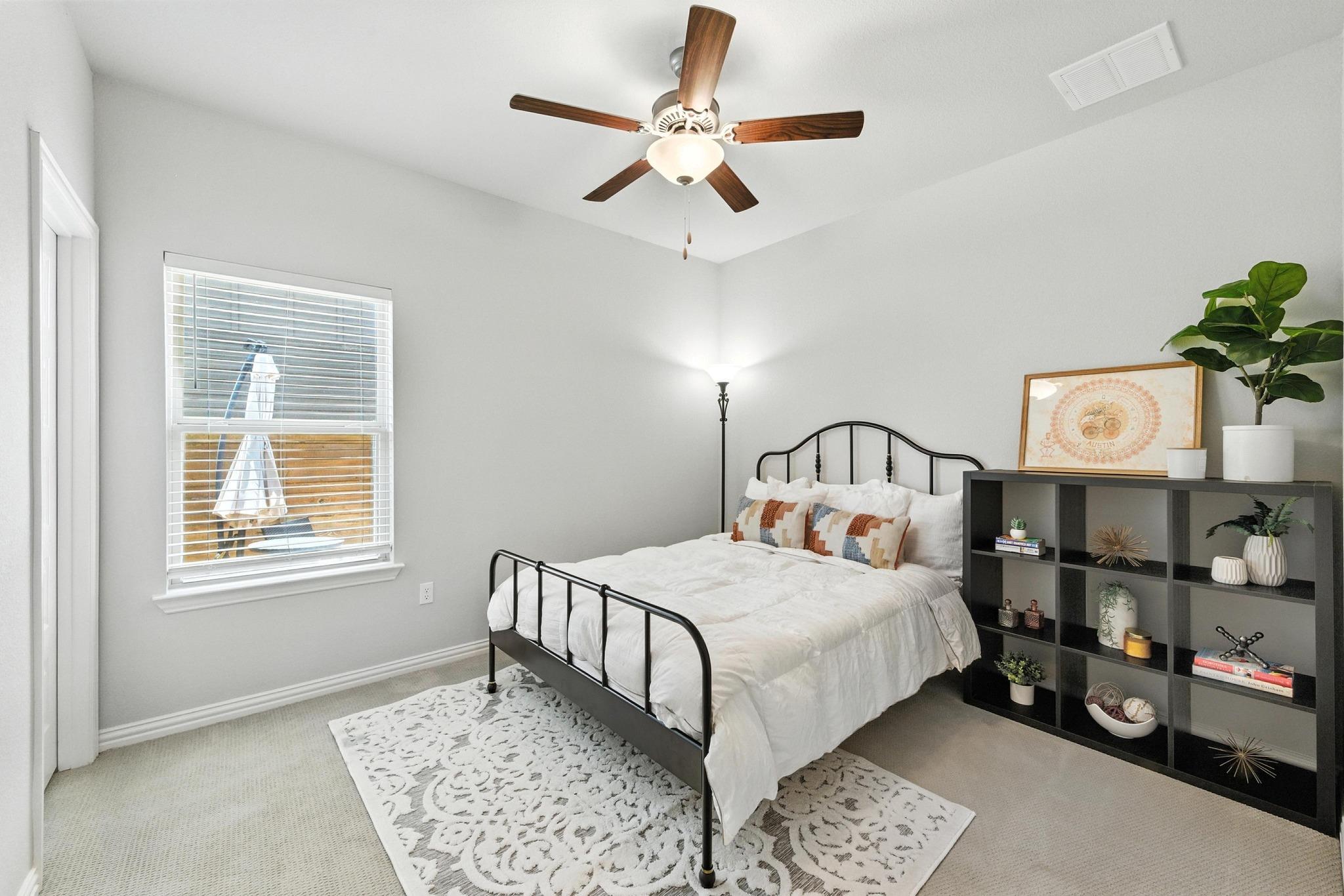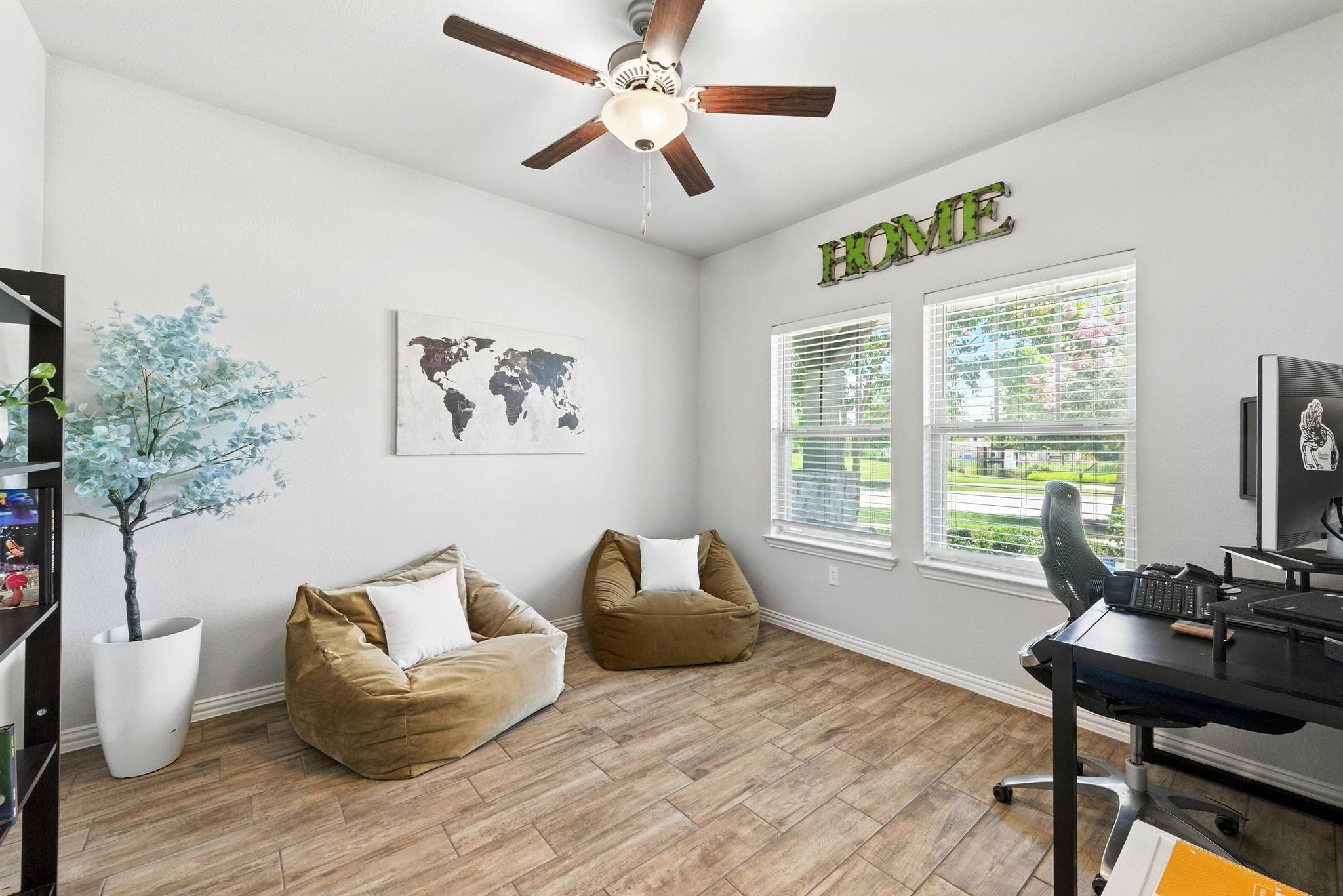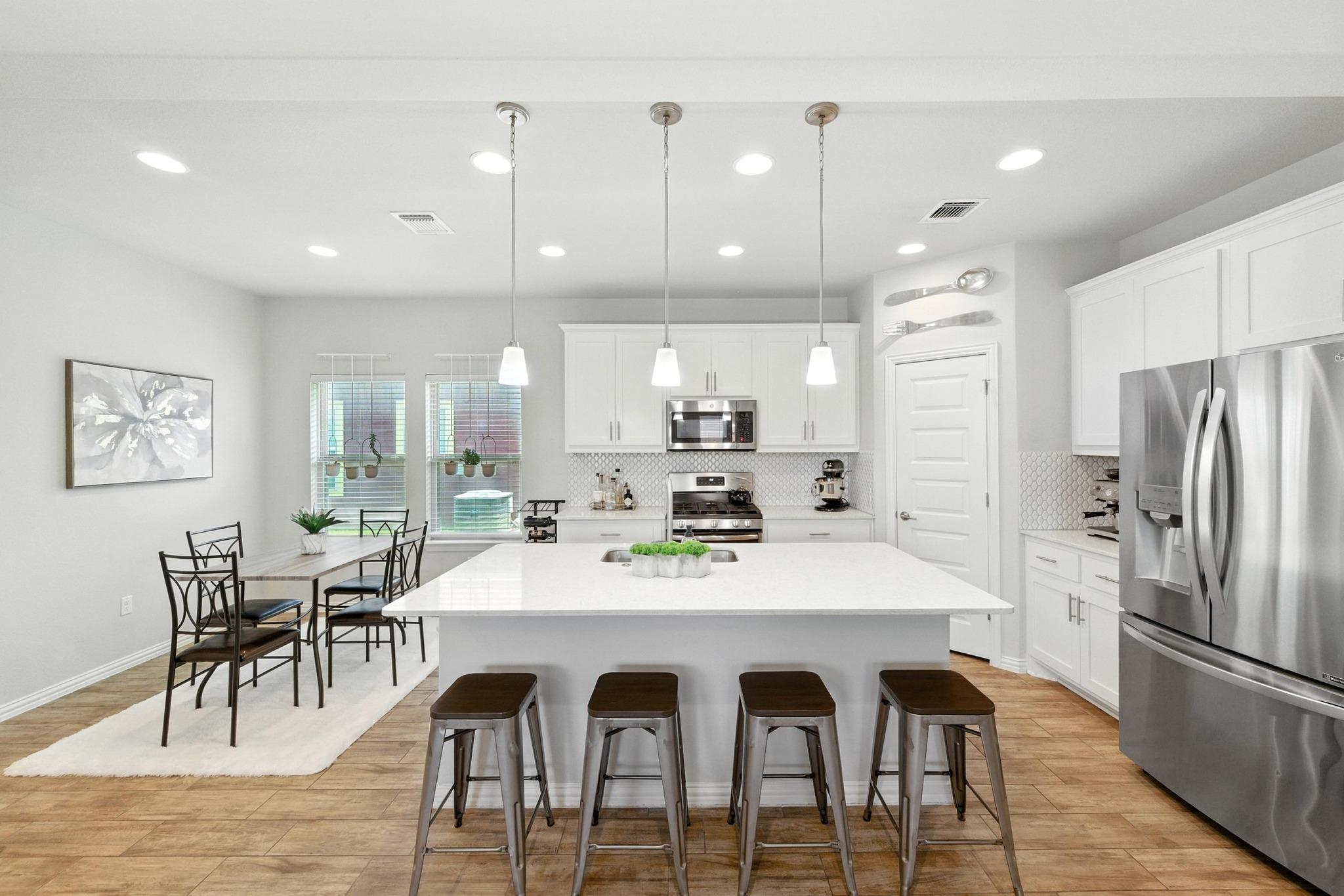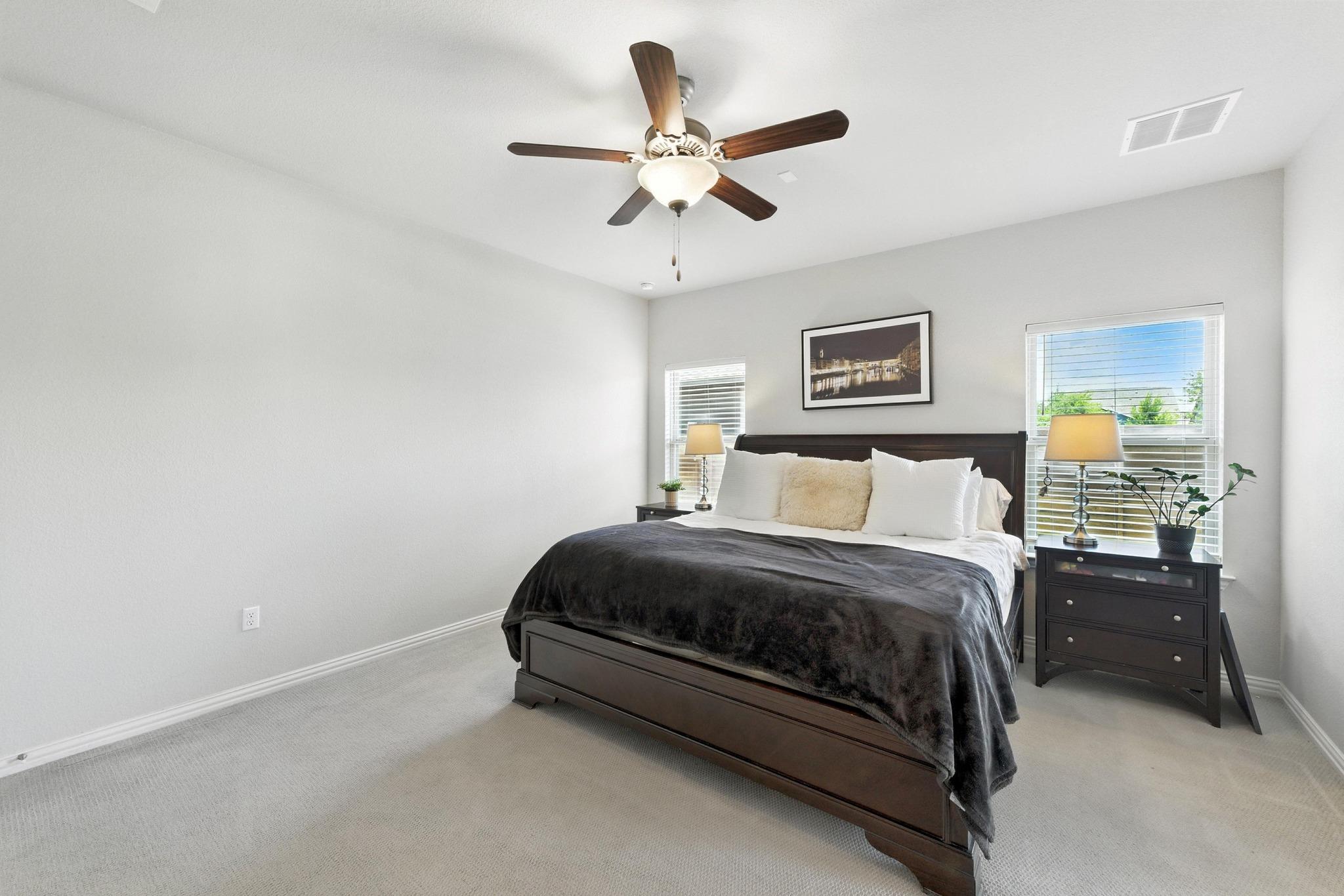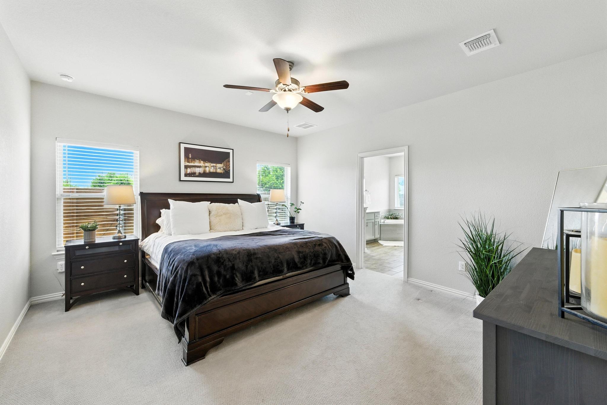 A rare opportunity in Goodnight Ranch, this 4-bedroom, 2-bathroom Craftsman-style home offers a layout that feels more like a perfect fit than a house. Wood-look tile flooring that runs throughout, high ceilings that open up every room, and neutral walls that create a canvas for whatever your style is. The living room centers around a fireplace, inviting relaxation, and opens seamlessly into the kitchen and dining area, creating one uninterrupted flow that's perfect for both everyday life and entertaining. The kitchen is far from ordinary. Quartz countertops sit alongside a tile backsplash and shaker cabinetry. Stainless appliances give you the tools you need, but the real charm is how the kitchen interacts with the living space, ensuring you're always part of the action, no matter where you are. The primary suite is tucked away at the back of the home, offering privacy and its own sense of calm. The ensuite bath brings practicality and comfort with separate vanities, a soaking tub, a step-in shower, and a walk-in closet that actually accommodates your wardrobe. A 4th bedroom at the front of the home gives you a blank canvas, whether it's a home office, guest room, or something else entirely. Out back, the yard tells a story of endless potential. The covered patio leads into a xeriscaped area with pavers, offering a low-maintenance space that flows into a large, grassy area; perfect for a garden, playscape, or even a cowboy pool. It's the kind of backyard that invites you to live outside as much as you do in. And let's talk location. Situated directly across from the amenity center, you're just a few steps away from a pool, playground, and paved trails. Enjoy community events like farmers markets and movie nights in the park, all while being just minutes from Southpark Meadows for convenient shopping and dining. This home isn't just another place to live, it's a chance to experience something different. Schedule your showing and see what sets this one apart.