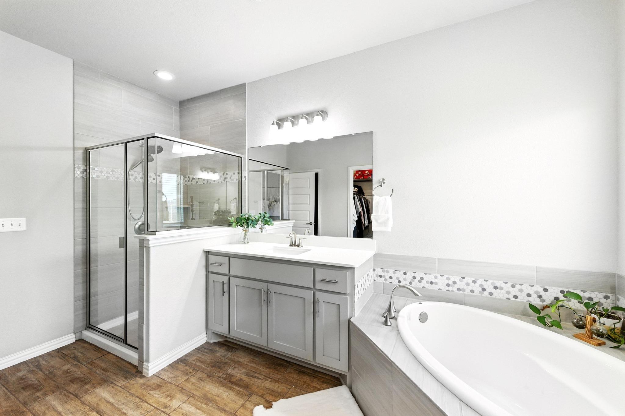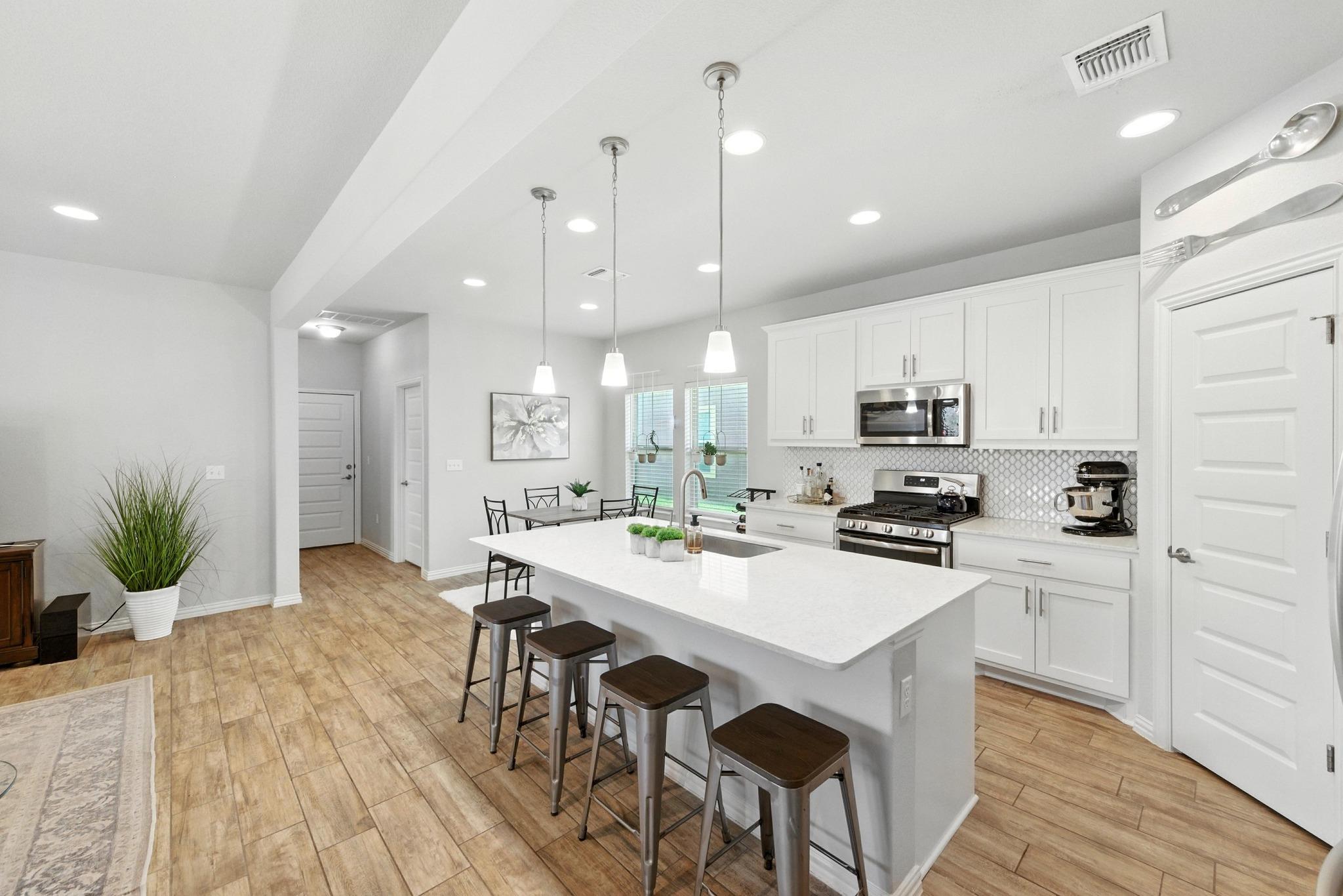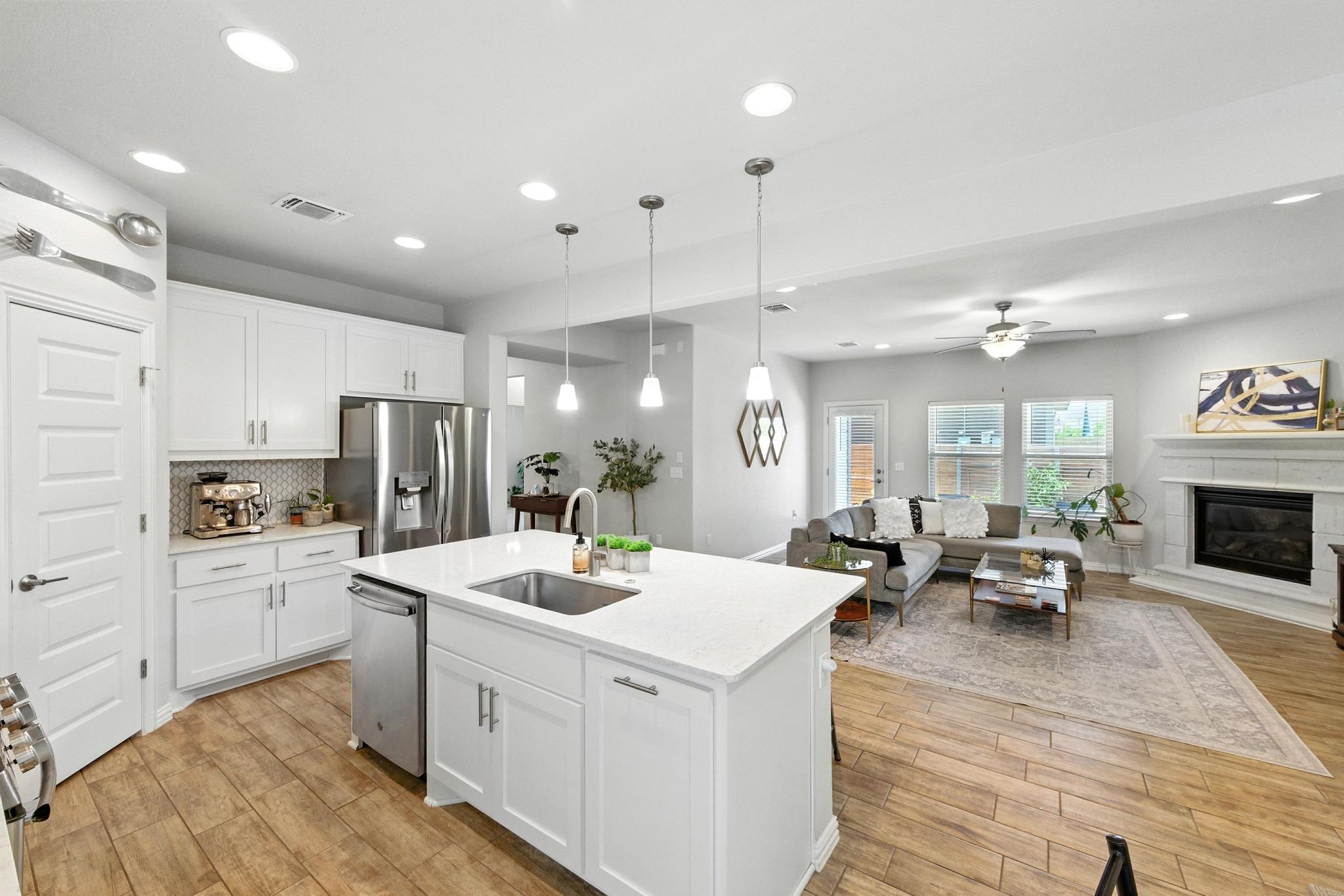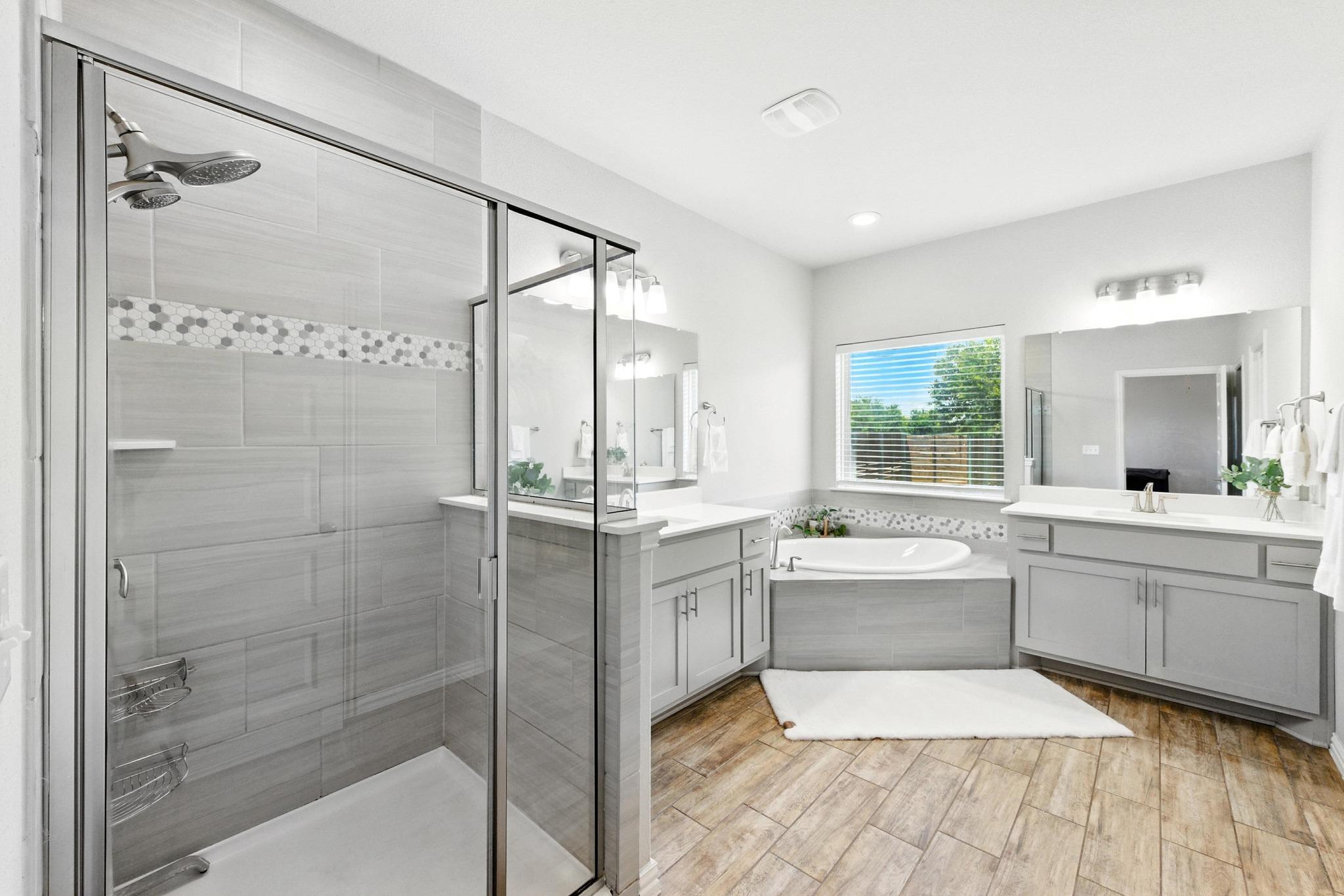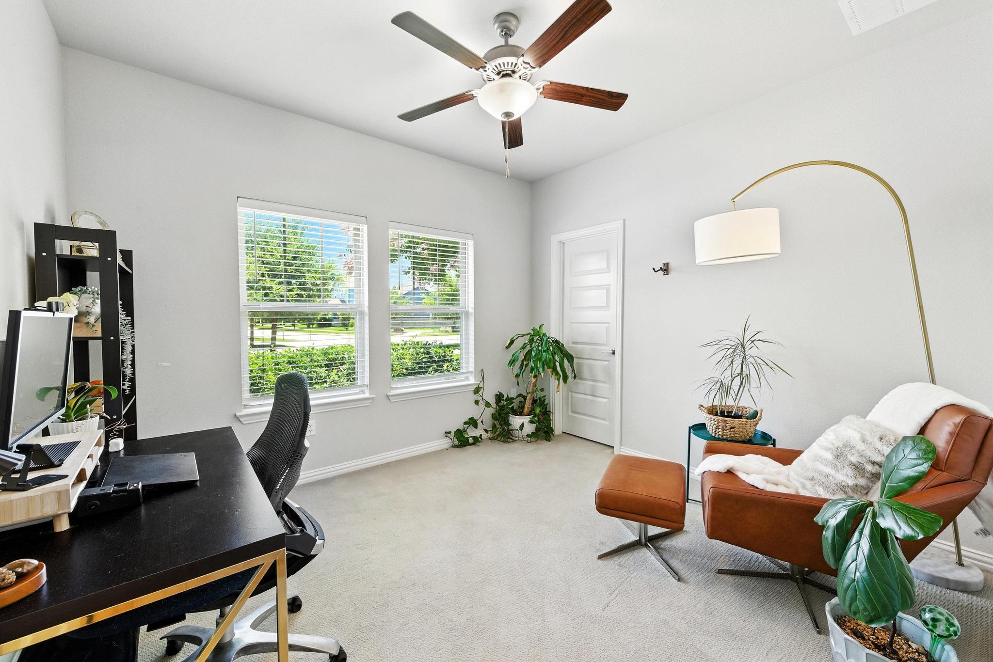 A rare opportunity in Goodnight Ranch, this 4-bedroom, 2-bathroom Craftsman-style home offers a layout that feels more like a perfect fit than a house. Wood-look tile flooring that runs throughout, high ceilings that open up every room, and neutral walls that create a canvas for whatever your style is. The living room centers around a fireplace, inviting relaxation, and opens seamlessly into the kitchen and dining area, creating one uninterrupted flow that's perfect for both everyday life and entertaining. The kitchen is far from ordinary. Quartz countertops sit alongside a tile backsplash and shaker cabinetry. Stainless appliances give you the tools you need, but the real charm is how the kitchen interacts with the living space, ensuring you're always part of the action, no matter where you are. The primary suite is tucked away at the back of the home, offering privacy and its own sense of calm. The ensuite bath brings practicality and comfort with separate vanities, a soaking tub, a step-in shower, and a walk-in closet that actually accommodates your wardrobe. A 4th bedroom at the front of the home gives you a blank canvas, whether it's a home office, guest room, or something else entirely. Out back, the yard tells a story of endless potential. The covered patio leads into a xeriscaped area with pavers, offering a low-maintenance space that flows into a large, grassy area; perfect for a garden, playscape, or even a cowboy pool. It's the kind of backyard that invites you to live outside as much as you do in. And let's talk location. Situated directly across from the amenity center, you're just a few steps away from a pool, playground, and paved trails. Enjoy community events like farmers markets and movie nights in the park, all while being just minutes from Southpark Meadows for convenient shopping and dining. This home isn't just another place to live, it's a chance to experience something different. Schedule your showing and see what sets this one apart.