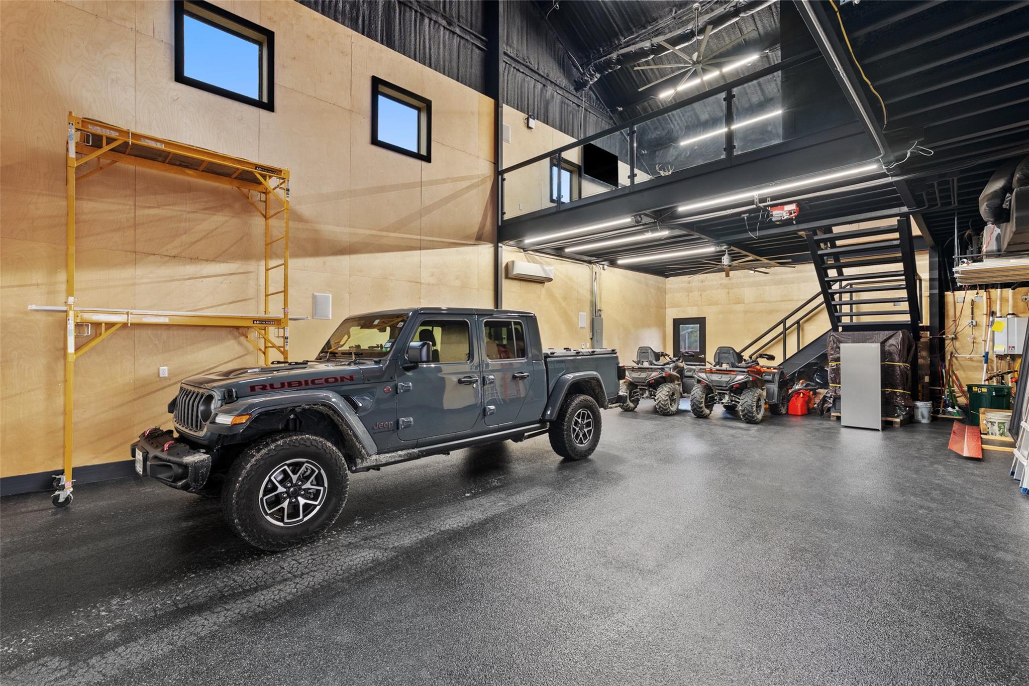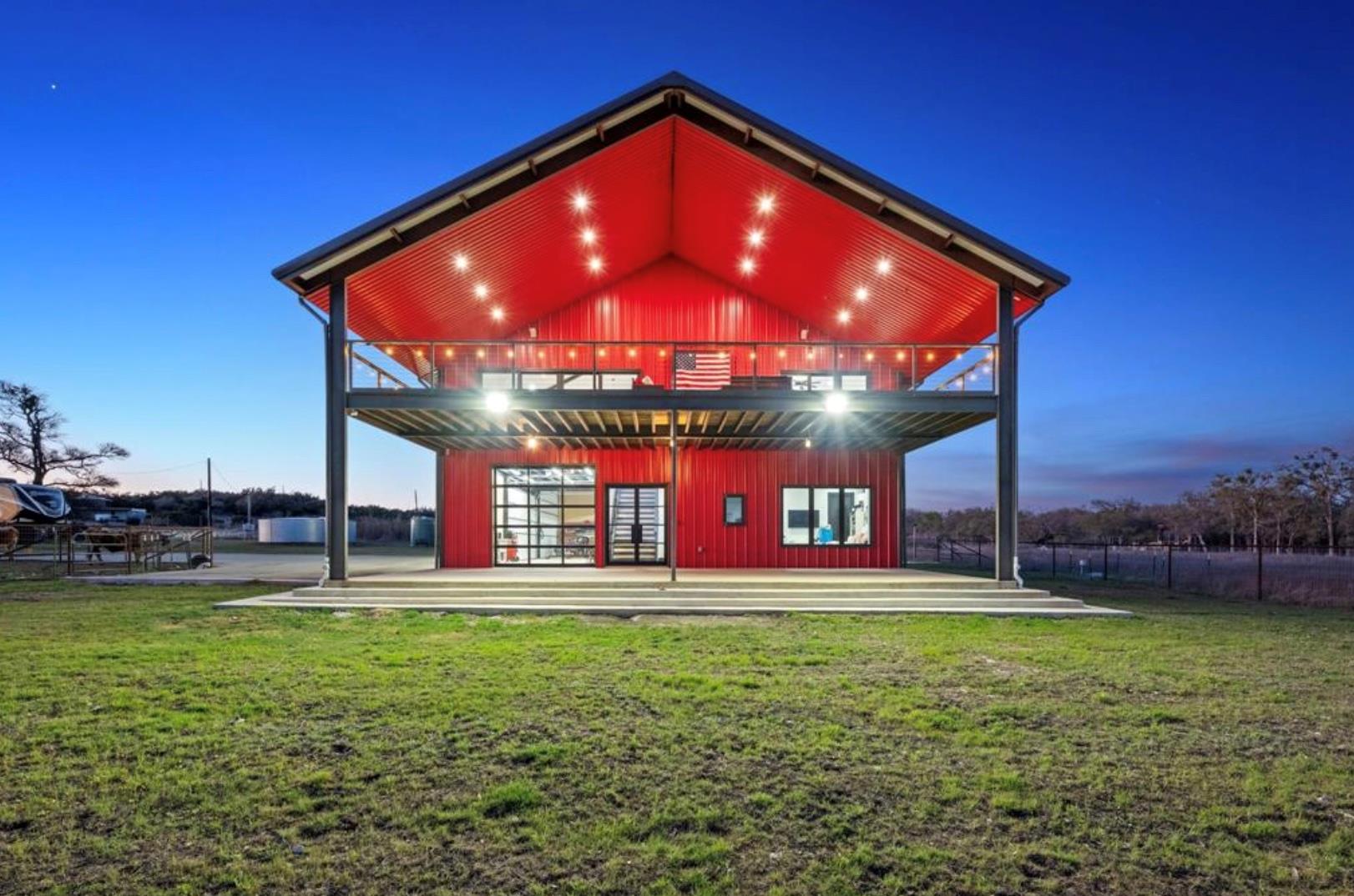 Astonishing Hill Country views surround this sprawling 4,950 sq. ft. barndominium, expertly constructed with robust 12" and 16" I-beam steel framing for unmatched strength and enduring quality. Set on 12.938 AG exempt acres, the property is framed by majestic oak trees and fully enclosed by a 5 ft no-step pipe horse fence, ready for your horses or ag animals. The residence offers 3,352 sq. ft. of luxury living space paired with a climate controlled 6 car garage and loft that can serve as an office, flex space, or guest retreat. A 30,000 plus gallon rainwater collection system with supplemental well, dual 500 gallon propane tanks, foam insulation, large energy-efficient fiberglass windows, and whole-home networking with smart home capabilities ensure modern comfort and efficiency. Inside, the gourmet kitchen boasts an oversized quartz island with seating for 10, premium appliances, a coffee and bar station, and a warm open concept layout highlighted by hickory wood floors, expansive windows, and abundant natural light. The owner's suite offers a spa-like retreat with a dual-head walk-in shower, soaking tub, and his and her closets. Each guest bedroom includes a private bath and a walk in closet, with laundry facilities on both levels for added convenience. Designed for seamless indoor outdoor living, the home features two expansive 900 sq. ft. patios and decks that are perfect for savoring Hill Country sunsets and breezes. Additional highlights include a full bath in the shop, durable coated flooring, and plumbing for a dog wash station.