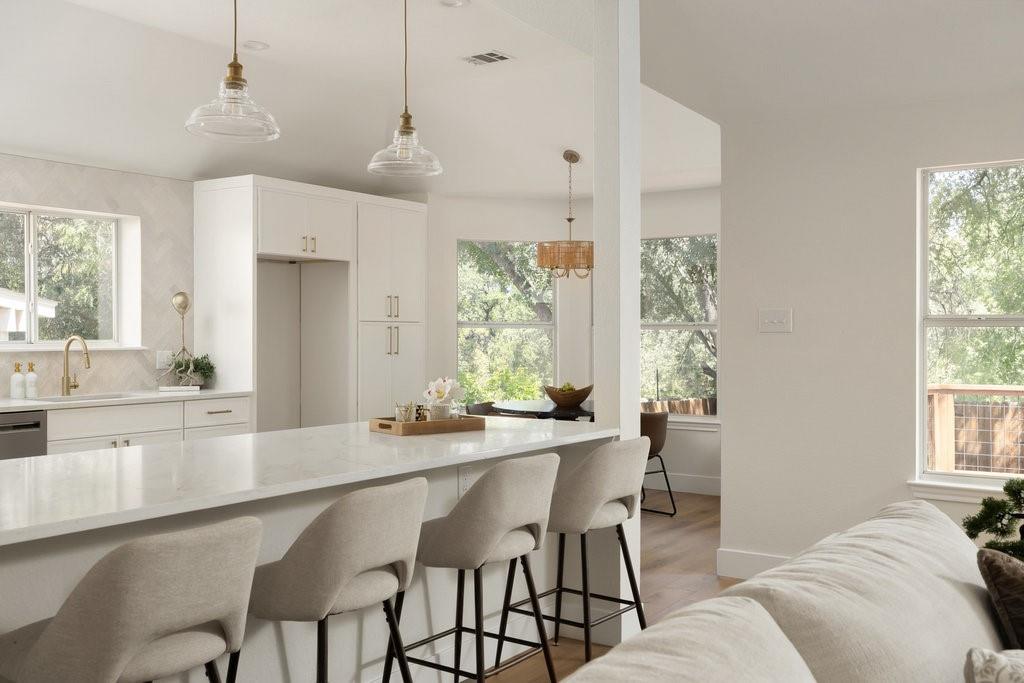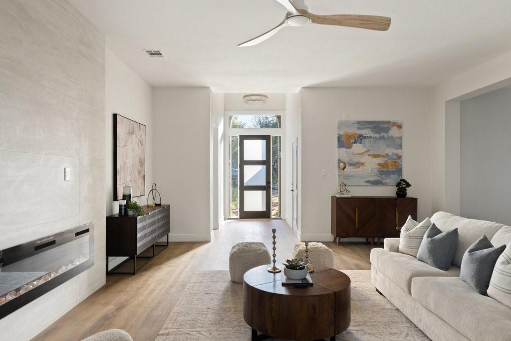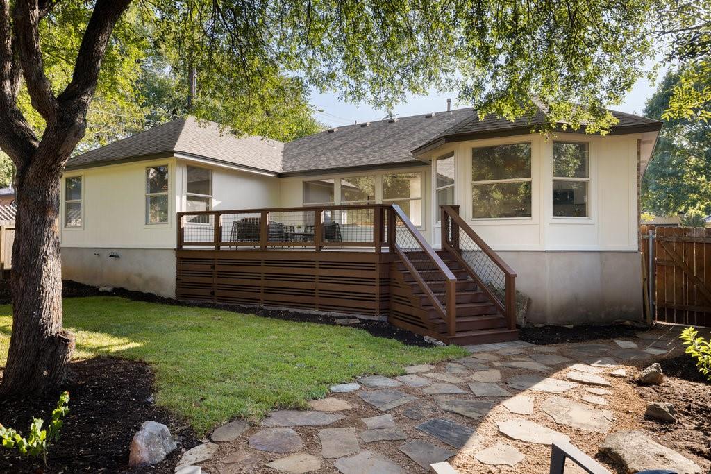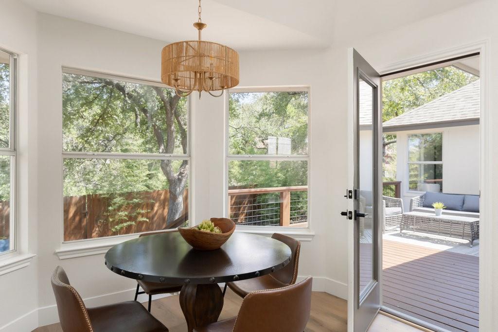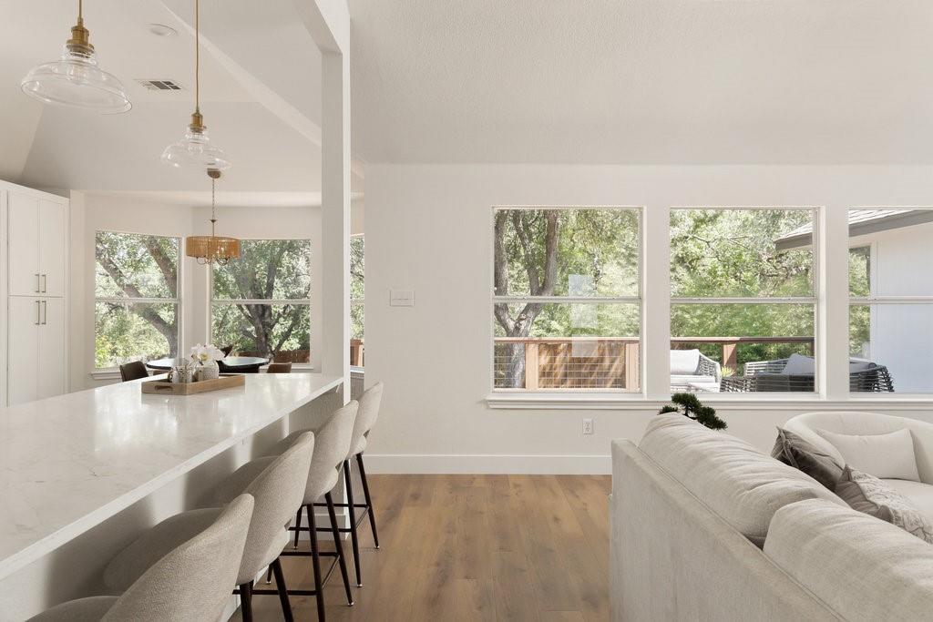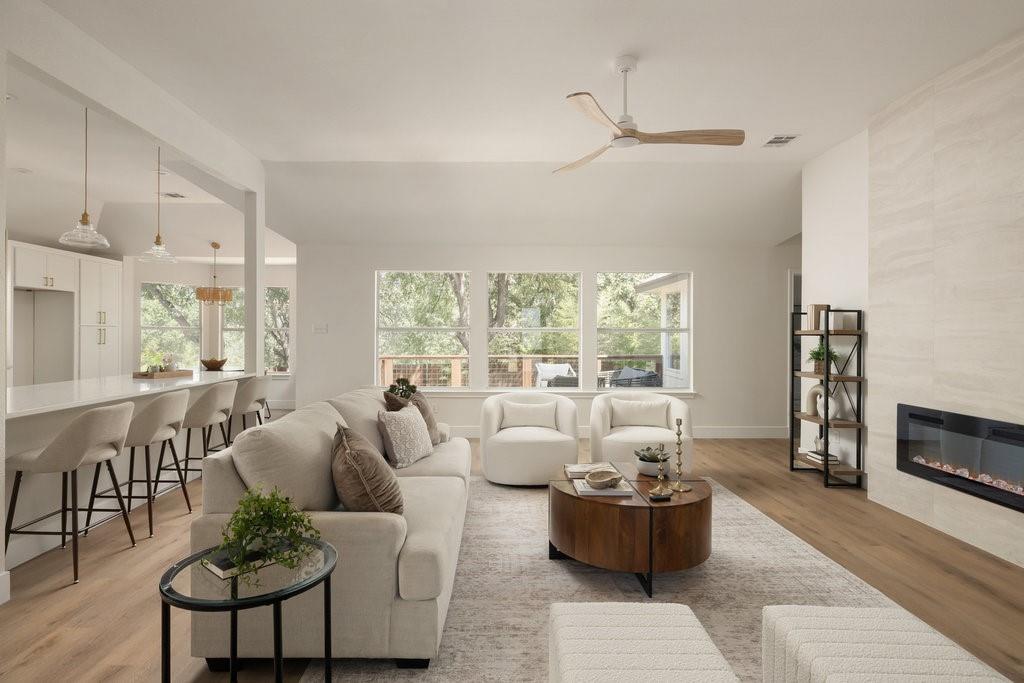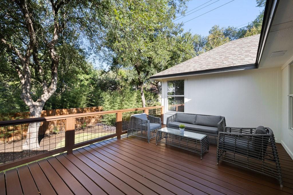 Offer deadline, Monday, November 10th at 7pm. Welcome to your dream home in the highly sought-after Village at Western Oaks, ideally positioned on the greenbelt and just steps from the trailhead. This fully updated residence, flooded with natural light, offers an open floor plan with four spacious bedrooms, two full baths, and a versatile flex space perfectly suited for a home office, dining room, or playroom. Each bedroom features its own walk-in closet, while the centrally located laundry room provides built-in cabinetry and space for an additional refrigerator. The gourmet kitchen is a true centerpiece, showcasing new slim shaker cabinetry, roll-out pantry drawers, quartz countertops, and a brand-new Whirlpool 5-burner gas range with convection and air-fry settings. Flowing effortlessly from the kitchen, the expansive living room is centered around a stunning 72" Dimplex electric fireplace--a statement of warmth and sophistication year round. The primary suite offers a luxurious retreat, complete with a spa-inspired bath featuring a free-standing tub, oversized walk-in shower, with seamless glass and a dual-sink vanity. The secondary bathroom has been fully remodeled as well, with a dual-sink vanity and a designer tile tub surround. Outdoors, relax on the updated deck while enjoying tranquil greenbelt views, complemented by fresh landscaping and the convenience of expansive under-deck storage with easy access. Additional upgrades in 2025 include a 94" front door, backdoor, 6" baseboards, recessed lighting, water heater, HVAC system, exterior hose bibs, main shut-off valve and the roof was replaced in 2018. House pre-inspected as well. All of this is paired with an unbeatable location--just minutes from Mopac, Mills Elementary, Dick Nichols Park, Violet Crown Trail, H-E-B, Alamo Drafthouse, and a wide array of shopping and dining.