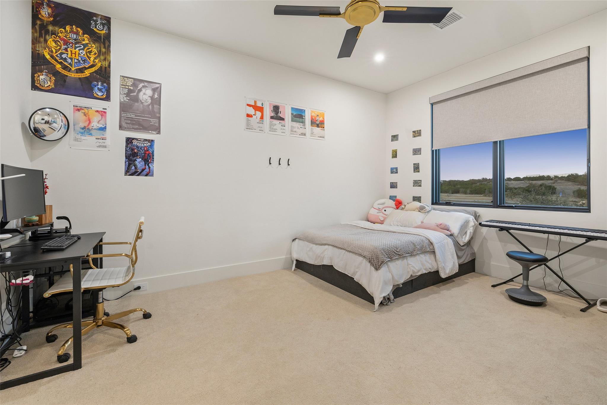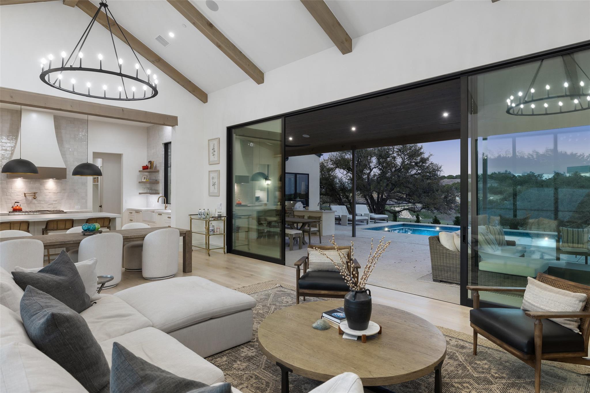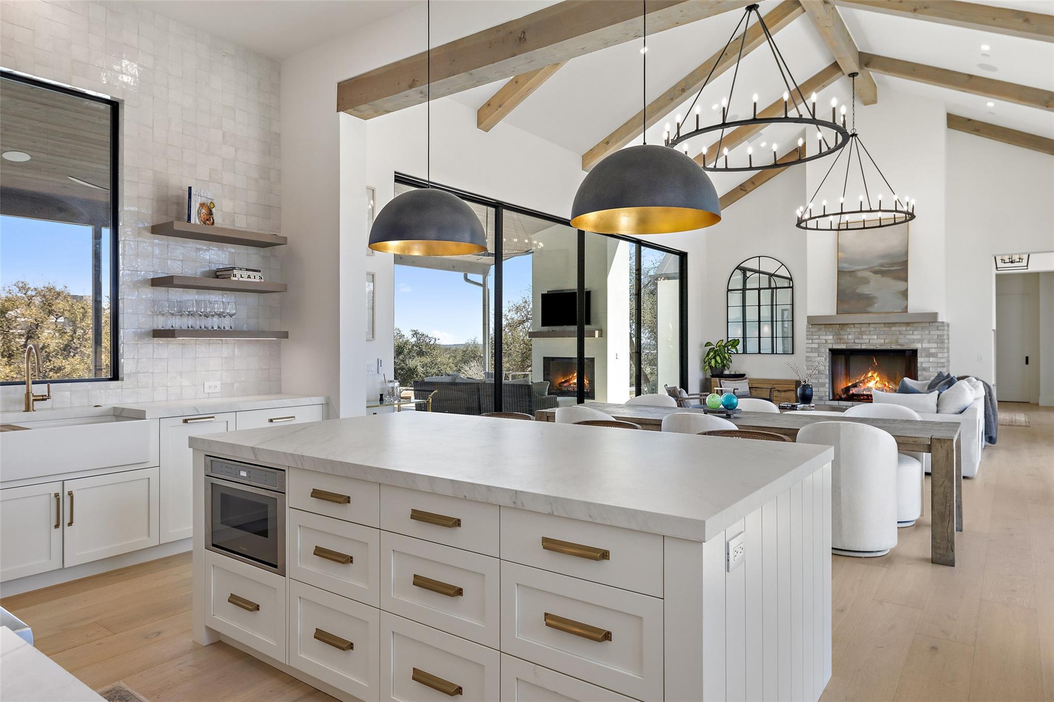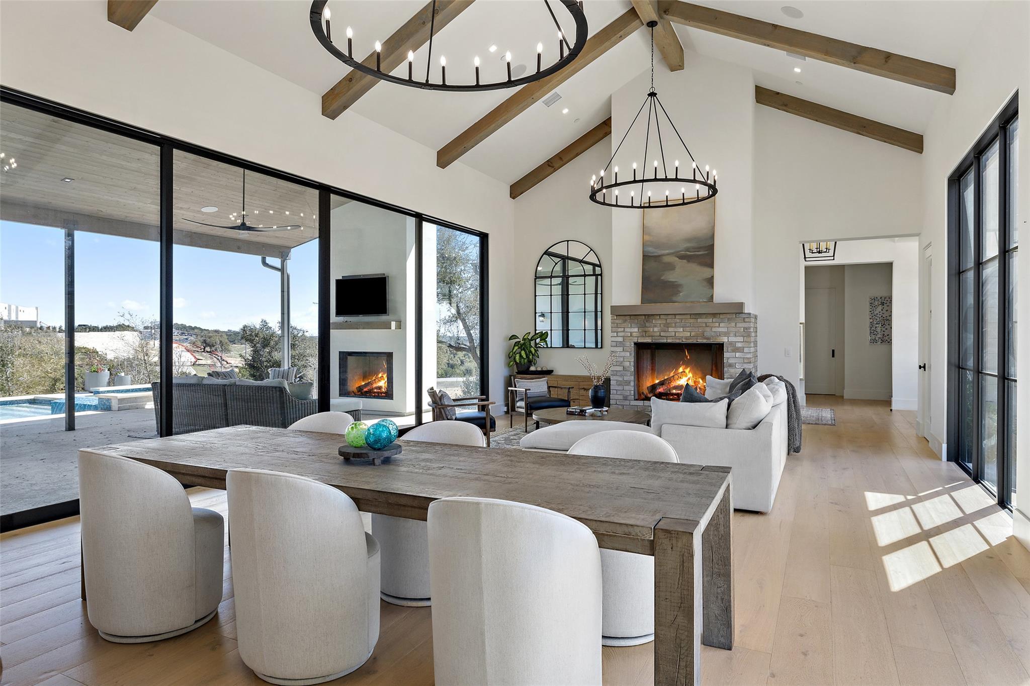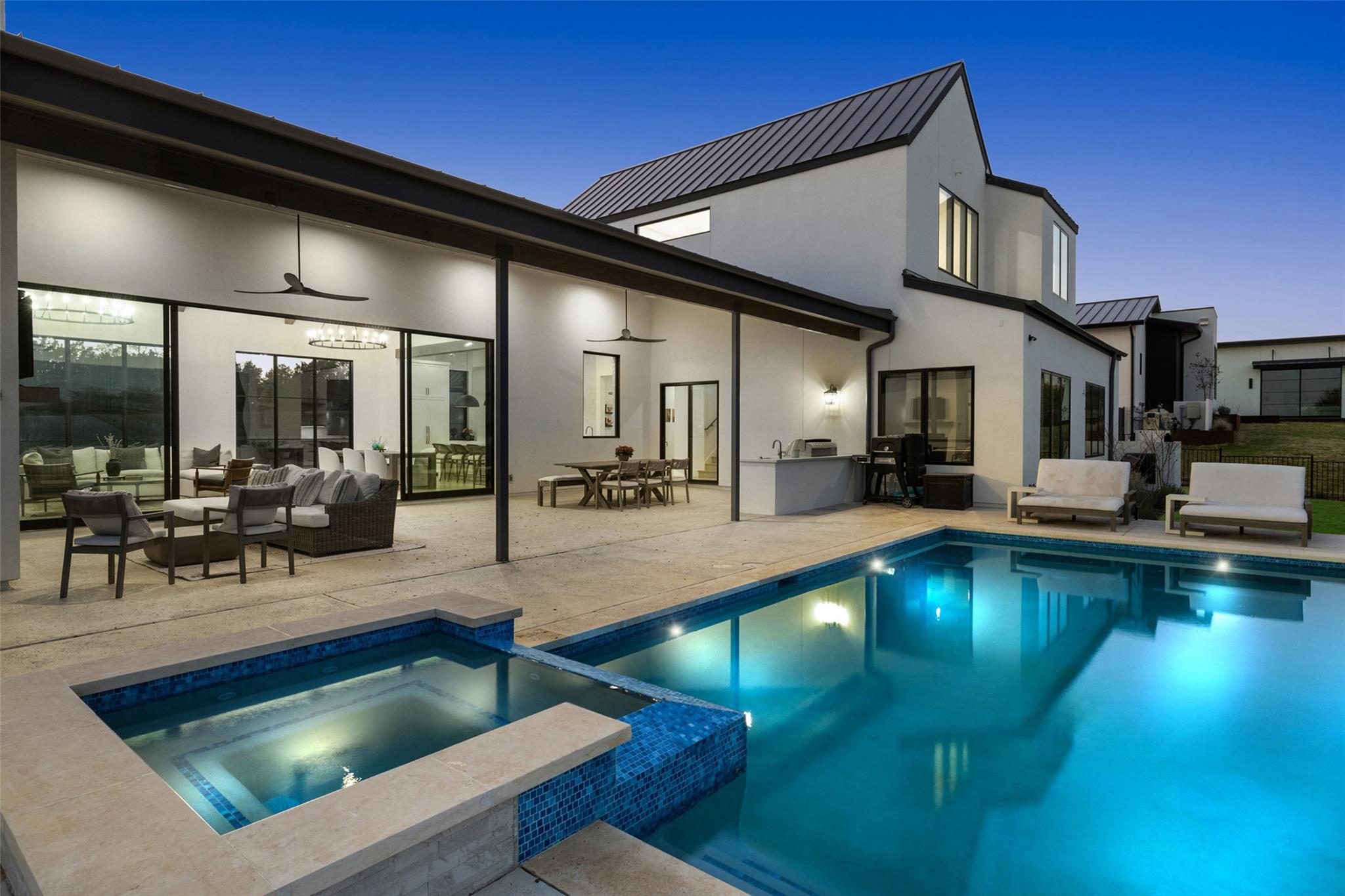 Tucked away in the exclusive gated community of Madrone Canyon, this 4,749-square-foot custom estate by Sendero is a seamless blend of modern luxury and Hill Country charm. Just minutes from the Hill Country Galleria, your new home offers an unparalleled lifestyle. Step inside to soaring arched ceilings adorned with driftwood-style beams, where natural light dances across wide-plank white oak floors. A 24-foot sliding glass wall seamlessly blends indoors and out, inviting fresh breezes inside. The gorgeous double kitchen is a chef's dream, designed for both function and beauty. Gather around the oversized island, flanked by porcelain countertops, Thermador appliances, and three dishwashers designed for effortless entertaining. Purified softened water flows from every faucet providing an abundance of crisp, clear drinking water. The primary suite is a true sanctuary, with a massive indoor/outdoor shower with steam unit - perfect for tranquil mornings or candlelit evenings. A deep soaking tub is perfectly positioned for breathtaking Hill Country views, turning your nightly unwind into a ritual of indulgence. With five bedrooms plus a dedicated office, four and a half baths, and walk-in closets, this home effortlessly balances space and intimacy. A movie theater and upstairs game room provide endless entertainment, while high-end designer touches such as custom wallpaper and tile accents bathrooms lend personality and elegance. Step outside to your fully fenced backyard oasis, where a heated pool and spa sparkle under the Texas sun. Fire up the grill in the outdoor kitchen, sip wine by the pool, or simply listen to the whispering oaks as the day fades to dusk. The paved driveway and oversized three-car garage, with its epoxy flooring and extra storage, welcomes you home with function and style. With its blend of privacy, sophistication, and Hill Country beauty, this estate is more than a home--it's a lifestyle.