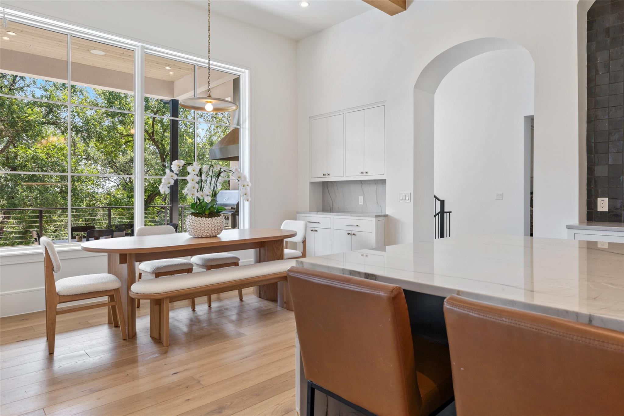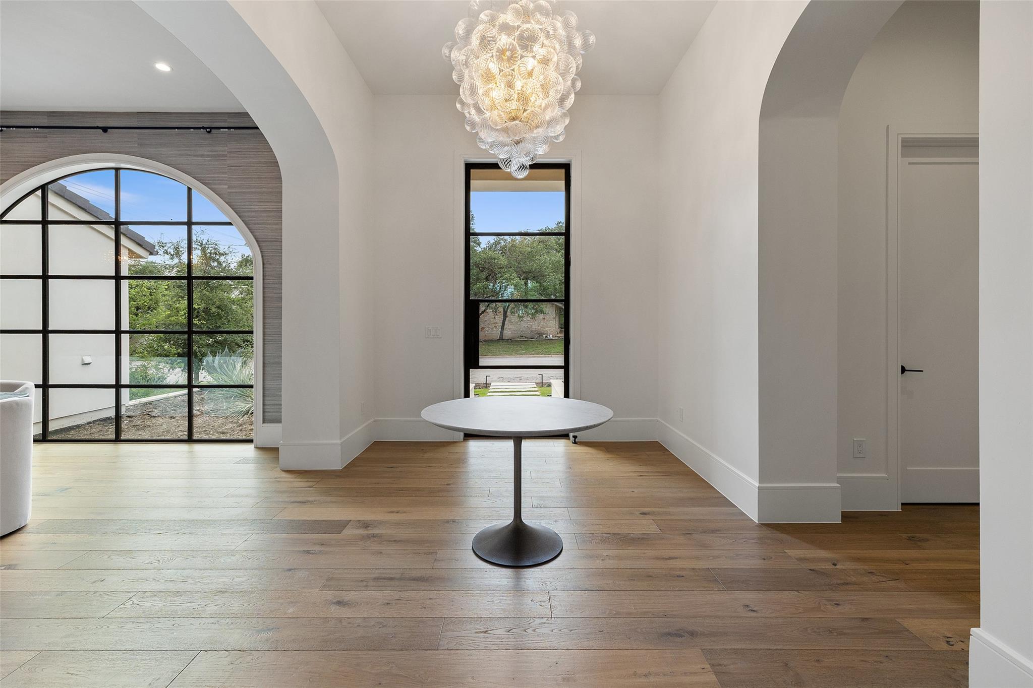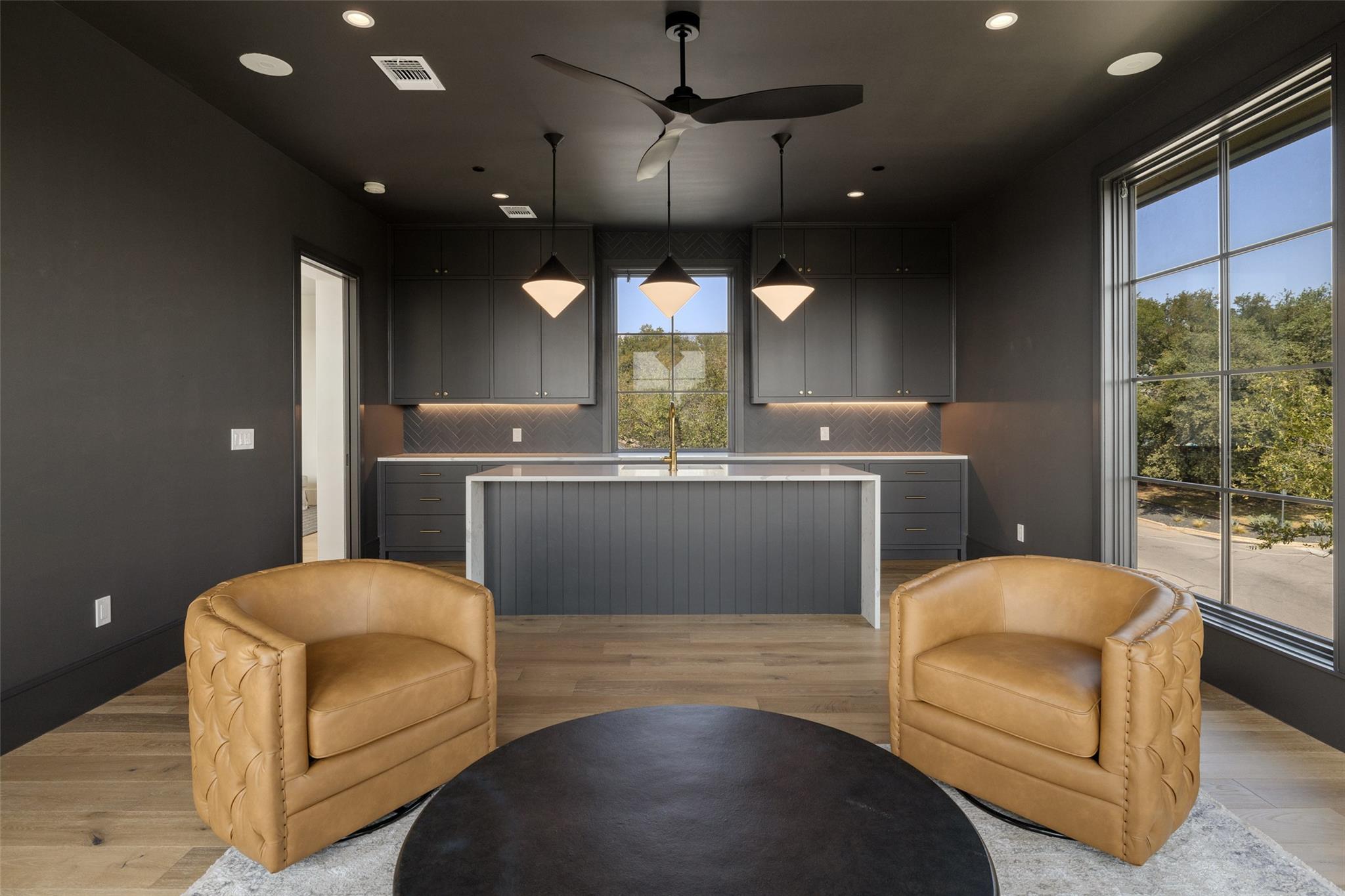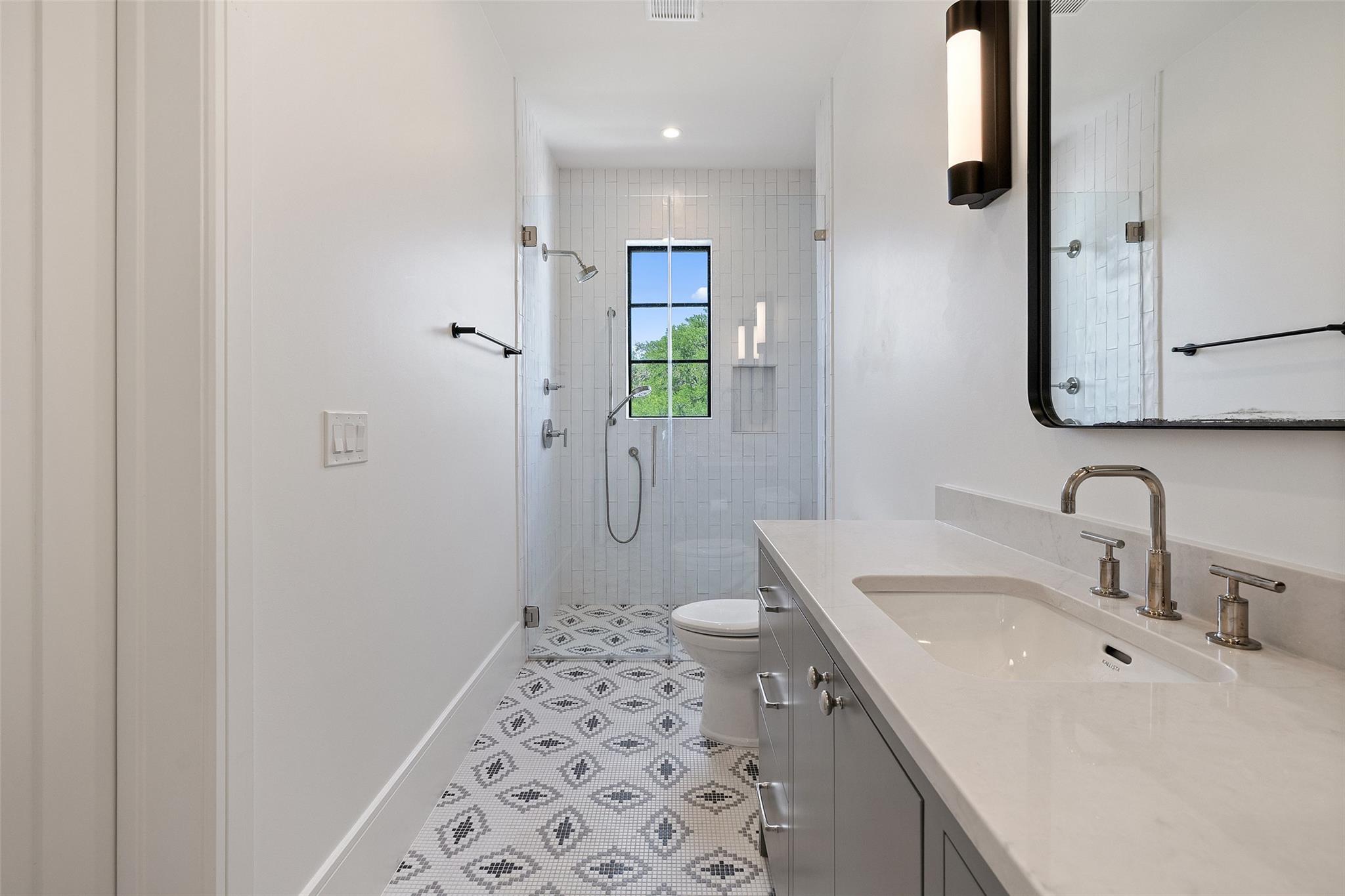 This exceptional home features a thoughtfully designed floor plan with expansive living spaces, wide-plank hardwood floors, beamed ceilings, custom cabinetry, and an abundance of natural light throughout. The main level offers an open-concept living and dining area, formal study, spacious primary suite, and a private guest suite. Upstairs includes three large secondary bedrooms, a generous game room, and a stylish lounge with wet bar--perfect for entertaining. The lower level provides additional flexibility with an oversized bedroom suite and a versatile bonus room ideal for a gym, media room, or casual living. Enjoy two levels of covered outdoor living, a sparkling pool, and sweeping views of the city skyline. Prime location just minutes from downtown and Zilker Park. www.601rileyrd.com