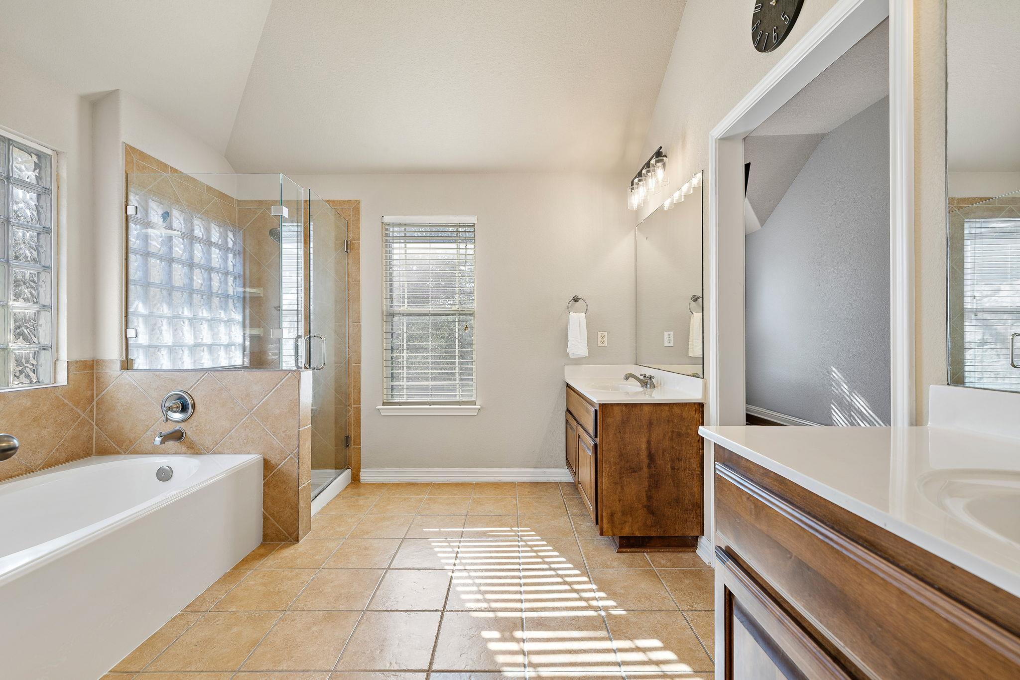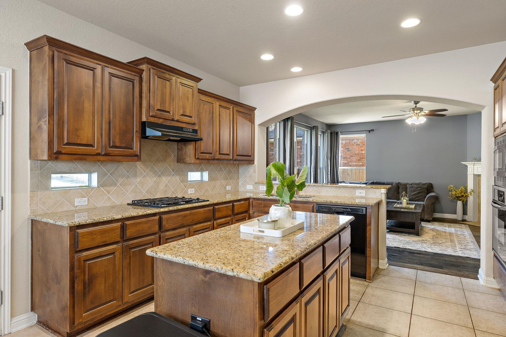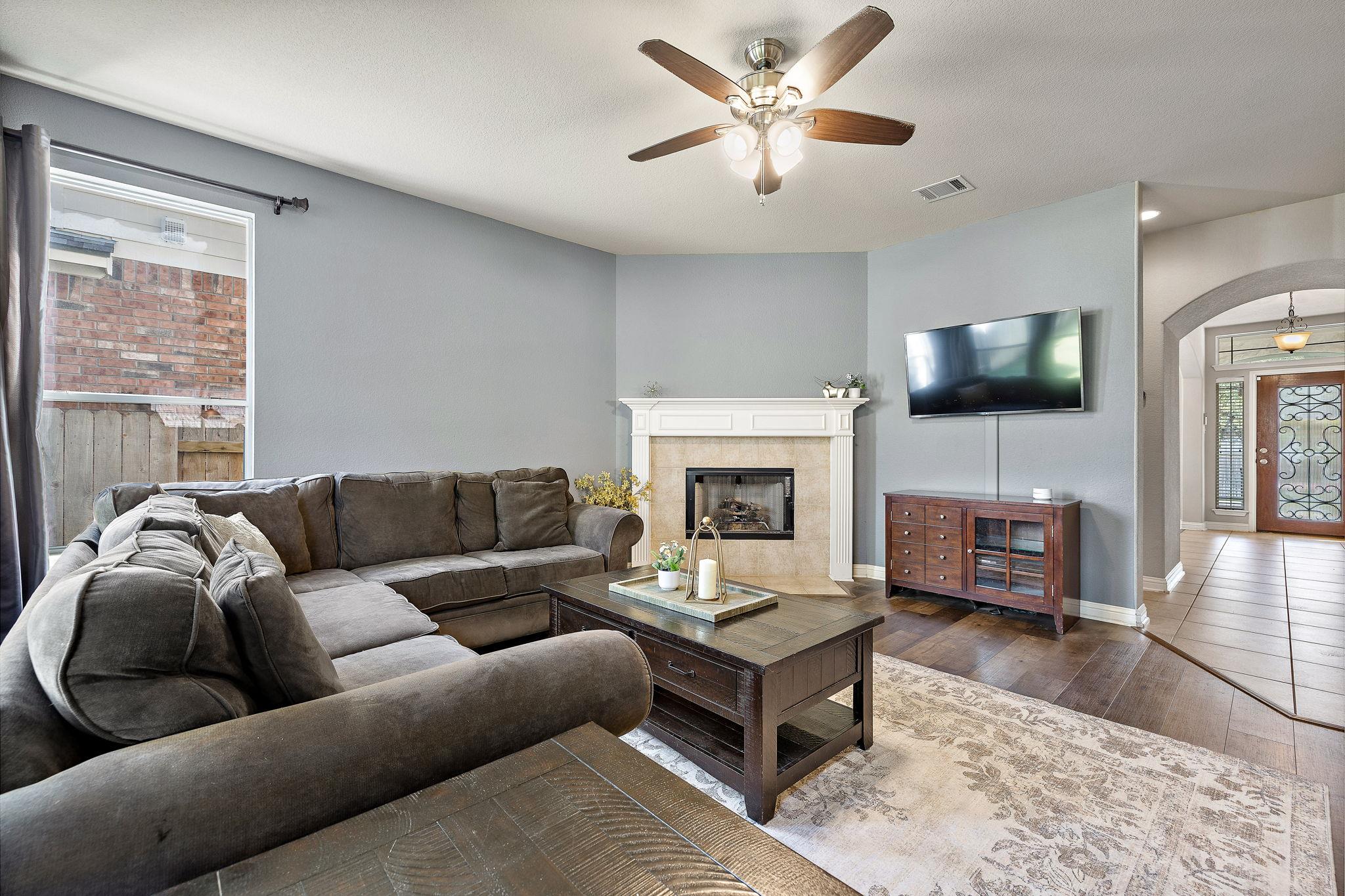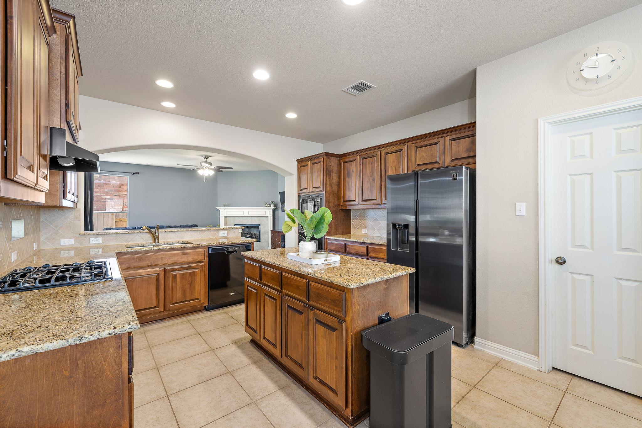 The home features four bedrooms and two and a half bathrooms, with a convenient powder bath downstairs. Architectural details such as arches and recessed niches add character throughout. The kitchen includes built-in appliances, ample cabinet space, and a large island that opens to a bright living room with a fireplace. Upstairs are four spacious bedrooms and a media room. The primary suite includes a flex space suitable for a sitting area or workspace, dual vanities, a walk in shower and soaker tub, along with access to a private balcony. A covered patio downstairs provides additional outdoor space, with a picturesque backyard. The roof was fully replaced in 2023.