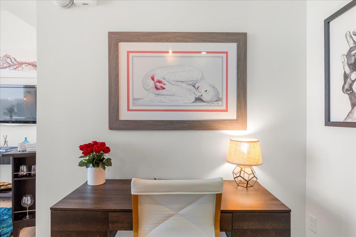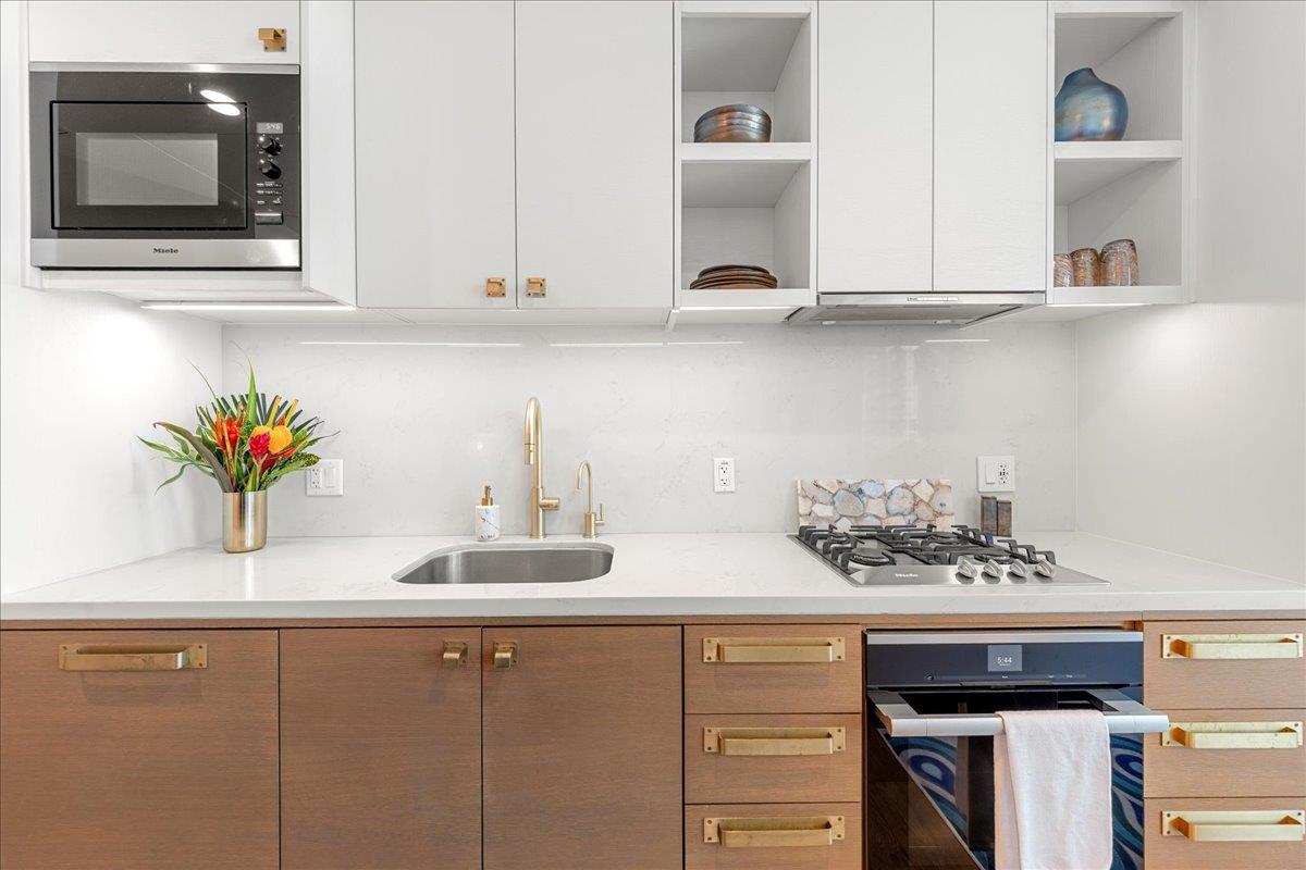 Residence 1503 features a desirable east-facing orientation with floor-to-ceiling windows that fill the home with natural light and showcase views toward East Austin. This one-bedroom, one-bath layout includes wide-plank hardwood flooring, a private balcony, and an open-concept design. The kitchen is outfitted with Miele appliances, quartz countertops, and custom cabinetry, while the bathroom offers a glass walk-in shower and modern finishes.