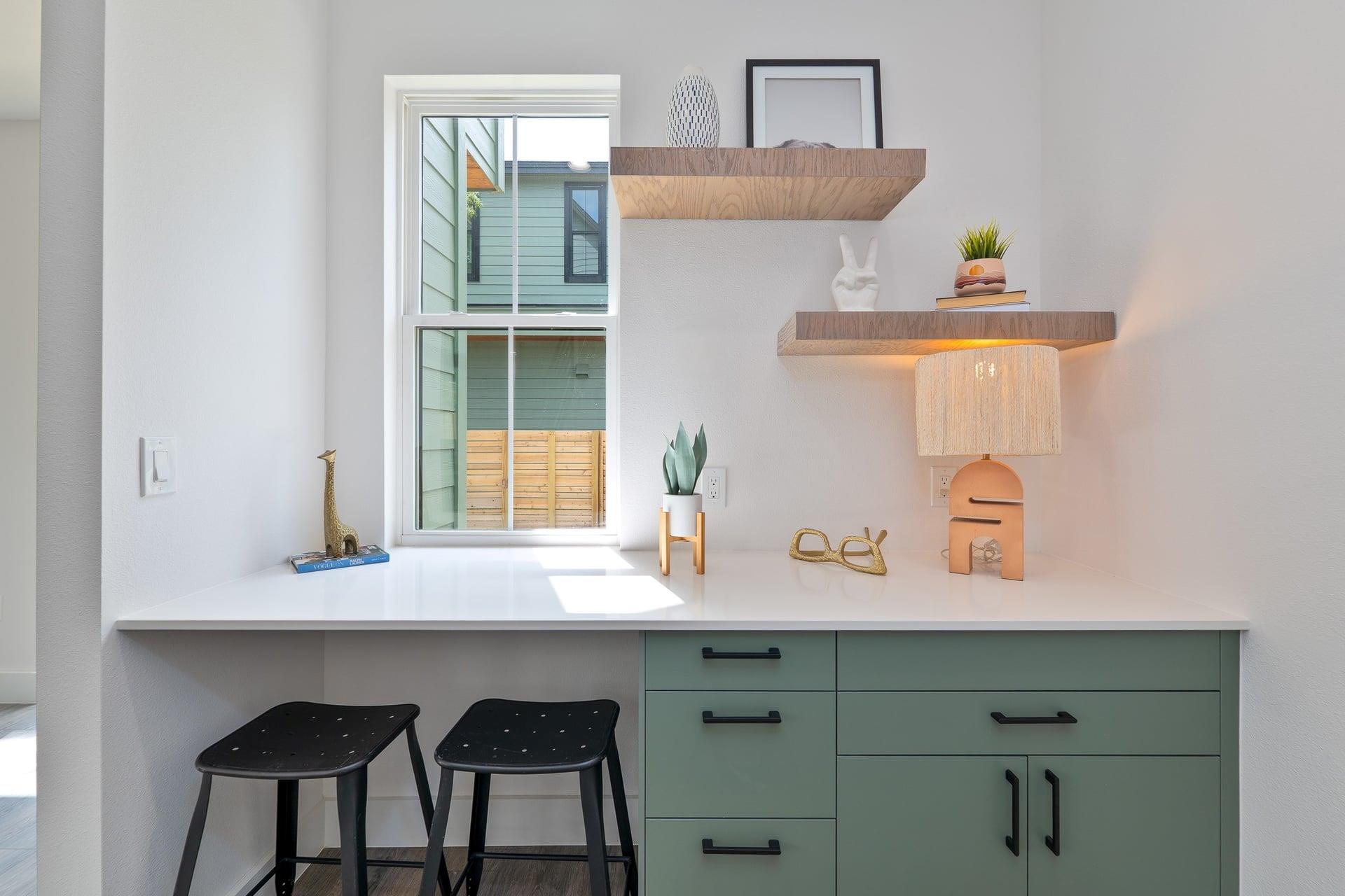 As you step inside, you're welcomed by an open-concept floor plan flooded with natural light thanks to the abundance of large, energy-efficient windows throughout. The main living area boasts high ceilings, luxury vinyl plank flooring, and designer lighting that accentuate the home's clean, contemporary lines. The gourmet kitchen is a true showstopper, featuring quartz countertops, custom cabinetry, a large island with seating, stainless steel appliances, and stylish tile backsplash--perfect for entertaining or everyday living.