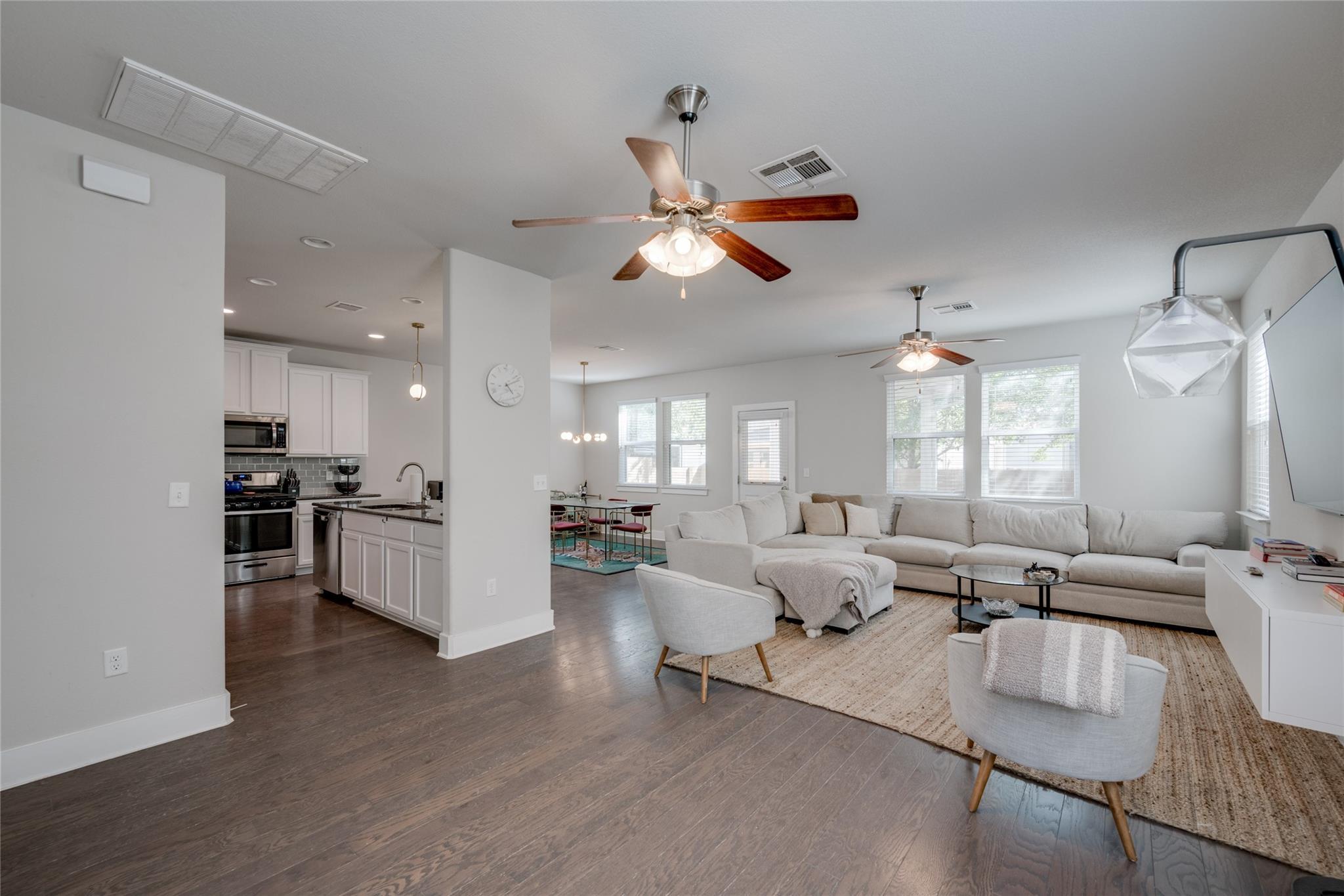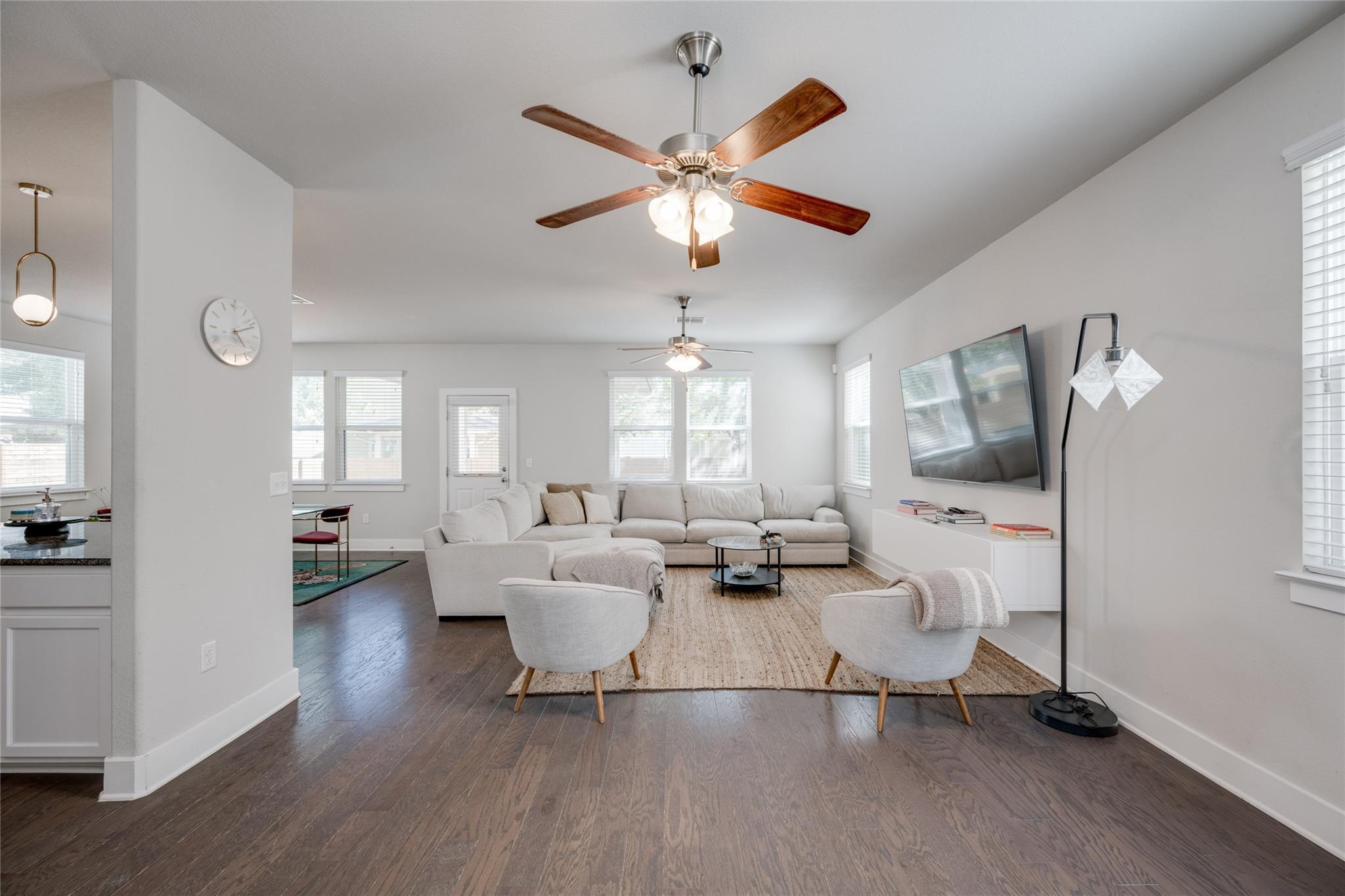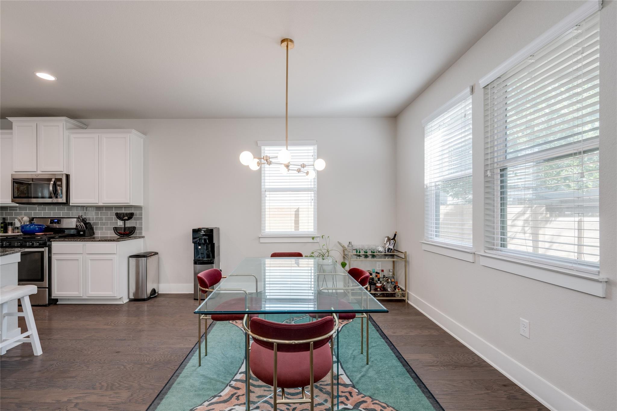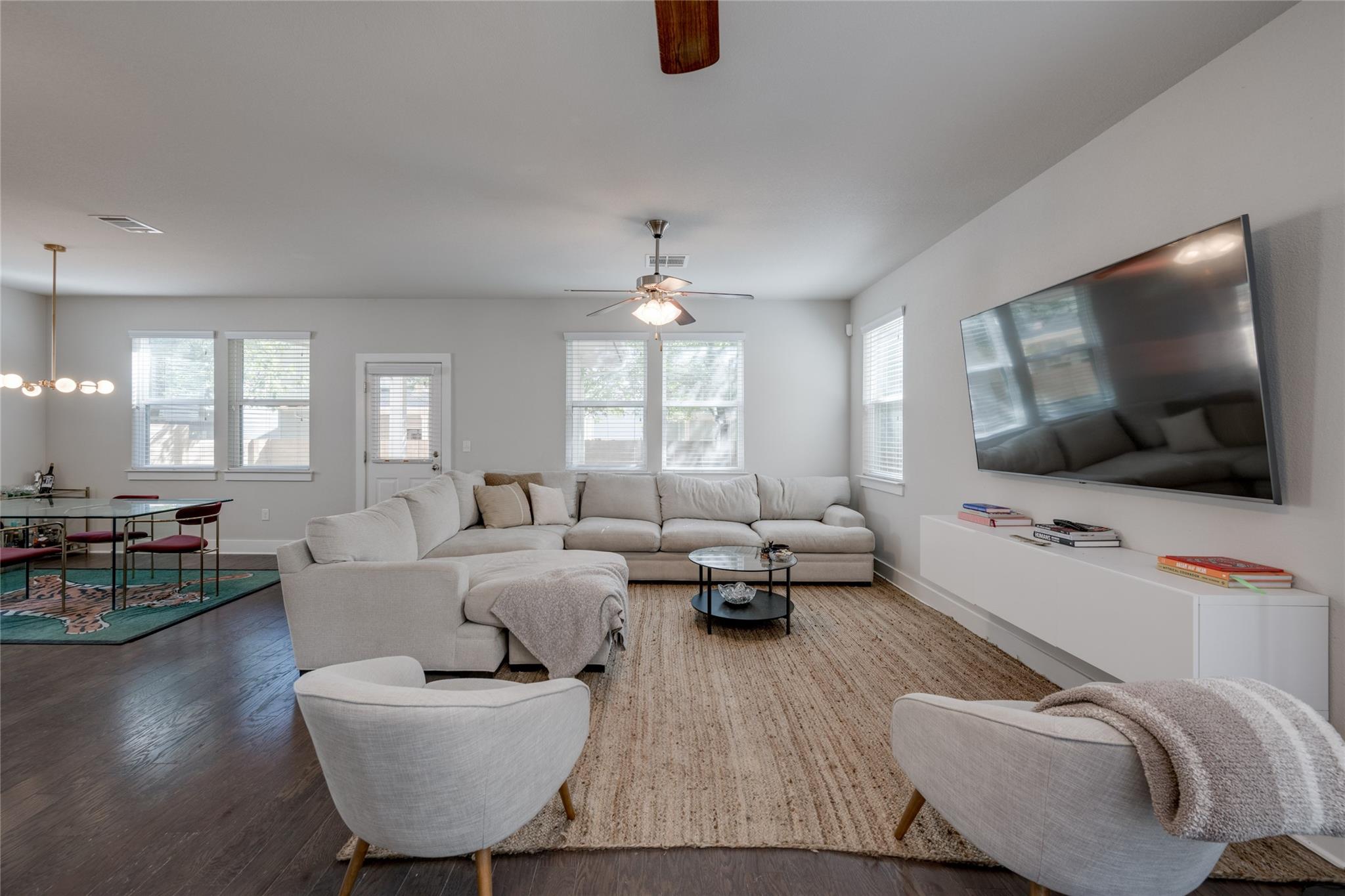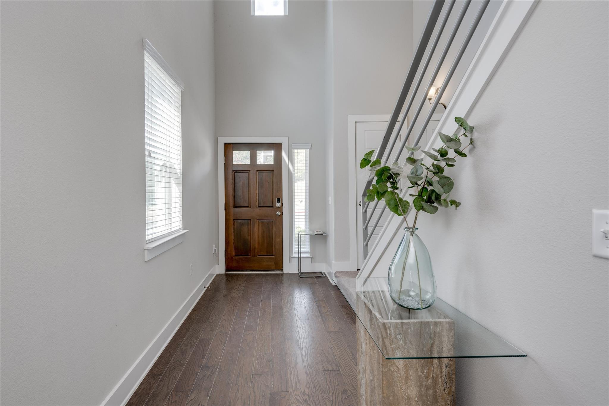 Modern 4 bed, 2.5 bath home in the heart of South Austin, minutes from the Menchaca Rd entertainment district where you'll find hotspots like Armadillo Den, Lustre Pearl South, and South Austin Beer Garden. Stepping through the front door, soaring ceilings greet you in the foyer. With wood floors, modern fixtures, and an abundance of natural light the main living area offers a warm and inviting ambiance while the open floor plan is perfect for entertaining. The spacious kitchen is equipped with a large center island, granite countertops, and stainless steel appliances. Extending the living space outside, the backyard features a covered patio perfect for al fresco dining or relaxing on a cool evening. Upstairs, a second living space makes a great game or media room or a private space for your morning Pelaton ride. The primary suite is a private retreat featuring an ensuite bath with a double vanity and walk-in shower while the three additional bedrooms are generously sized and share a bathroom with ample counter and cabinet space. Lawn maintenance is covered by the HOA for an easy lock & leave lifestyle.
