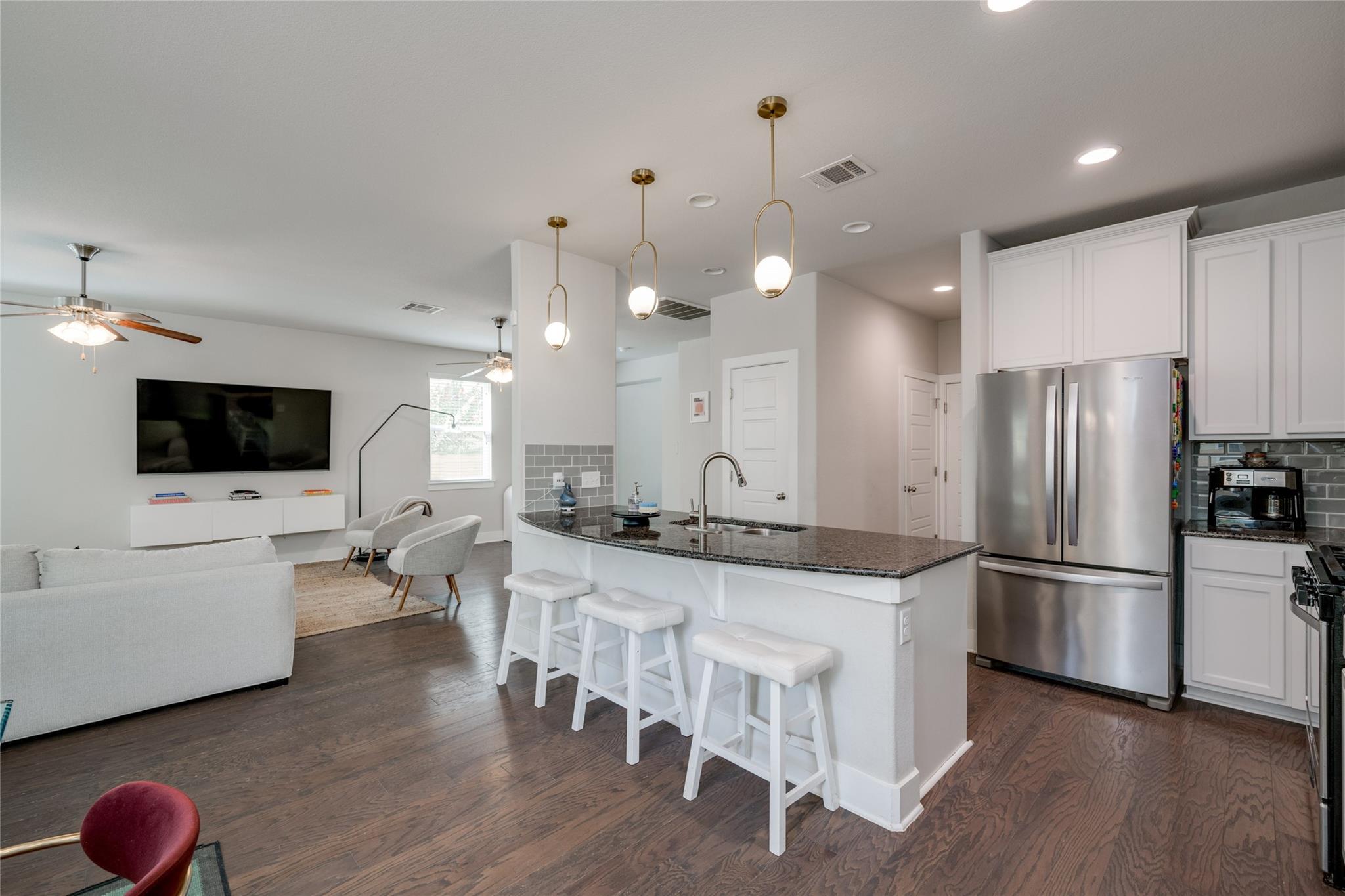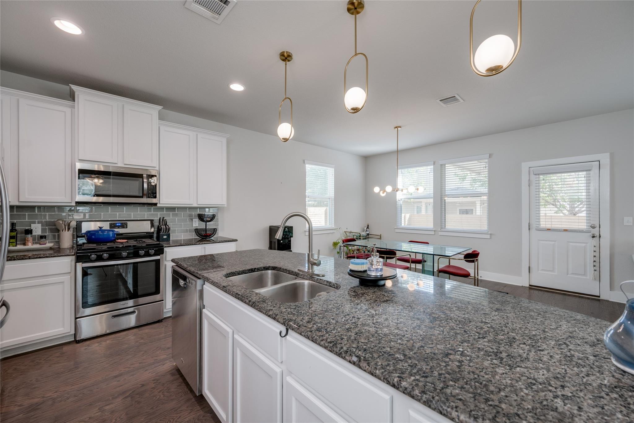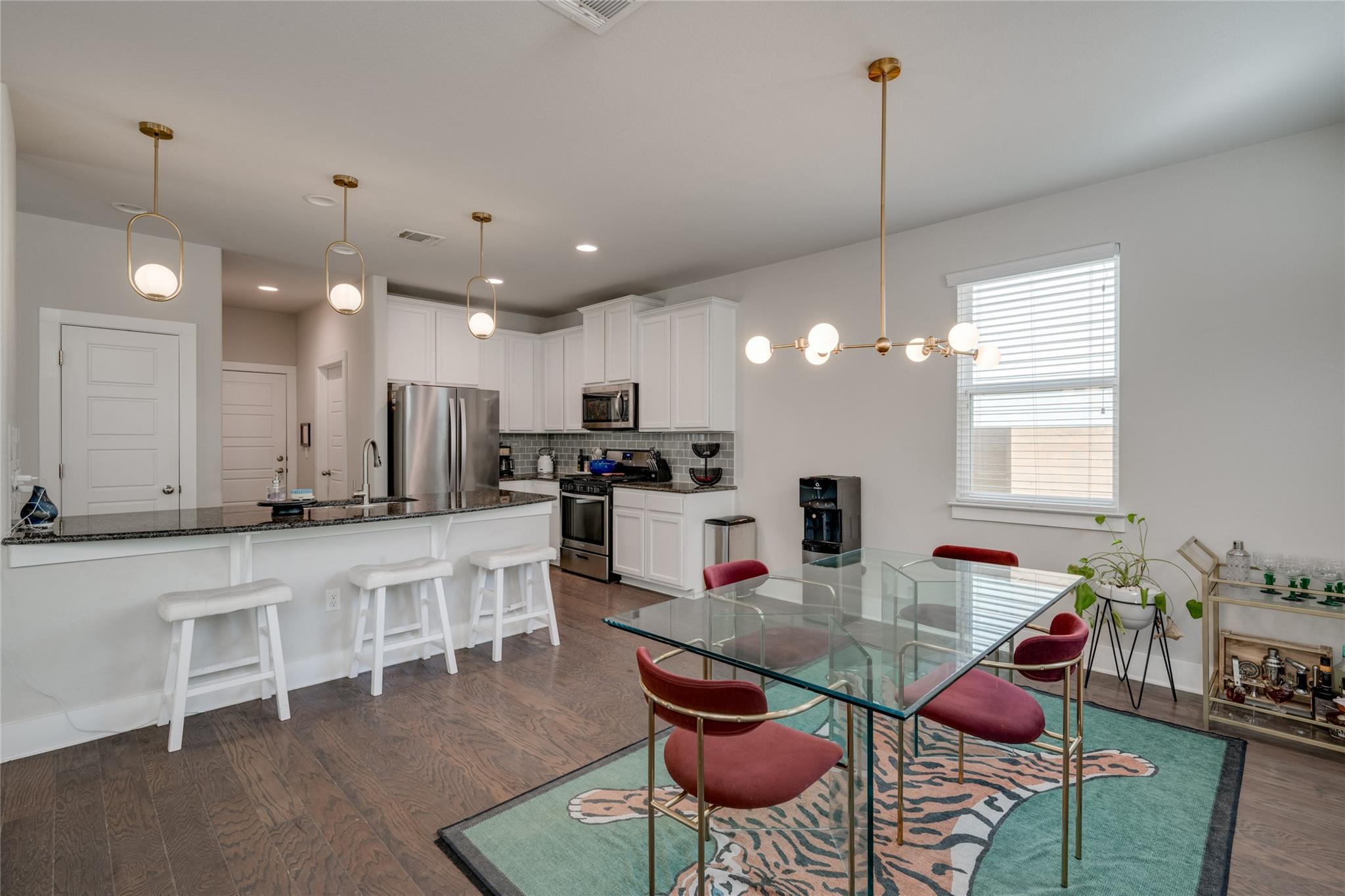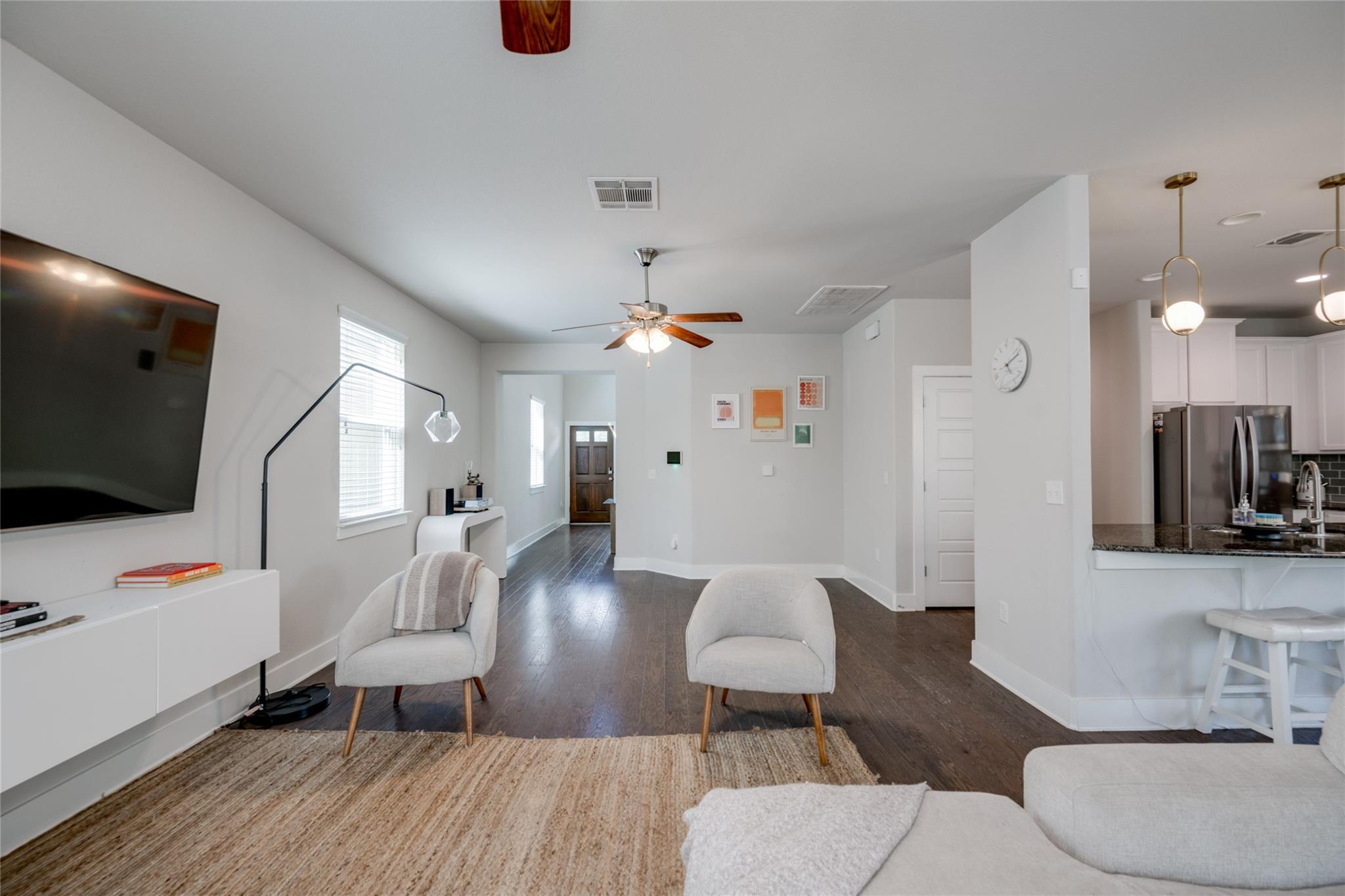 Modern 4 bed, 2.5 bath home in the heart of South Austin, minutes from the Menchaca Rd entertainment district where you'll find hotspots like Armadillo Den, Lustre Pearl South, and South Austin Beer Garden. Stepping through the front door, soaring ceilings greet you in the foyer. With wood floors, modern fixtures, and an abundance of natural light the main living area offers a warm and inviting ambiance while the open floor plan is perfect for entertaining. The spacious kitchen is equipped with a large center island, granite countertops, and stainless steel appliances. Extending the living space outside, the backyard features a covered patio perfect for al fresco dining or relaxing on a cool evening. Upstairs, a second living space makes a great game or media room or a private space for your morning Pelaton ride. The primary suite is a private retreat featuring an ensuite bath with a double vanity and walk-in shower while the three additional bedrooms are generously sized and share a bathroom with ample counter and cabinet space. Lawn maintenance is covered by the HOA for an easy lock & leave lifestyle.