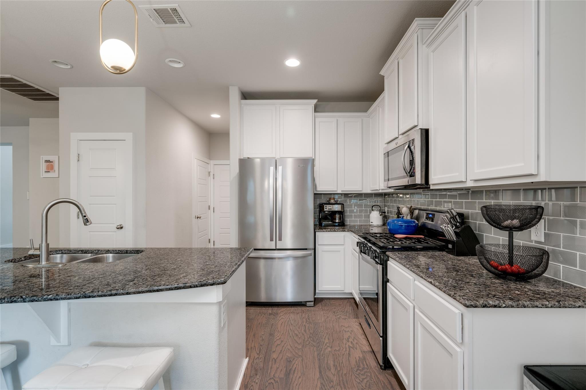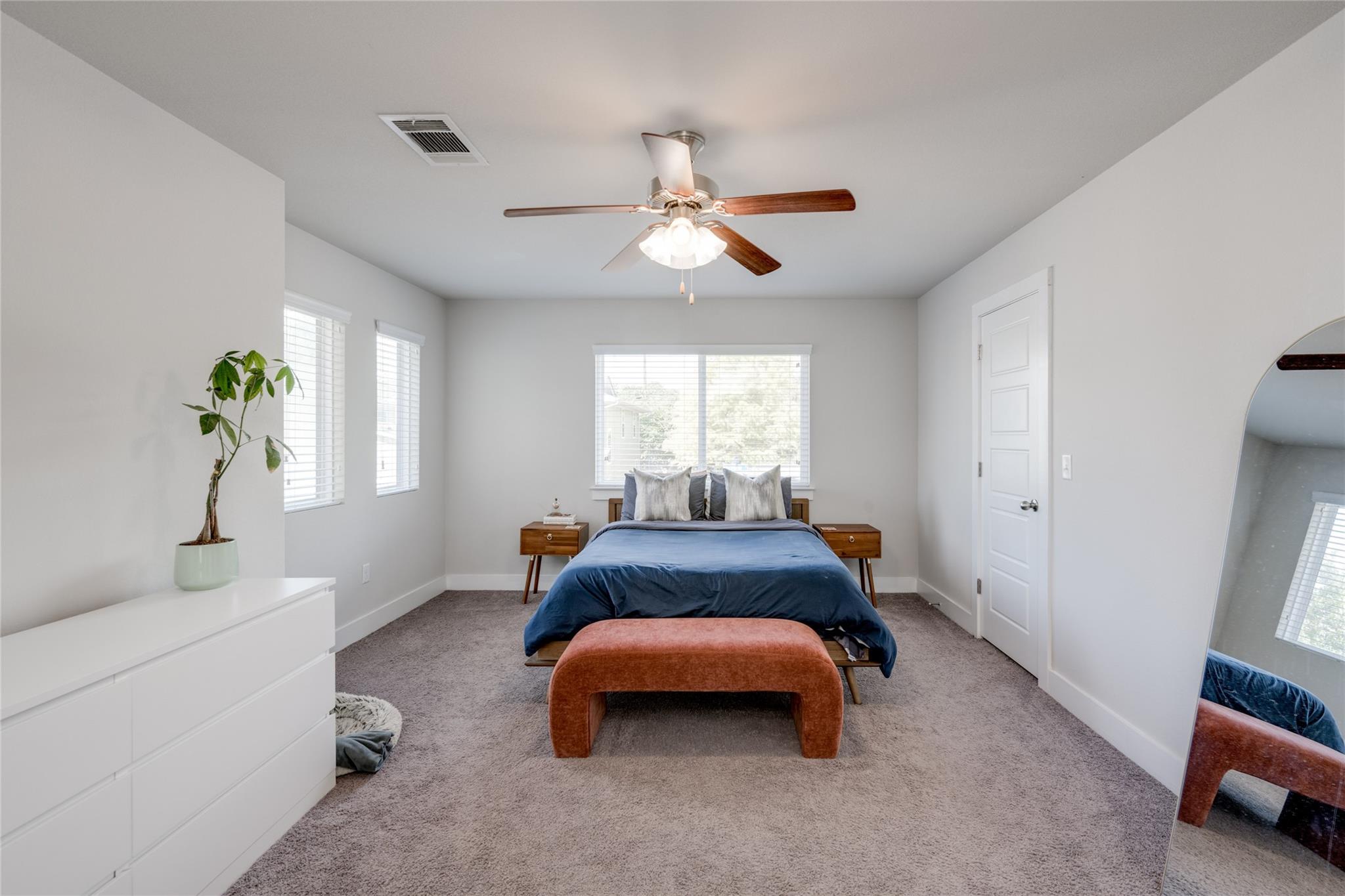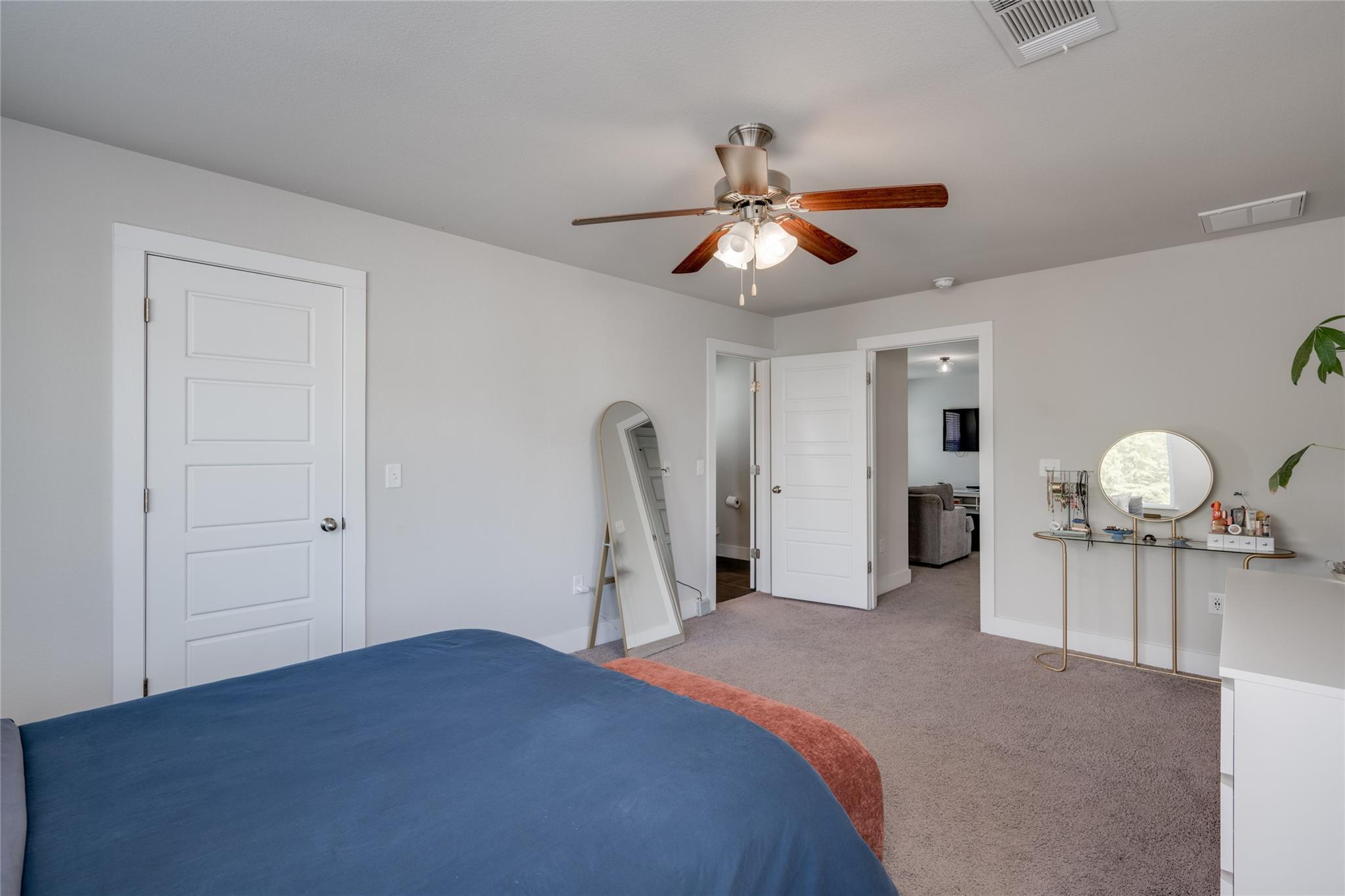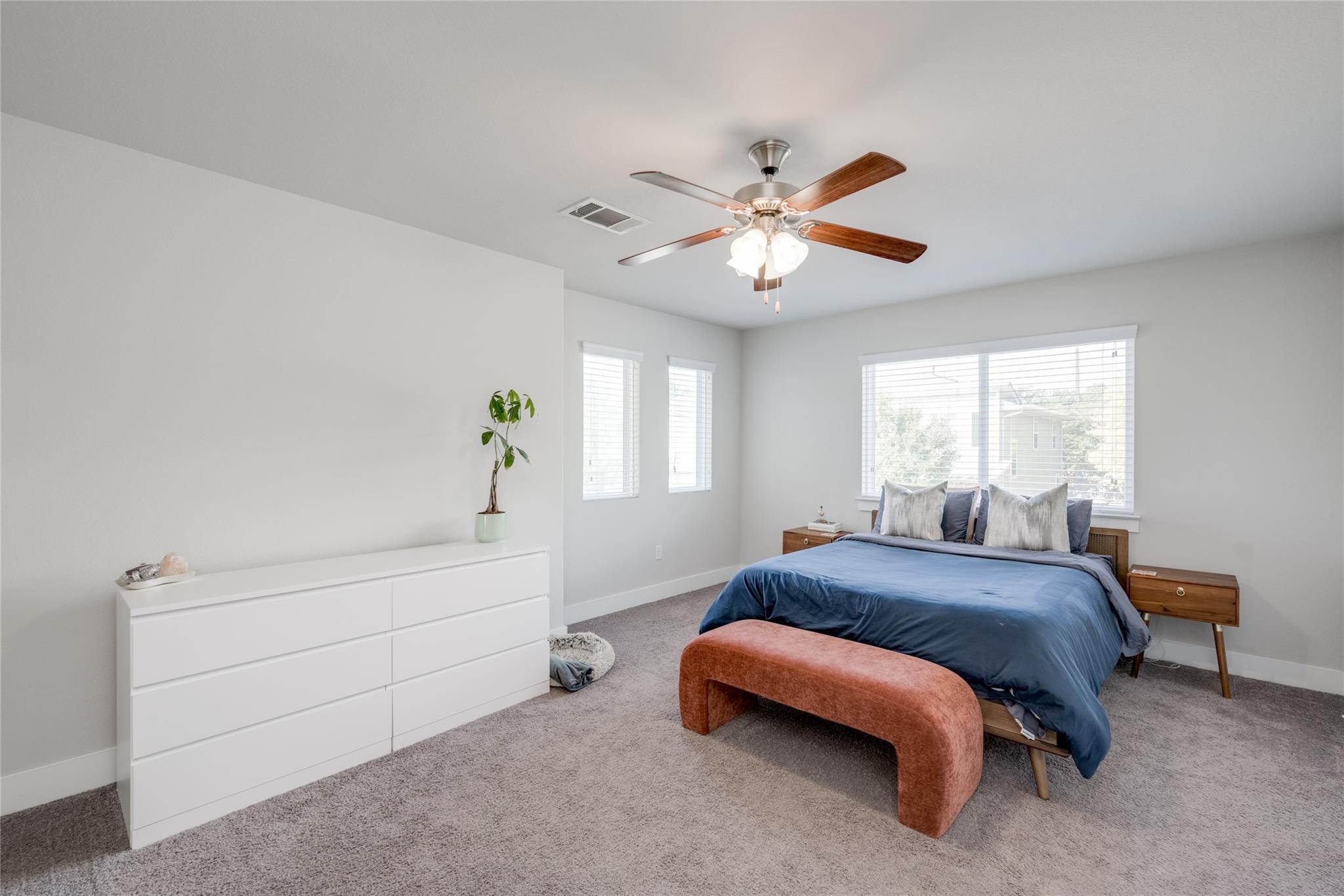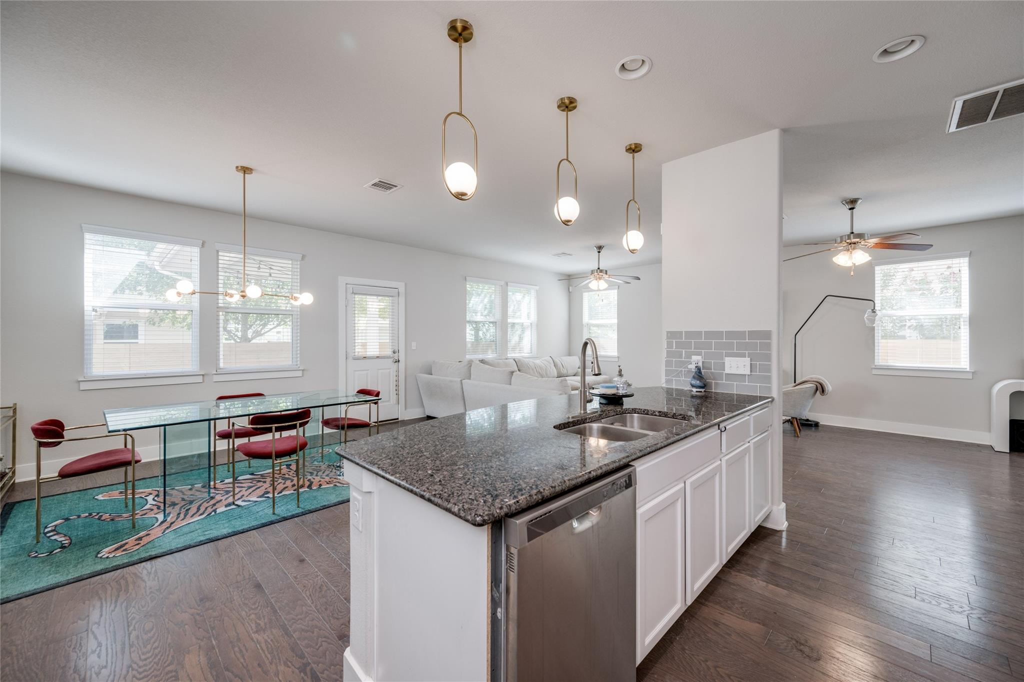 Modern 4 bed, 2.5 bath home in the heart of South Austin, minutes from the Menchaca Rd entertainment district where you'll find hotspots like Armadillo Den, Lustre Pearl South, and South Austin Beer Garden. Stepping through the front door, soaring ceilings greet you in the foyer. With wood floors, modern fixtures, and an abundance of natural light the main living area offers a warm and inviting ambiance while the open floor plan is perfect for entertaining. The spacious kitchen is equipped with a large center island, granite countertops, and stainless steel appliances. Extending the living space outside, the backyard features a covered patio perfect for al fresco dining or relaxing on a cool evening. Upstairs, a second living space makes a great game or media room or a private space for your morning Pelaton ride. The primary suite is a private retreat featuring an ensuite bath with a double vanity and walk-in shower while the three additional bedrooms are generously sized and share a bathroom with ample counter and cabinet space. Lawn maintenance is covered by the HOA for an easy lock & leave lifestyle.
