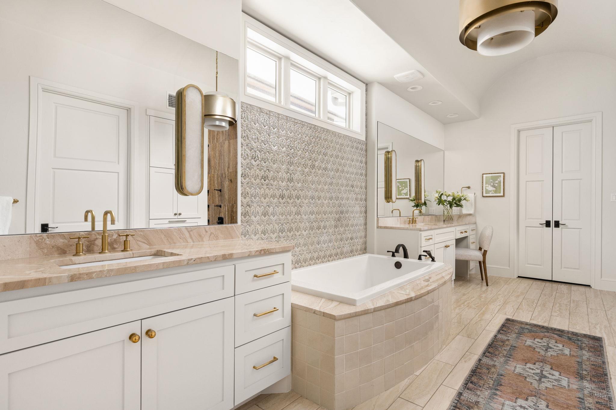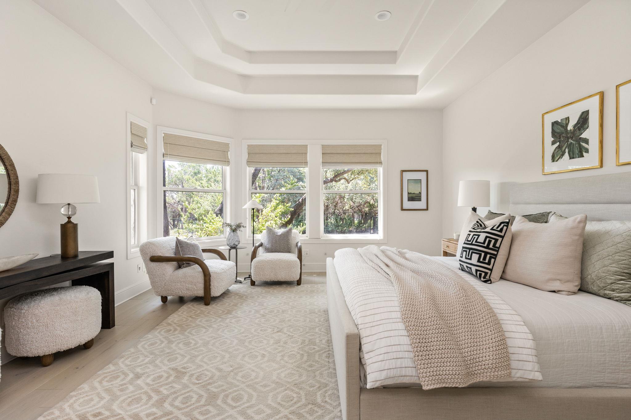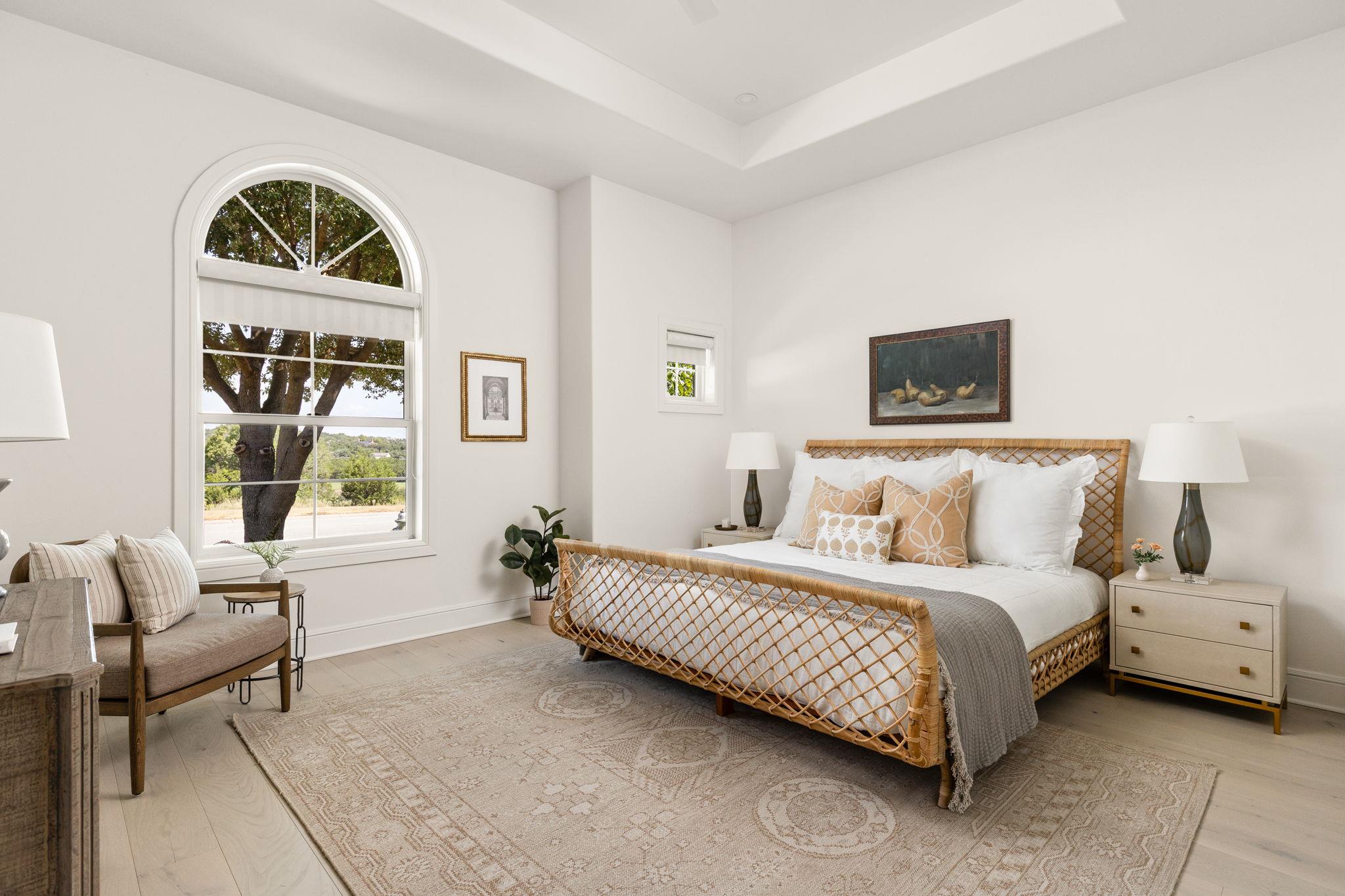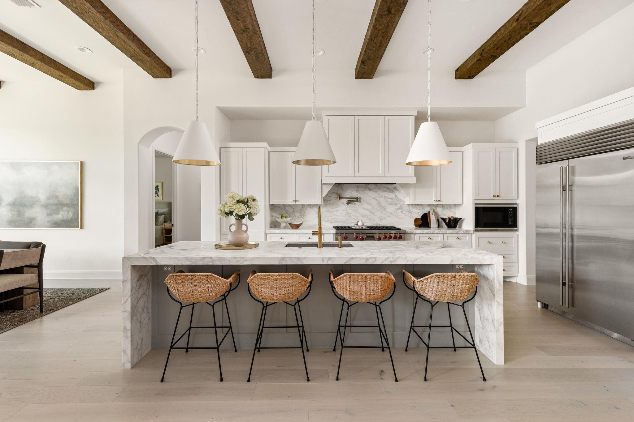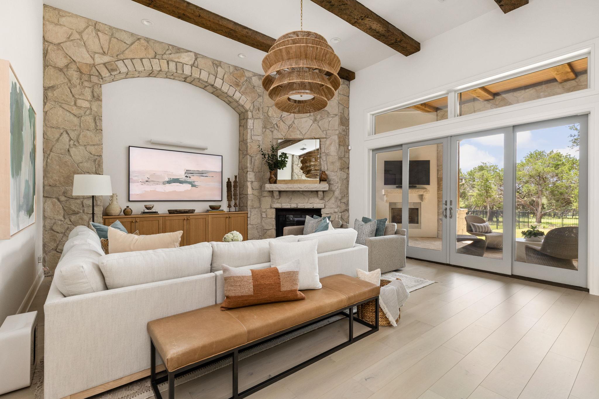 Tucked within the private gates of The Canyons section of Amarra in Barton Creek, this single-story residence offers privacy, elegance, and effortless Hill Country living. With sweeping views of the Fazio Canyons Golf Course, the home combines classic architecture with thoughtfully selected modern features. Designed for both comfort and entertaining, it offers three spacious bedrooms, each with an en suite bath, along with a dedicated office and powder room. At the heart of the home, a striking marble waterfall island anchors the kitchen. Professional-grade Wolf and Sub-Zero appliances, custom cabinetry, and a full-height marble backsplash create a space that is both functional and visually impressive. Brass fixtures and stylish pendant lighting add warmth and character, while wide-plank wood floors carry a sense of continuity into the surrounding living areas. The open living space is framed by soaring ceilings with exposed beams and a dramatic stone archway, leading to a wall of glass doors that fill the interior with natural light and open to the outdoor patio. Ideal for relaxing or entertaining, the covered patio includes a fireplace, built-in BBQ, and room for dining alfresco. The primary suite enjoys a private setting and features a spa-like bath with dual closets, a walk-in shower, and a soaking tub. The two-car garage and gated location provide security and ease, while the home's access to Barton Creek's club amenities and proximity to downtown Austin complete the offering. This is a rare opportunity to own a meticulously maintained home in one of Austin's most sought-after golf course communities.